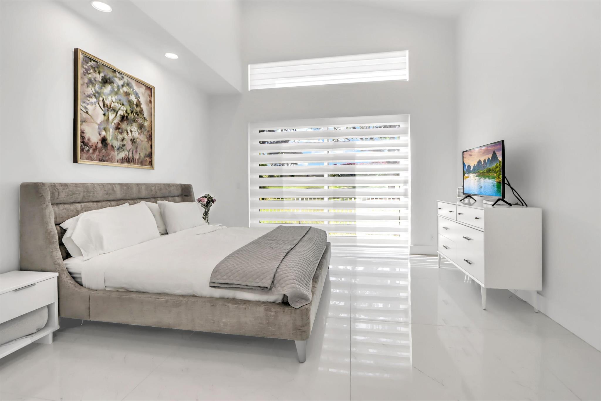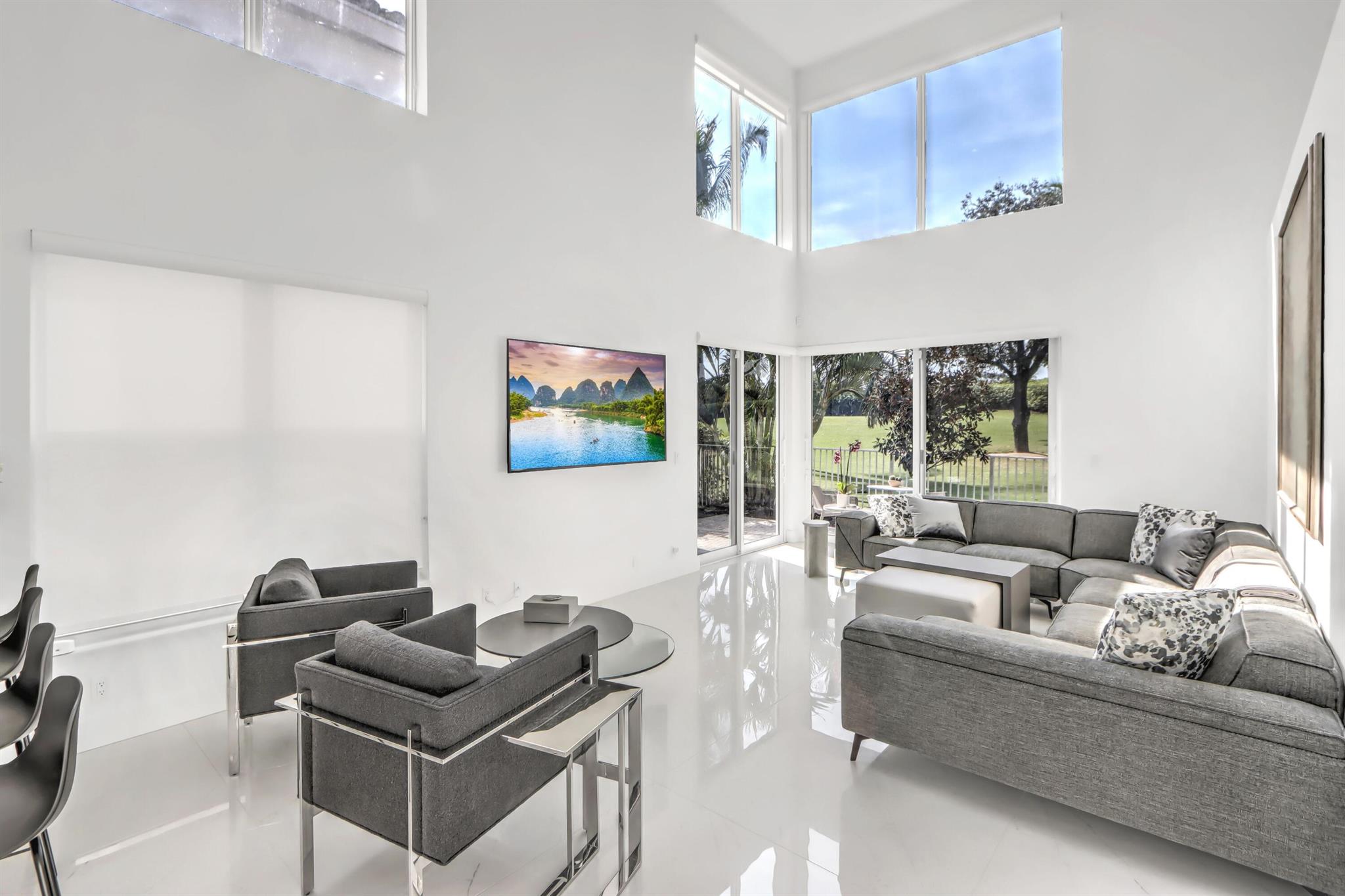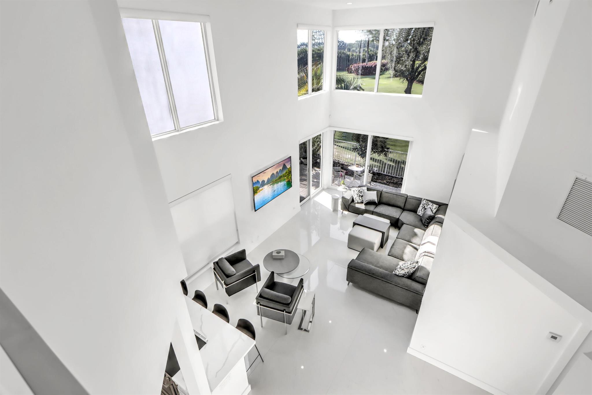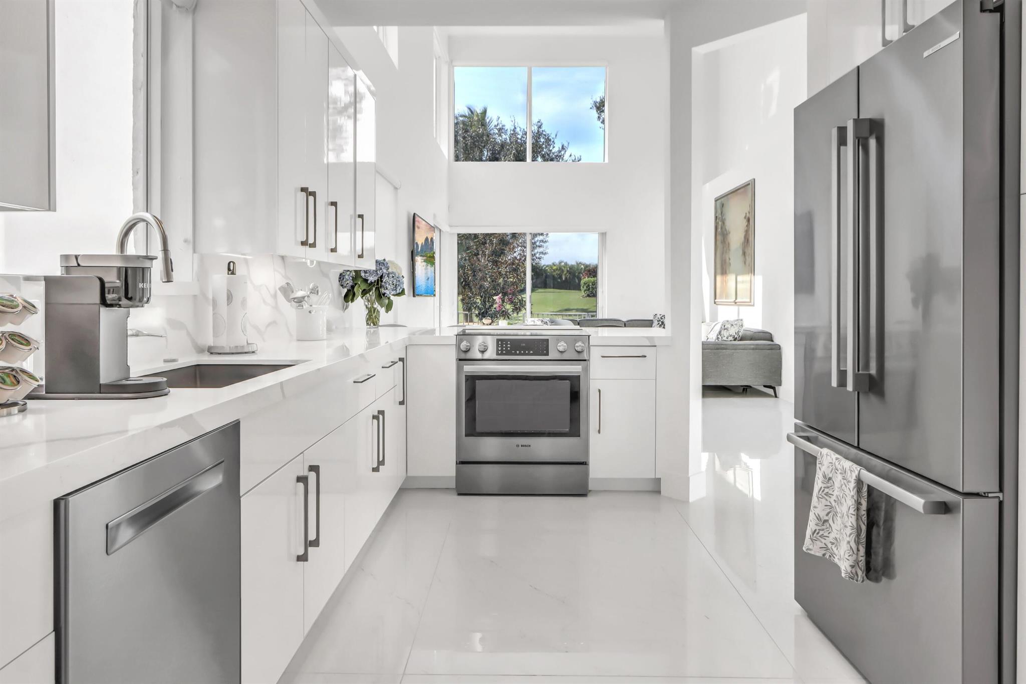 Enjoy the ease of moving into a home with tranquil golf course views remodeled in top of the line finishes. A long driveway leads to this lovely 2-story home of 4 Bedrooms & 3 1/2 Baths - light, bright & renovated with contemporary flair. Features include volume ceilings with LED lighting; white flat-finish walls;48X48 porcelain tile floors; custom solid core doors of modern design; custom window shades;custom closets & a dramatic modern metal cable/rod railing up the stairs. The inviting island kitchen offers white 42'' high-gloss cabinets,quartz countertops & backsplash, stainless steel Bosch appliances & a charming breakfast nook. Completely renovated bathrooms;3rd full bath added in 2024. 2024: New roof, impact windows & doors, garage doors; 2025: New gutters. Furnished or Unfurnished.