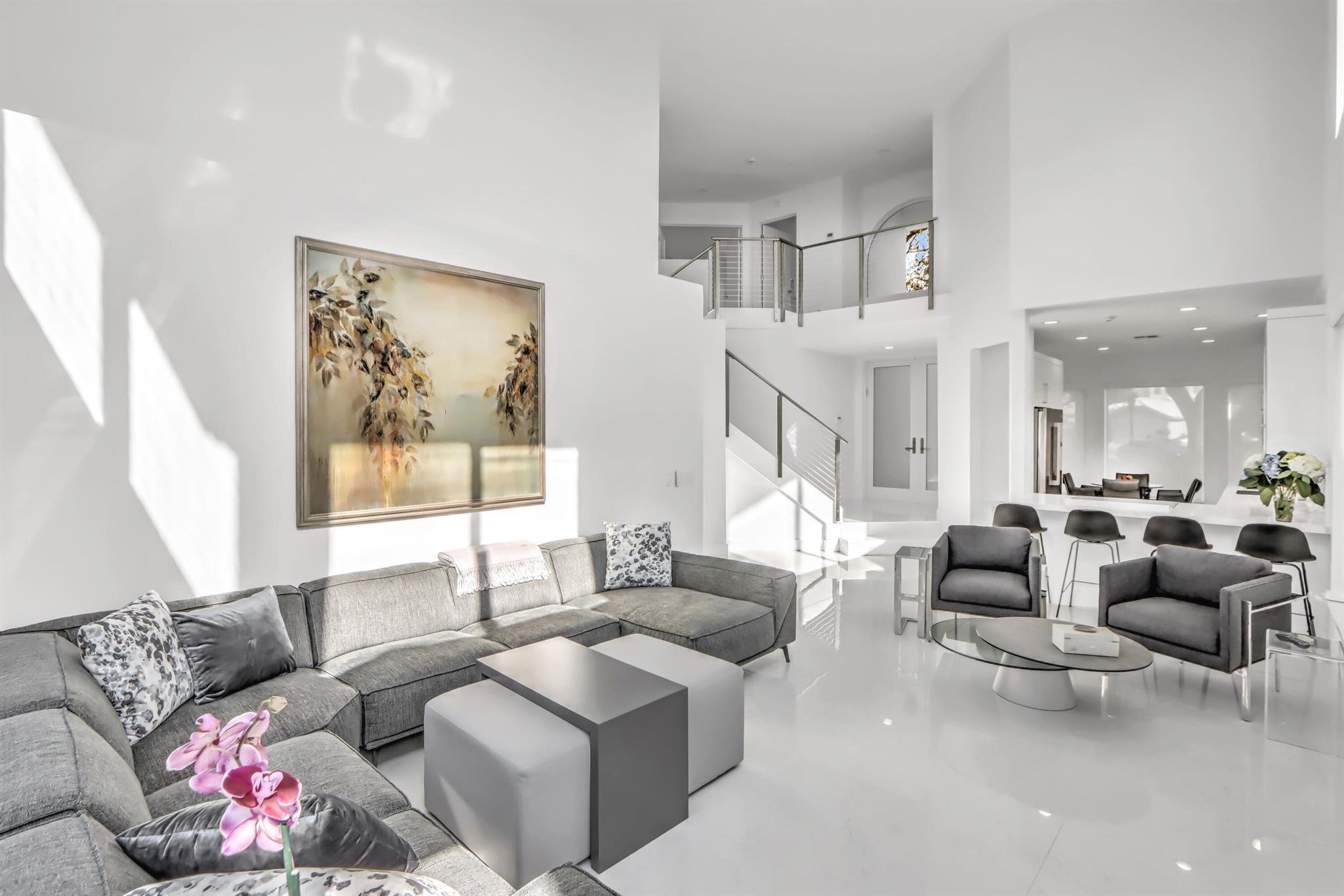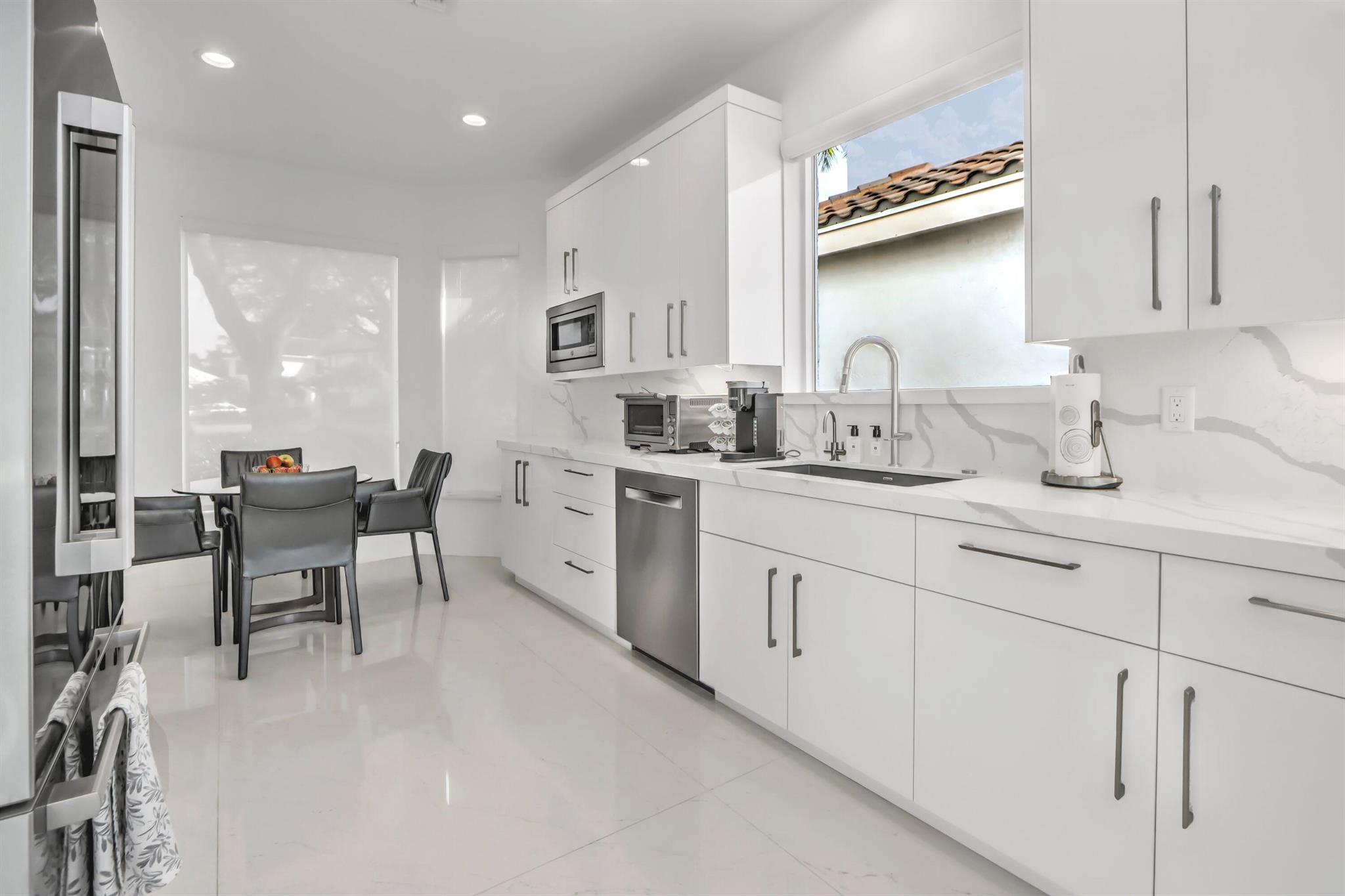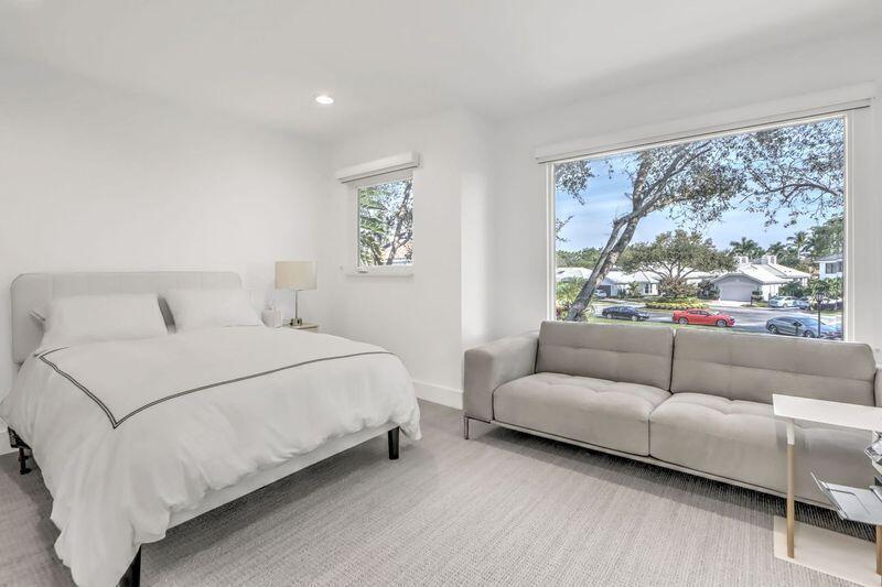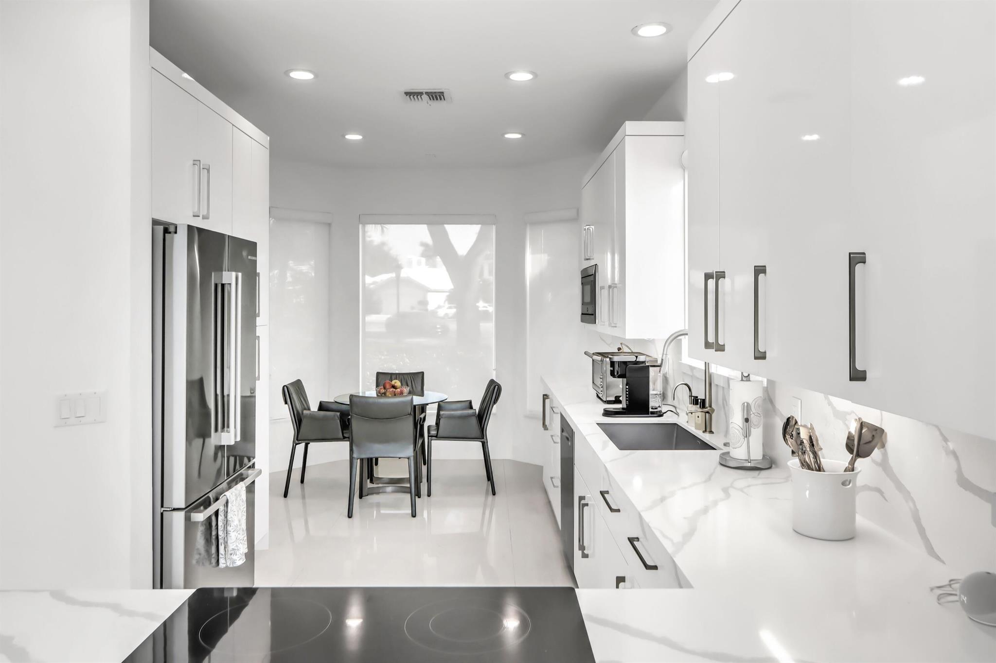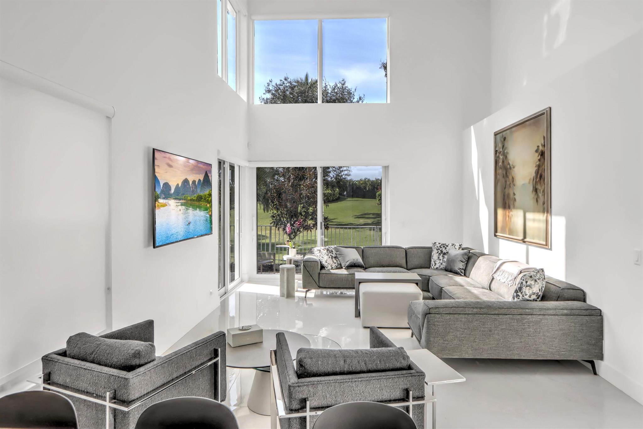 Enjoy the ease of moving into a home with tranquil golf course views remodeled in top of the line finishes. A long driveway leads to this lovely 2-story home of 4 Bedrooms & 3 1/2 Baths - light, bright & renovated with contemporary flair. Features include volume ceilings with LED lighting; white flat-finish walls;48X48 porcelain tile floors; custom solid core doors of modern design; custom window shades;custom closets & a dramatic modern metal cable/rod railing up the stairs. The inviting island kitchen offers white 42'' high-gloss cabinets,quartz countertops & backsplash, stainless steel Bosch appliances & a charming breakfast nook. Completely renovated bathrooms;3rd full bath added in 2024. 2024: New roof, impact windows & doors, garage doors; 2025: New gutters. Furnished or Unfurnished.