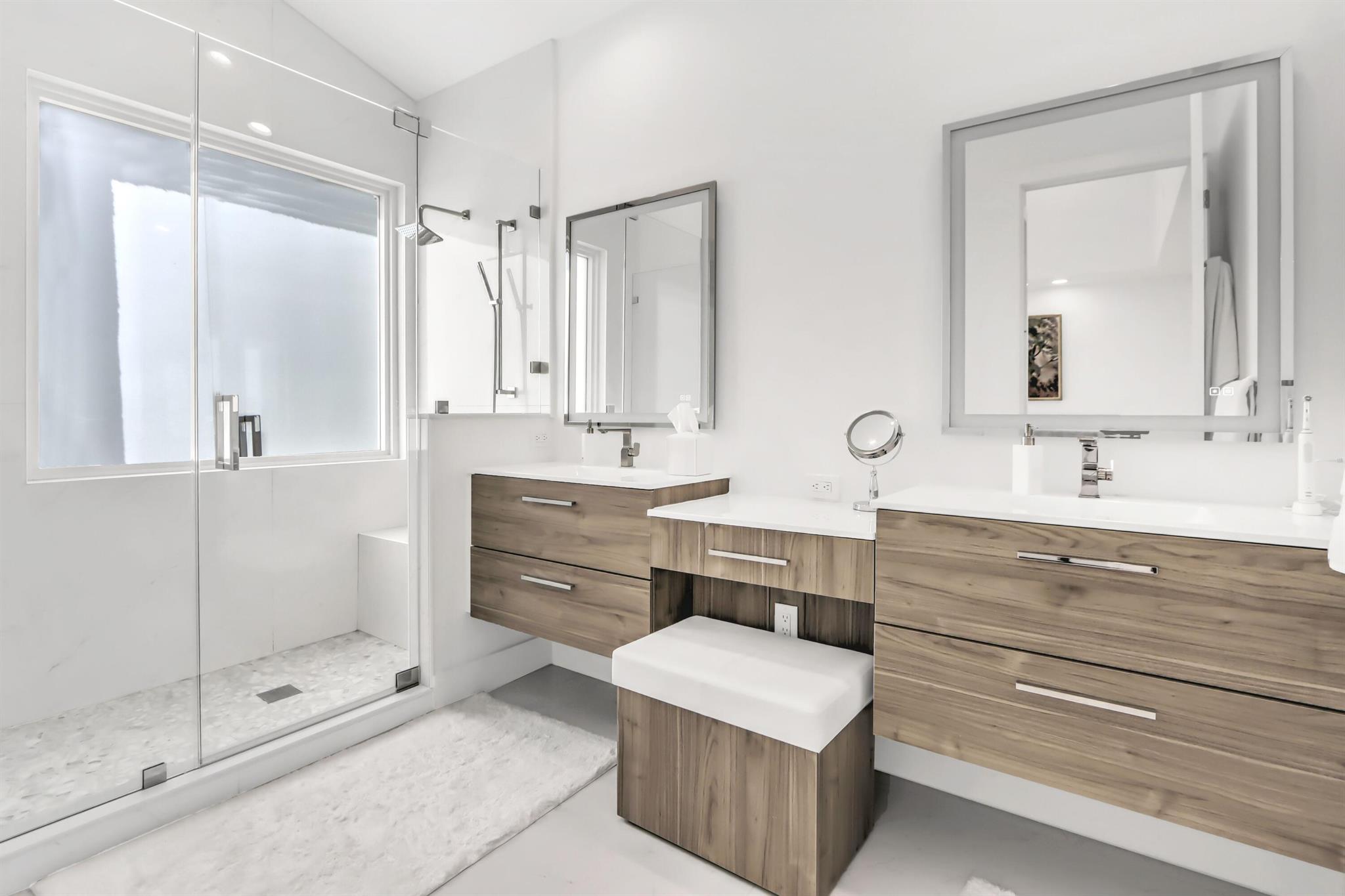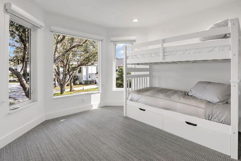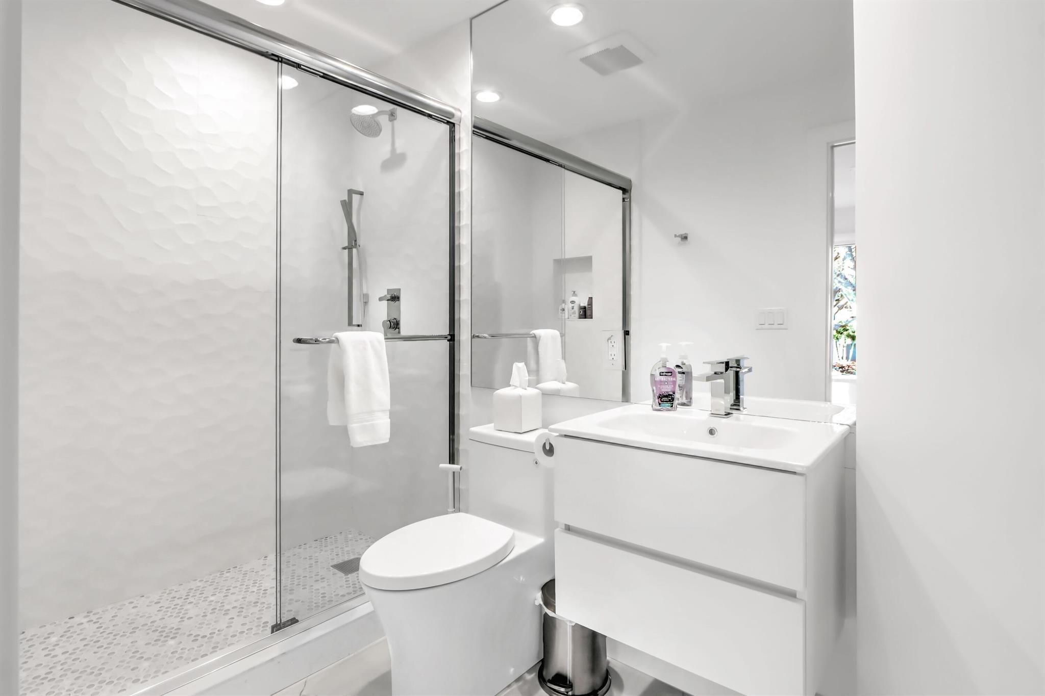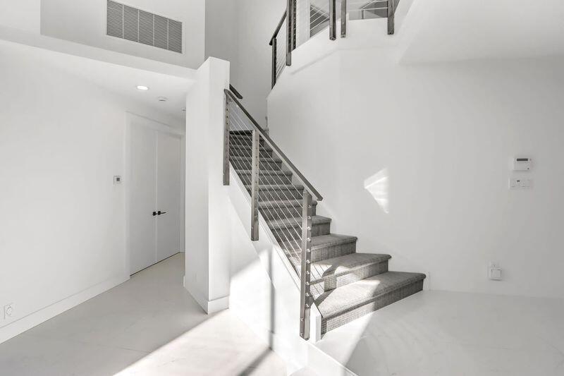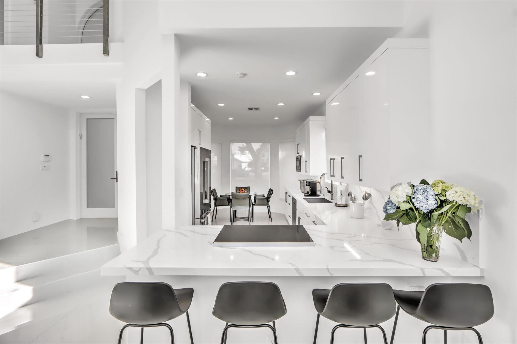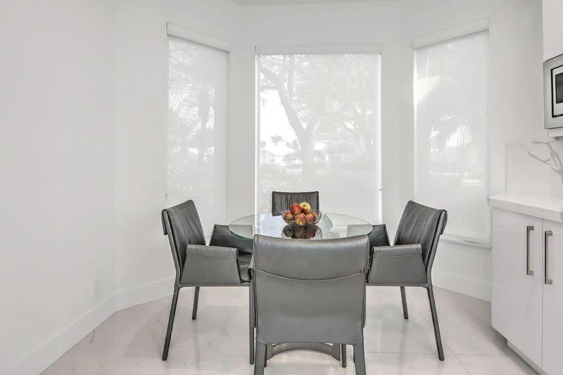 Enjoy the ease of moving into a home with tranquil golf course views remodeled in top of the line finishes. A long driveway leads to this lovely 2-story home of 4 Bedrooms & 3 1/2 Baths - light, bright & renovated with contemporary flair. Features include volume ceilings with LED lighting; white flat-finish walls;48X48 porcelain tile floors; custom solid core doors of modern design; custom window shades;custom closets & a dramatic modern metal cable/rod railing up the stairs. The inviting island kitchen offers white 42'' high-gloss cabinets,quartz countertops & backsplash, stainless steel Bosch appliances & a charming breakfast nook. Completely renovated bathrooms;3rd full bath added in 2024. 2024: New roof, impact windows & doors, garage doors; 2025: New gutters. Furnished or Unfurnished.