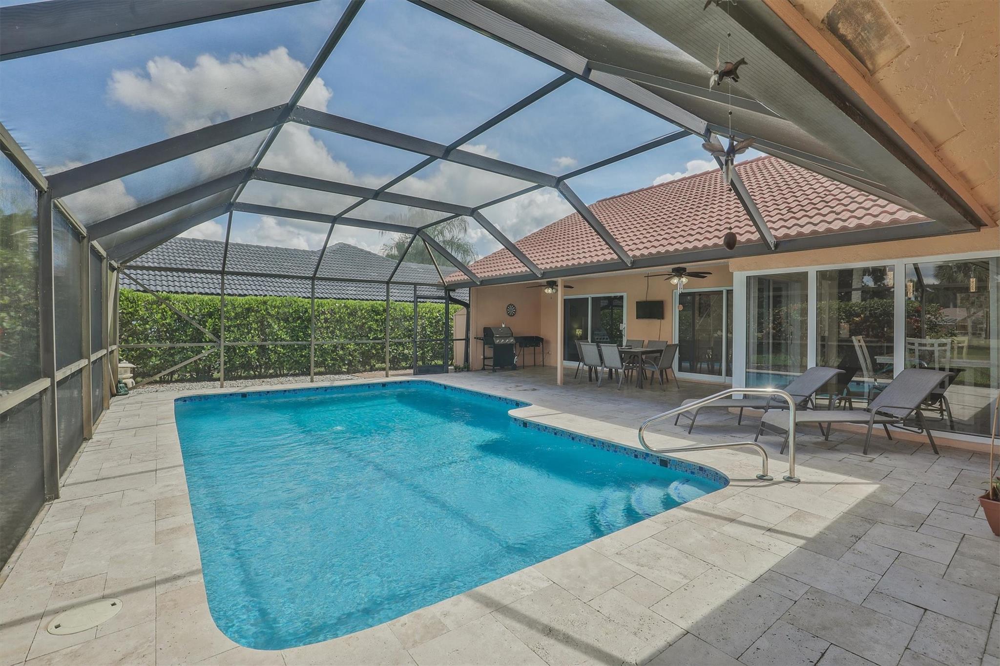Beautifully updated home in a desirable Golf course community with No mandatory membership. Renovated kitchen includes an island which maximize the home's cooking space, granite countertops, and stainless steel appliances. Split bedroom floor plan with 4 bedrooms & 2 bathrooms. An extra family room next to the kitchen. Dining room plus an eat-in kitchen area. A separate laundry room with tub. Impacted windows & doors. Impacted Garage Door. Screened patio with travertine pool deck and golf course & canal water view. Heated pool with salt system. Solar panels. Pavers driveway. Mango tree. Low HOA fees cover guarded gate, internet, & cable. A-rated schools. Convenience location.