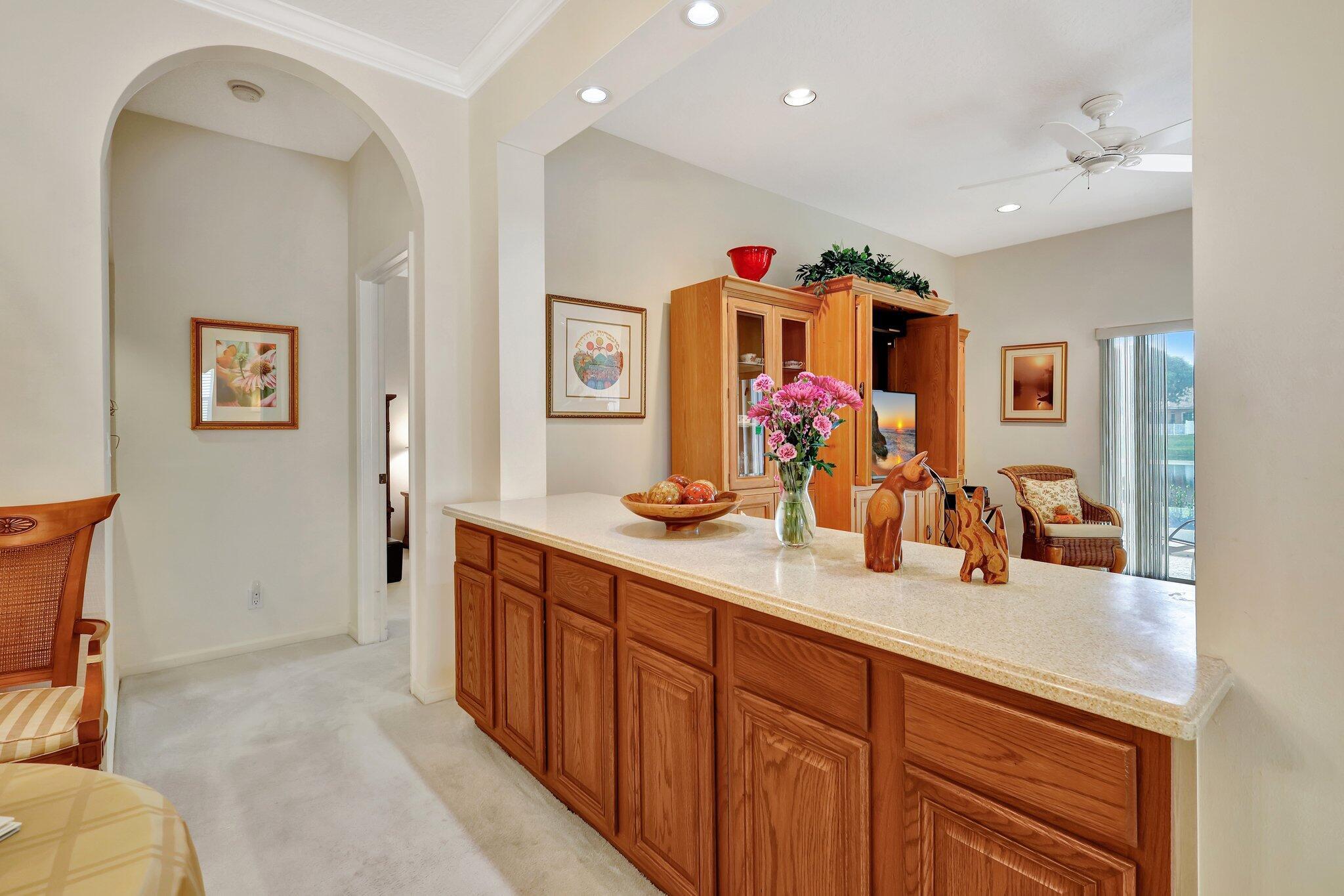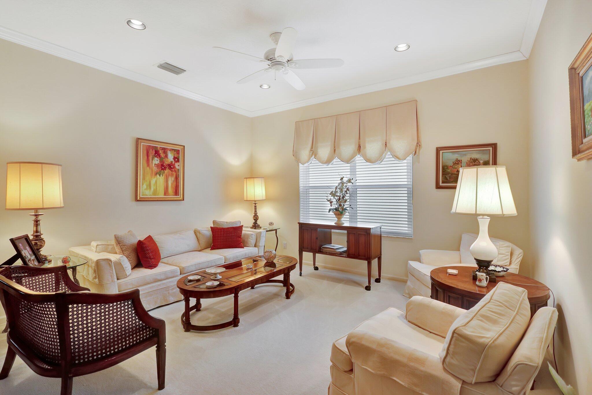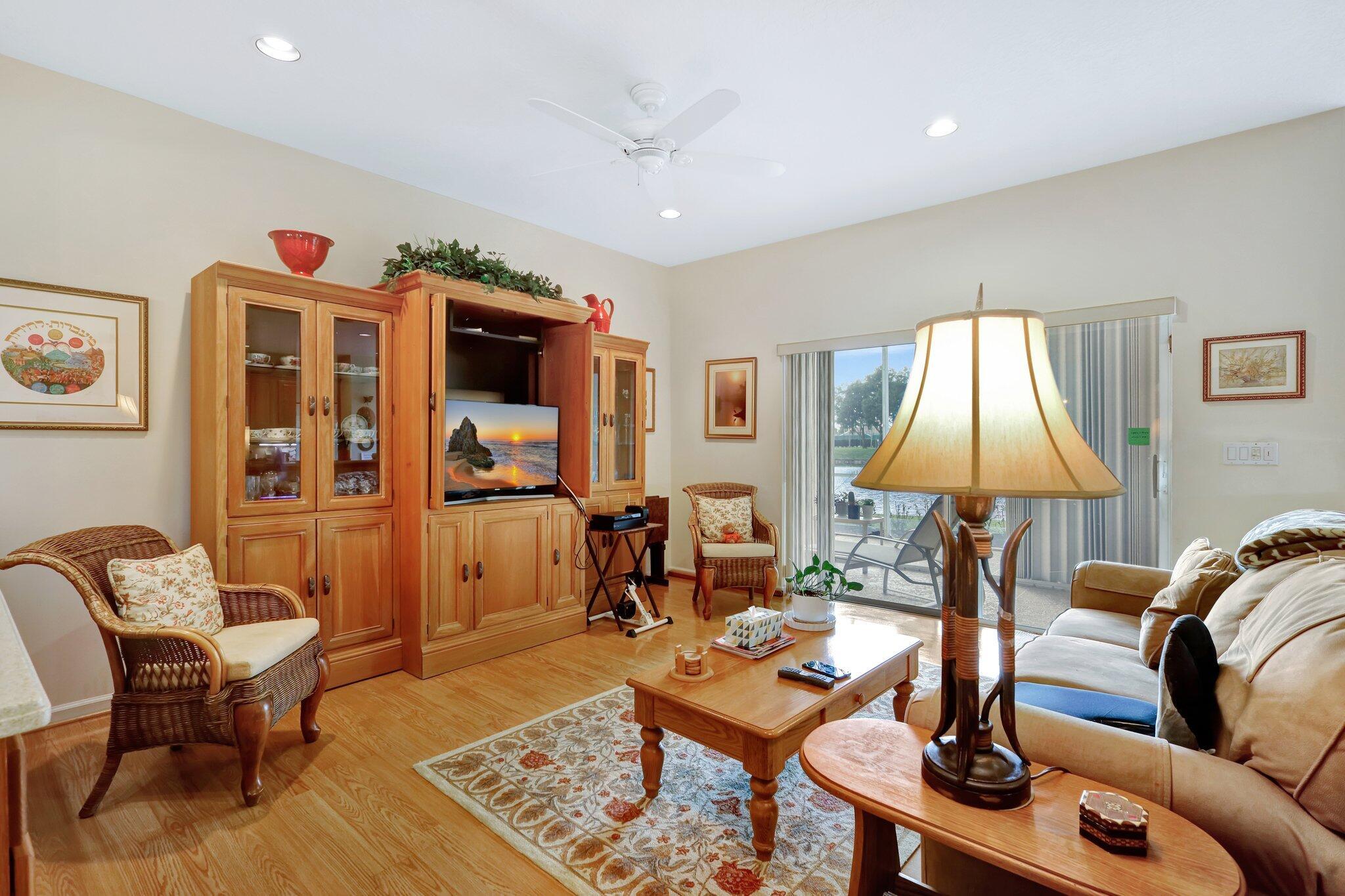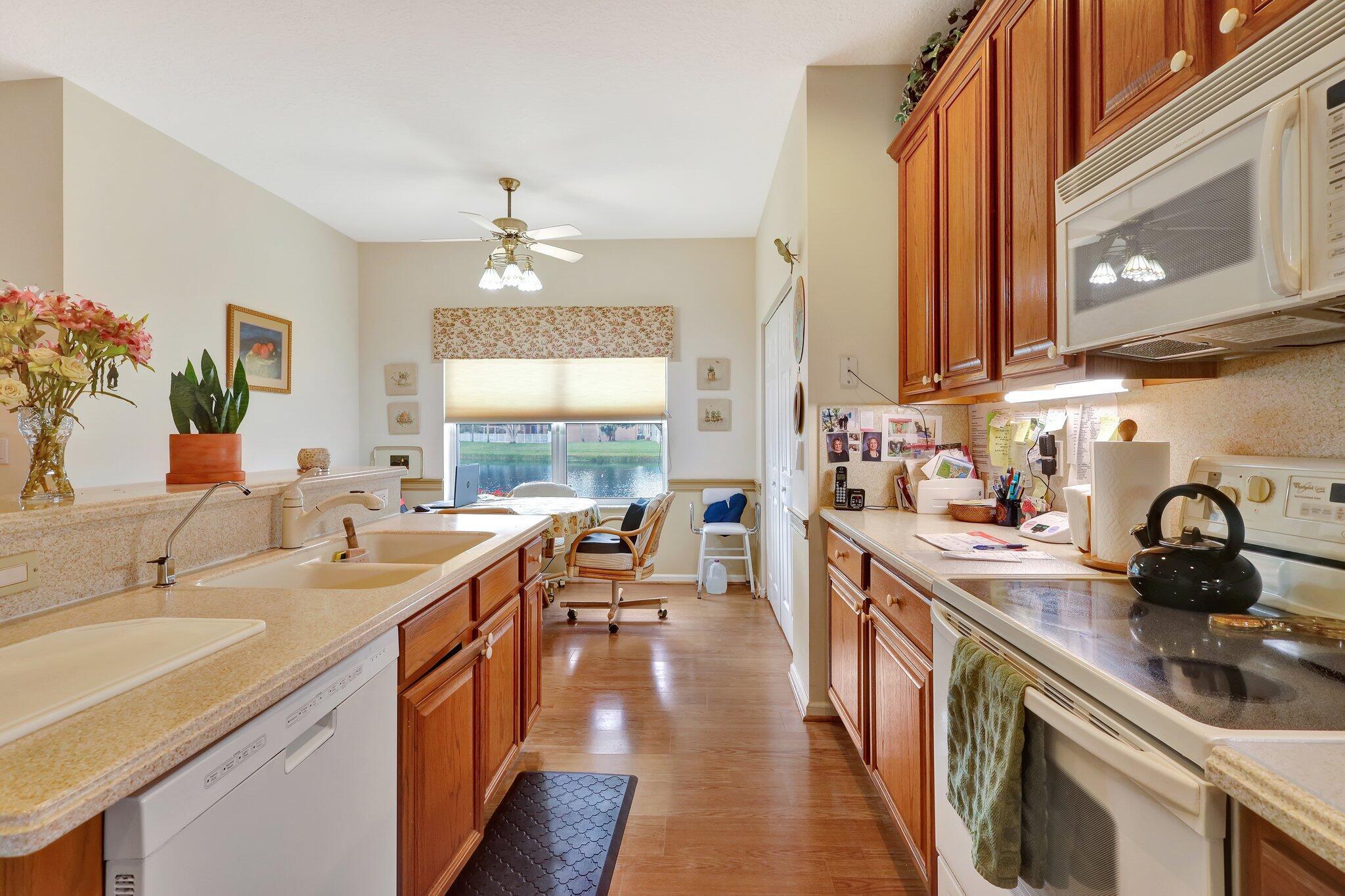 Pristine lakeside 3/2/2 home offered by original owner in ultra convenient Andros Isle. Enjoy wide lake views. Pristine and lovingly maintained. Screened front entrance. Large open Kitchen with center island and casual dining overlooking the lake. Custom window treatments, Updated appliances. Large K cabinets (wood).Pullout drawersr Huge Custom made buffet cabinet between Formal DR and FamRm.. Spa/Roman Tub in MBTH. Large customized closets (2) in MBR. Double Screened covered patio. Accordian Hurricane Shutters. POA fee includes landscaping, basic CATV, WiFi/Broadband, 24/7 staffed gate, monitored home security, irrigation, award winning resort clubhouse w heatedpool and huge fitness center. Convenient to airport, turnpike, Wellington, Downtown WPB. Private road to Publix plaza..