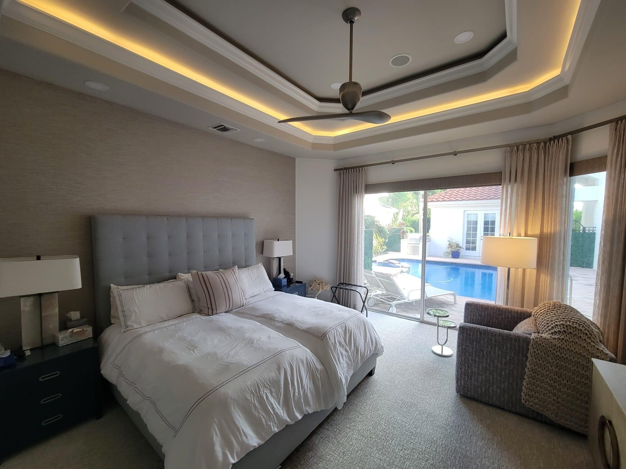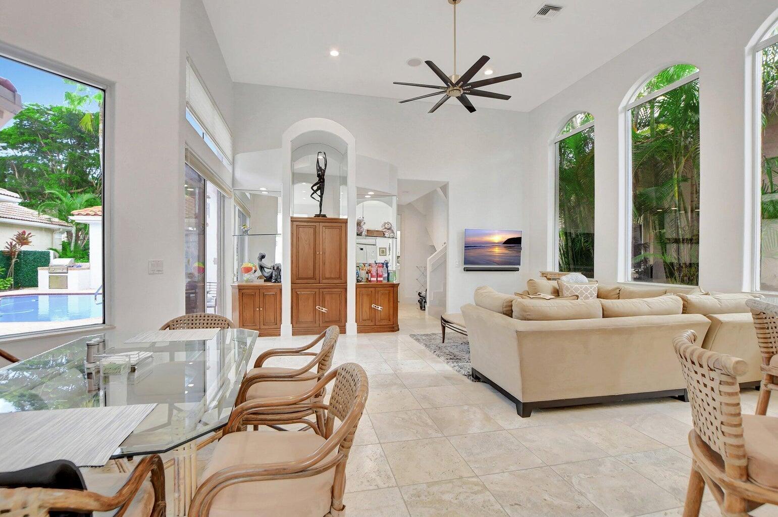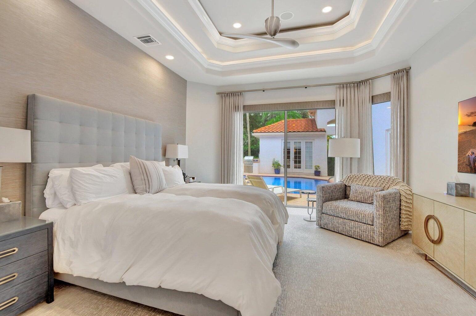 Best deal in Boca Grove - A Move-In-Ready 5-Bedroom, 5-Bathroom Courtyard Home in subsection Islands of the Grove. This beautifully maintained residence offers the ultimate in privacy and luxury. This home features a spacious layout with a private pool and spa, complemented by summer kitchen--ideal for outdoor entertaining. Enjoy stunning lake views from the expansive deck, providing a serene setting for relaxation. The home includes a full guest house adjacent to the courtyard, perfect for accommodating guests or creating an independent living space for a teen or in-laws. Upon entering the main house, you're welcomed by a grand living room with soaring ceilings and large windows showcasing picturesque lake views. The formal dining area also enjoys the same breathtaking vistas, creating a