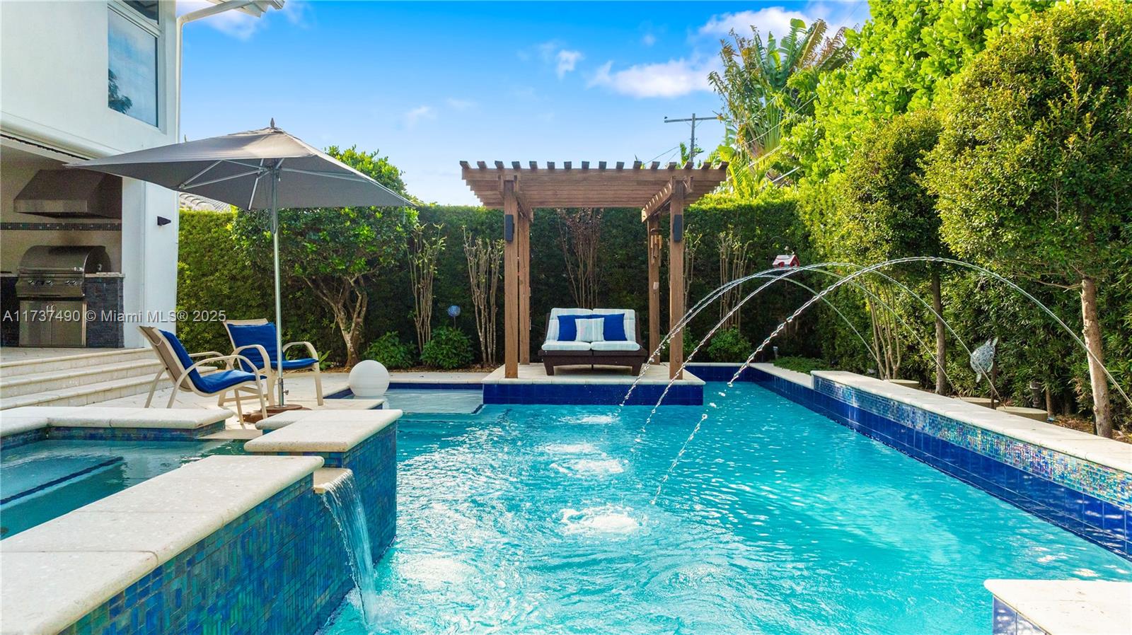 Located in Bay Harbor Islands, one of the most coveted neighborhoods in Miami, is this 5090sqft mid-century modern home rebuilt in 2009! This exquisite property has 4 large ensuite bedrooms, an expansive office and a spacious den. Other features include high ceilings, impact windows, natural woods, stone accents, smart home technology, surround sound, electric blinds, and redone electric & plumbing. The chef's kitchen has top-of-the-line Miele and Subzero appliances. The primary suite includes 3 closets, a spa-like bath with a multi jetted shower and a balcony. Paradise is in the backyard with a custom pool, jacuzzi, sun shelf, summer kitchen, pergola, pool bath, lush landscaping & a butterfly garden. Amazing location: walk to the beach, cafes, shopping, A+ schools, tennis & parks. NO HOA