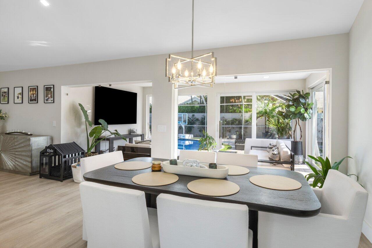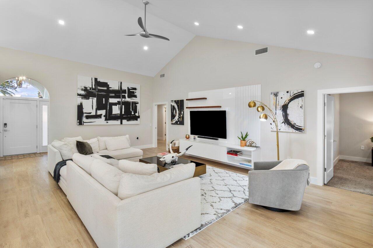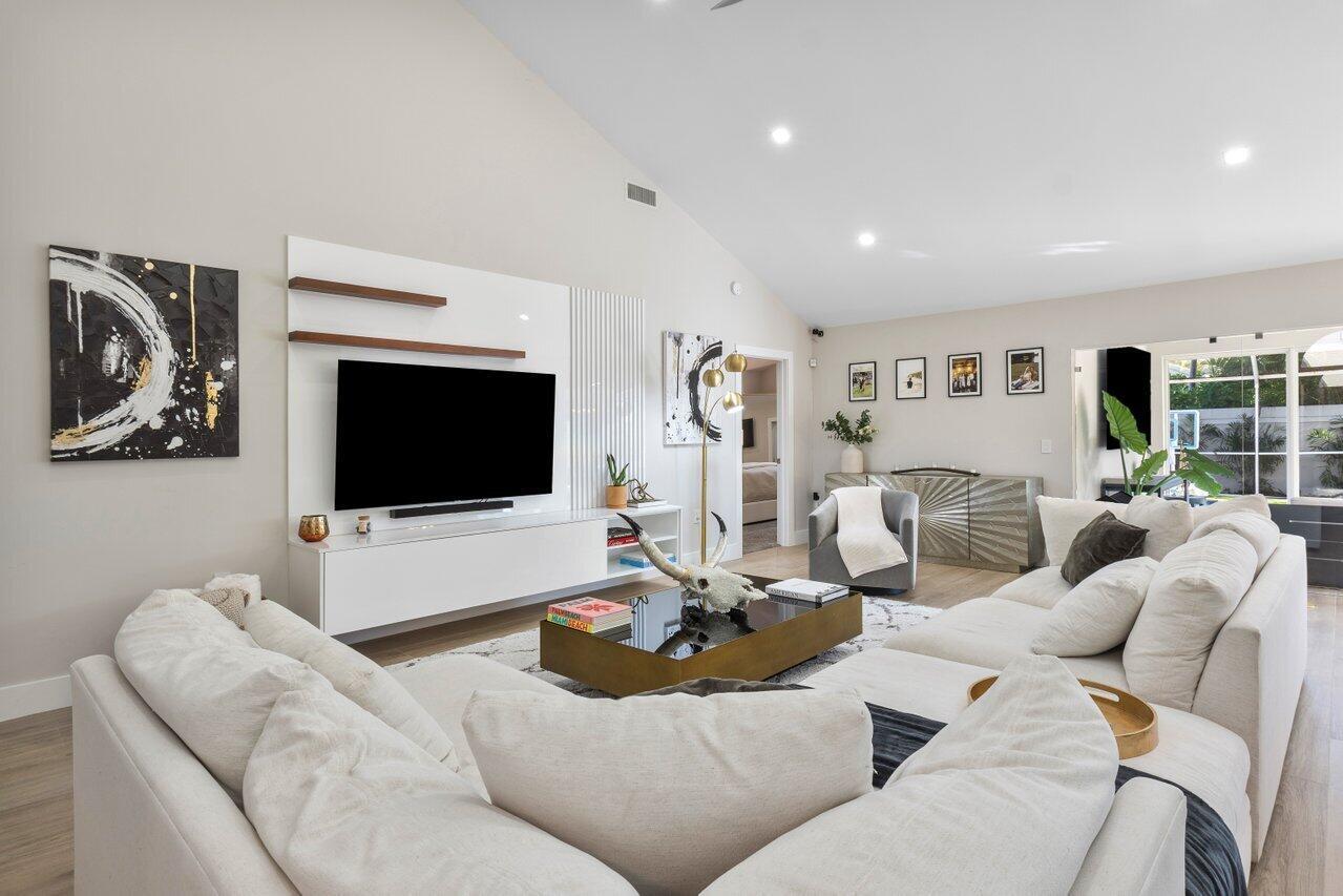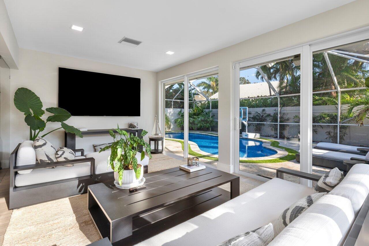 This stunning, fully renovated Saratoga model home is the largest floor plan in Bear Island, offering an impressive 2,271 square feet of living space. No detail has been overlooked in the extensive upgrades, which include impact windows and doors (including the garage door), luxurious 8-inch porcelain wood-plank flooring, solid wood interior doors, sleek square LED recessed lighting, and elegant plantation shutters throughout. The custom-built wall unit in the living room is a standout feature, adding both style and functionality. The chef's kitchen is a masterpiece, featuring high-end, soft-close cabinetry, quartz countertops, and top-of-the-line Bosch and Electrolux appliances. The seamless transition from the living room to the Florida room is made possible by custom glass door