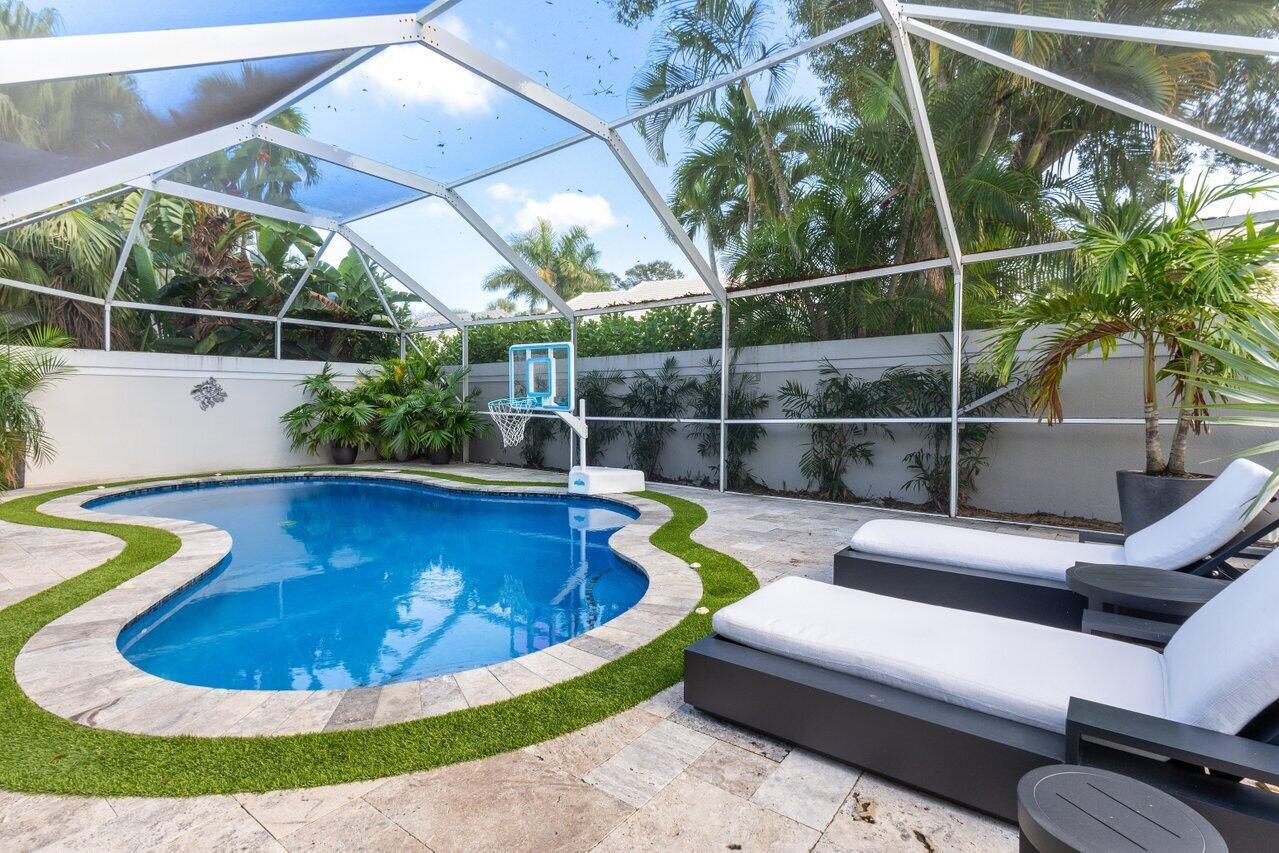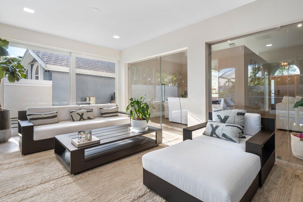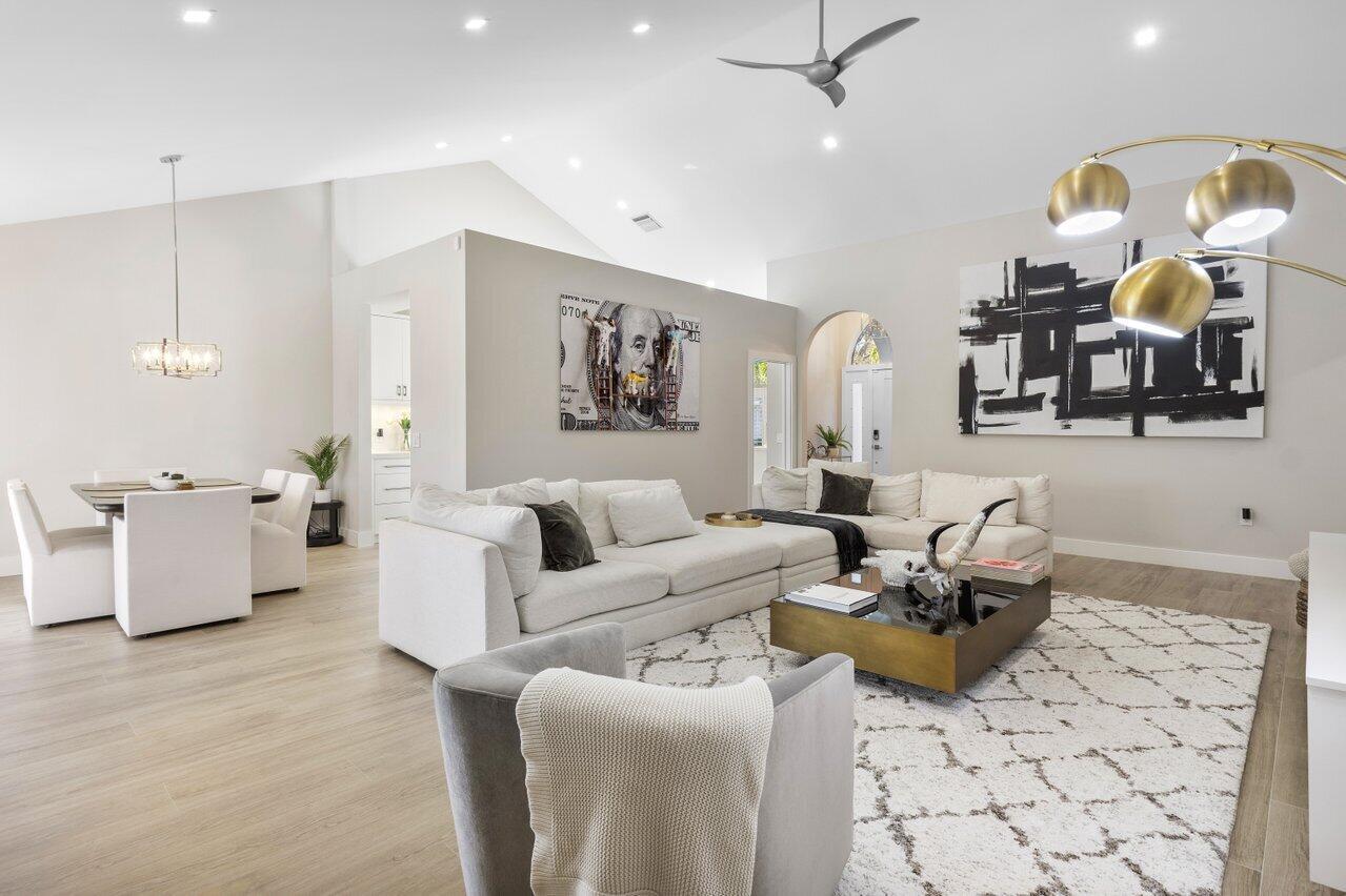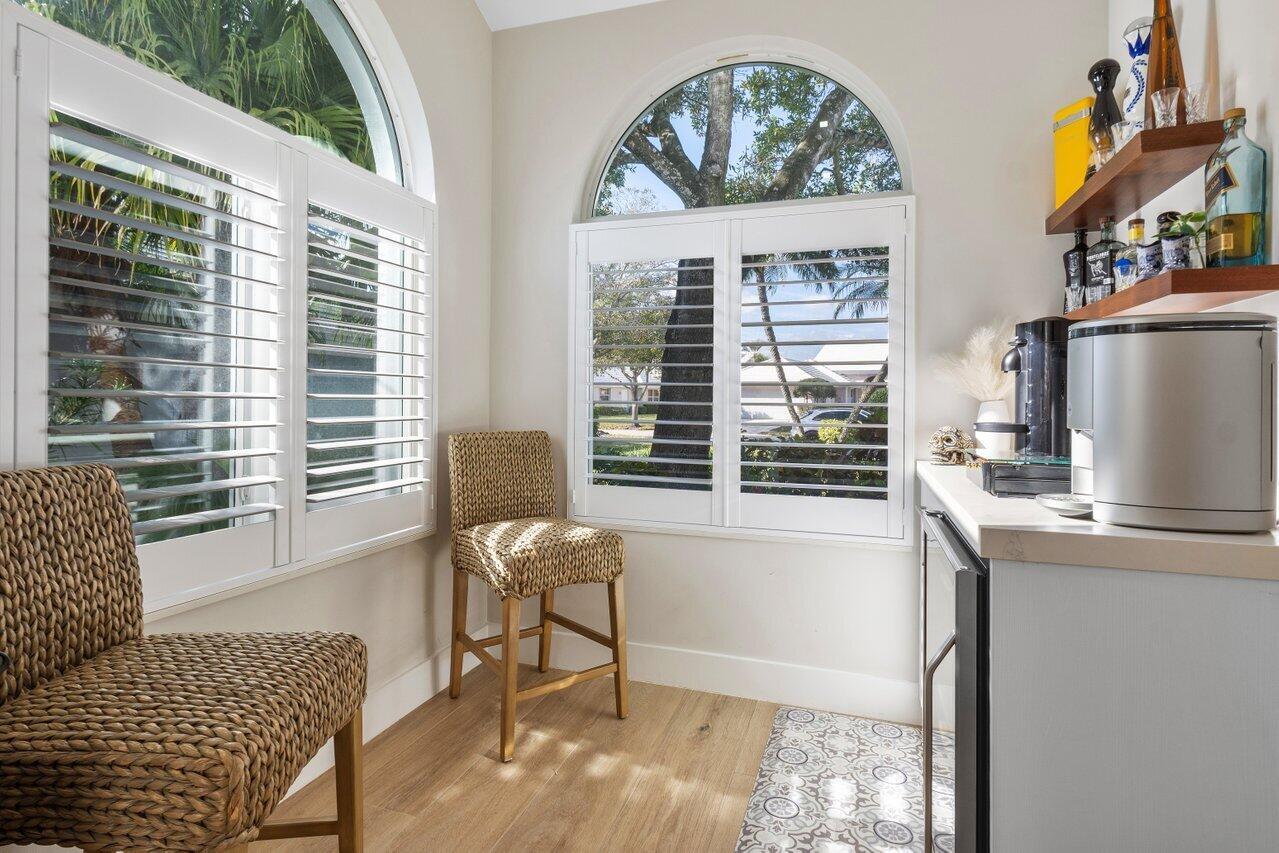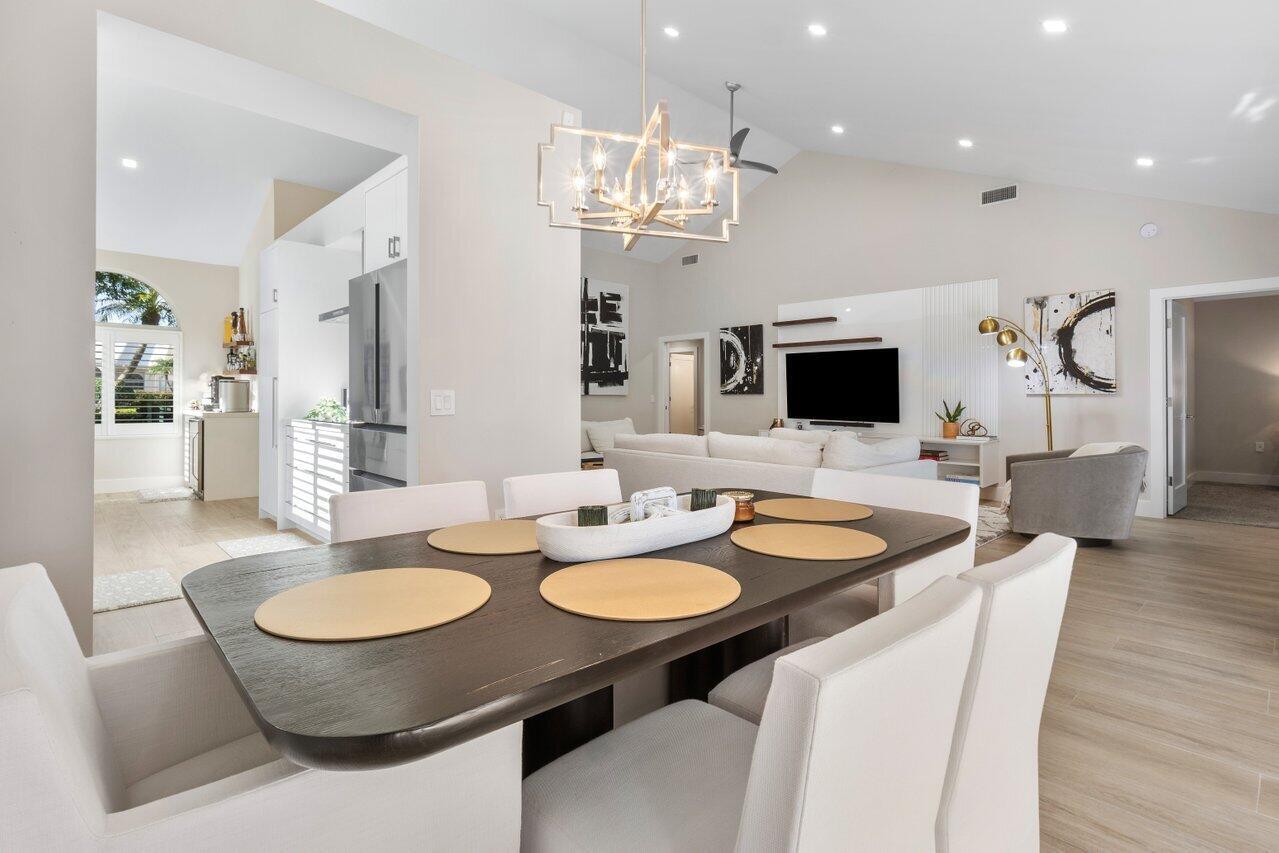 This stunning, fully renovated Saratoga model home is the largest floor plan in Bear Island, offering an impressive 2,271 square feet of living space. No detail has been overlooked in the extensive upgrades, which include impact windows and doors (including the garage door), luxurious 8-inch porcelain wood-plank flooring, solid wood interior doors, sleek square LED recessed lighting, and elegant plantation shutters throughout. The custom-built wall unit in the living room is a standout feature, adding both style and functionality. The chef's kitchen is a masterpiece, featuring high-end, soft-close cabinetry, quartz countertops, and top-of-the-line Bosch and Electrolux appliances. The seamless transition from the living room to the Florida room is made possible by custom glass door