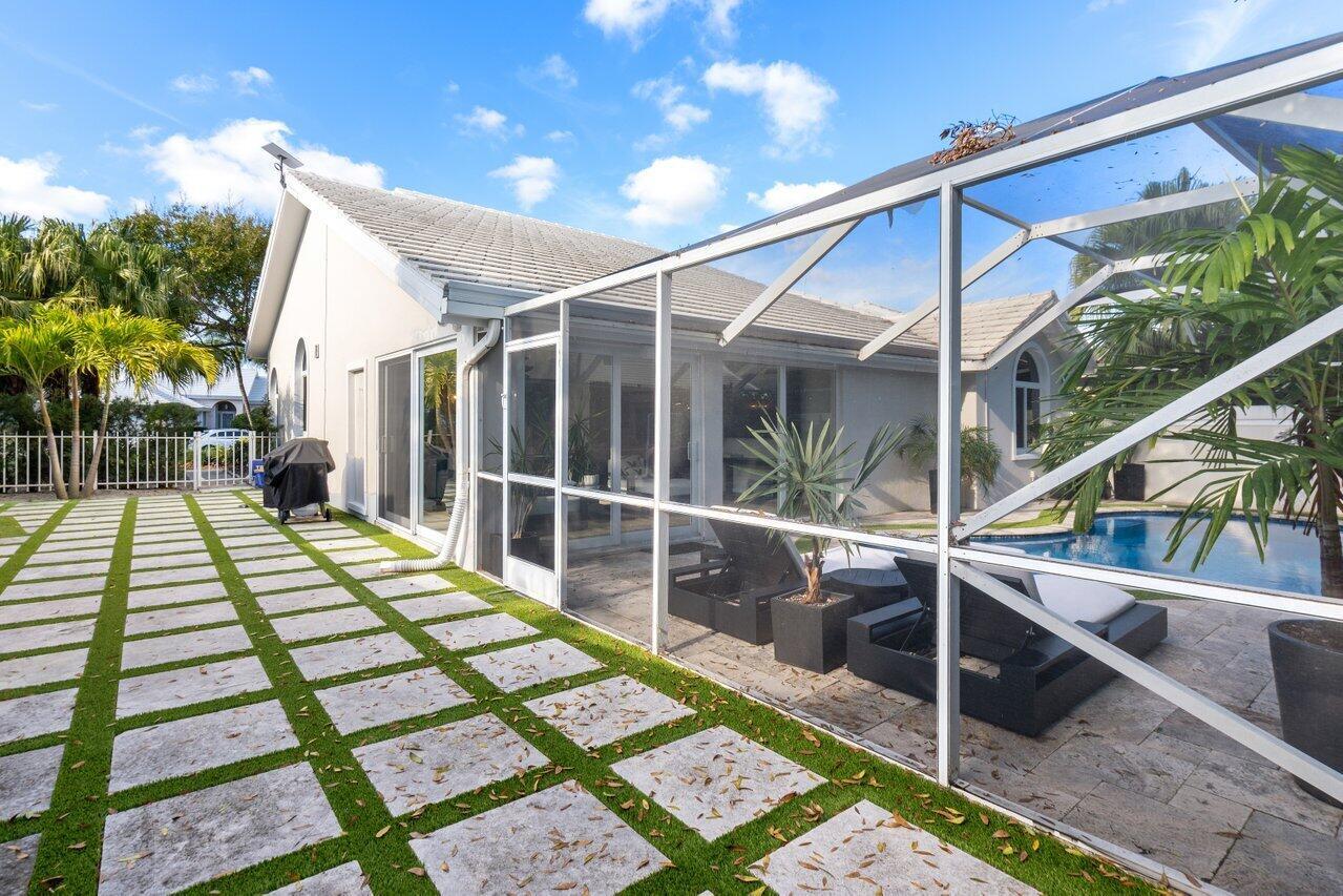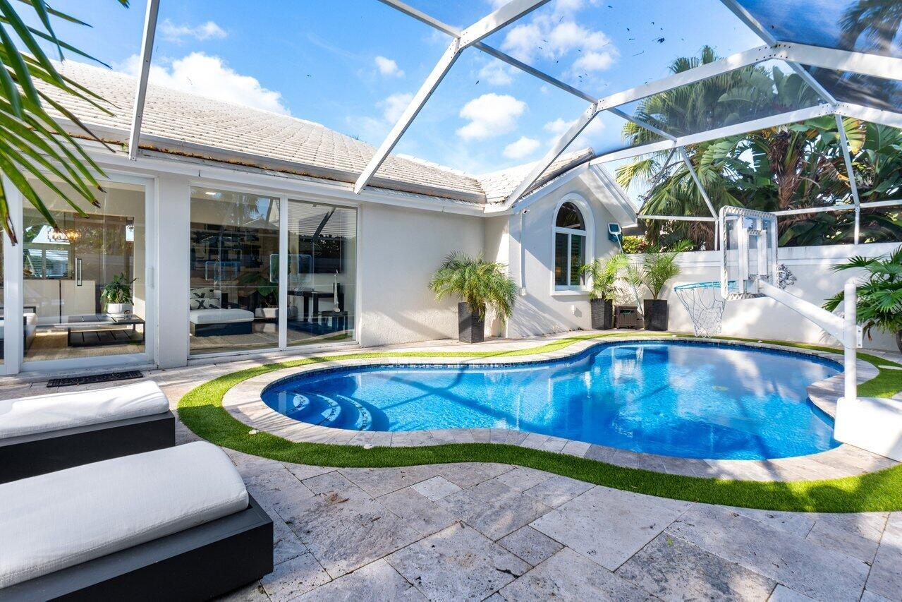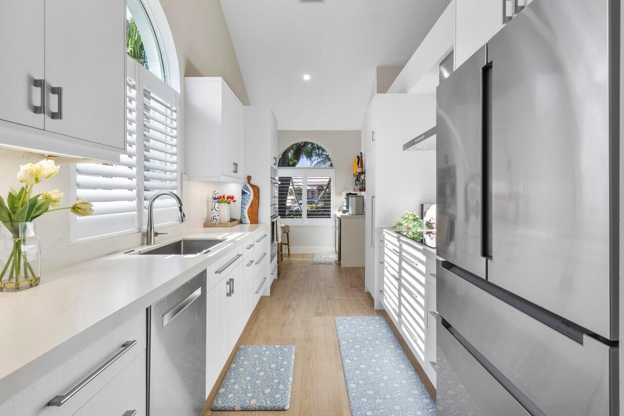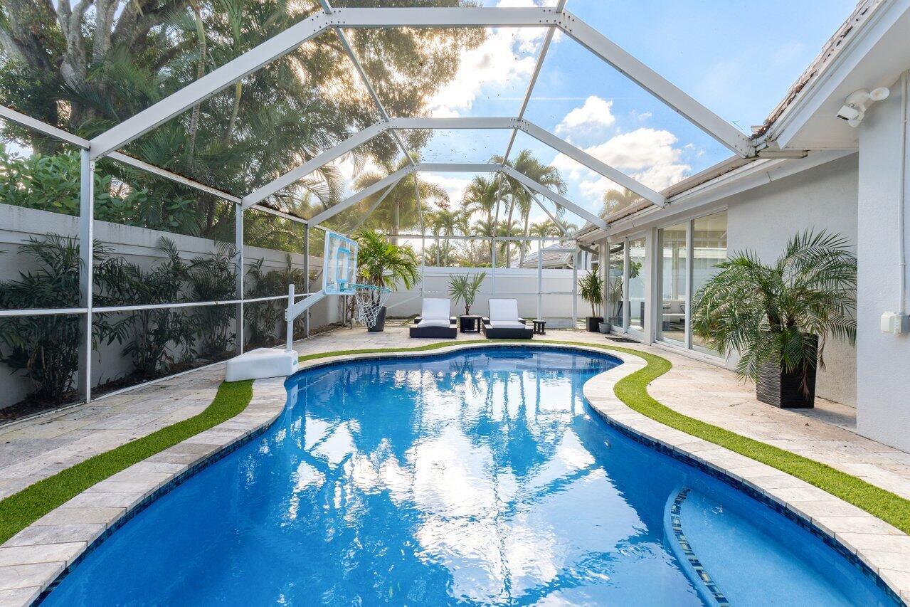 This stunning, fully renovated Saratoga model home is the largest floor plan in Bear Island, offering an impressive 2,271 square feet of living space. No detail has been overlooked in the extensive upgrades, which include impact windows and doors (including the garage door), luxurious 8-inch porcelain wood-plank flooring, solid wood interior doors, sleek square LED recessed lighting, and elegant plantation shutters throughout. The custom-built wall unit in the living room is a standout feature, adding both style and functionality. The chef's kitchen is a masterpiece, featuring high-end, soft-close cabinetry, quartz countertops, and top-of-the-line Bosch and Electrolux appliances. The seamless transition from the living room to the Florida room is made possible by custom glass door