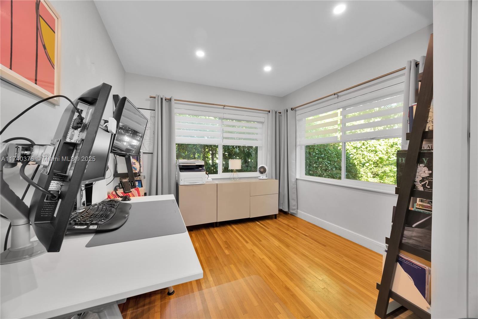 Motivated Sellers! Beautiful home—bring your best offer! Nestled in the desirable streets of North Gables, this charming 3-bed, 2-bath home with an office/den seamlessly blends modern updates with classic character. With 1,595 adj sqft, this home has been thoughtfully remodeled to preserve its original hardwood floors, adding warmth and elegance. Features include high-impact windows and doors, a newer roof (2021), ample closet storage, and updated recessed lighting throughout. Step outside to a beautifully landscaped backyard featuring a brick paver patio, a custom-built grill, and ambient lighting—perfect for outdoor entertaining. Located on a picturesque tree-lined street, this home is just a few blocks from Granada Golf Course and minutes from Downtown Coral Gables. 1-car garage