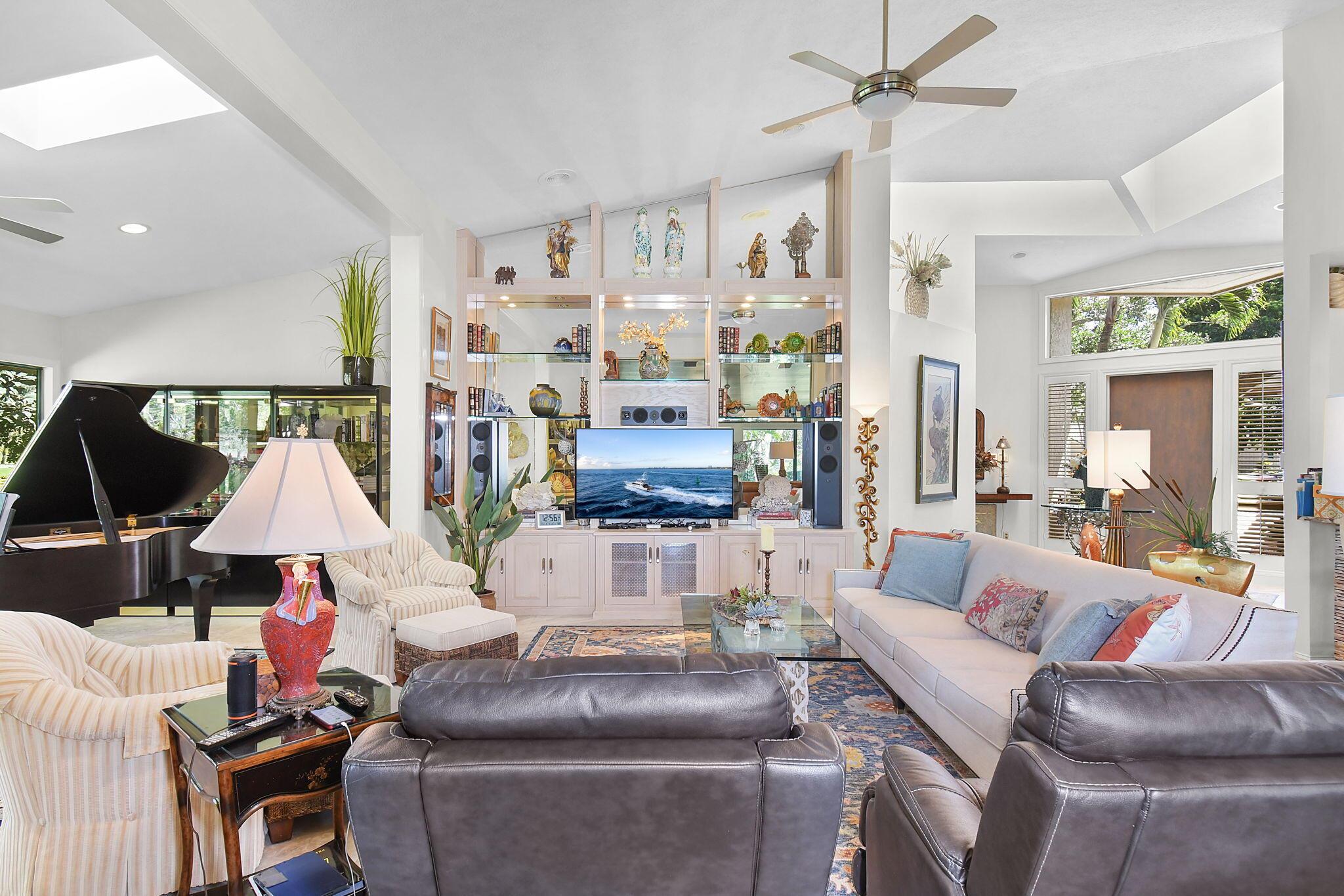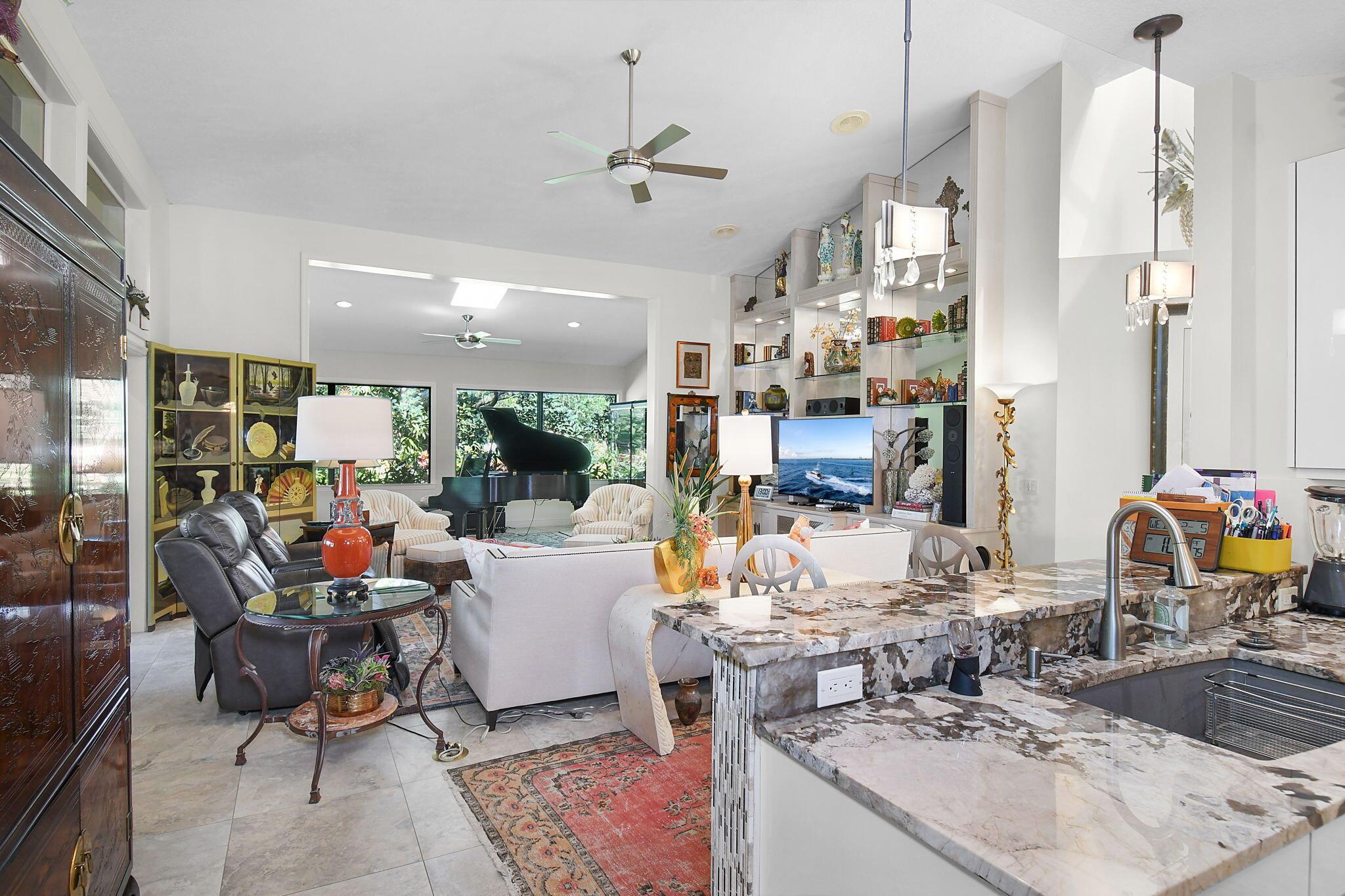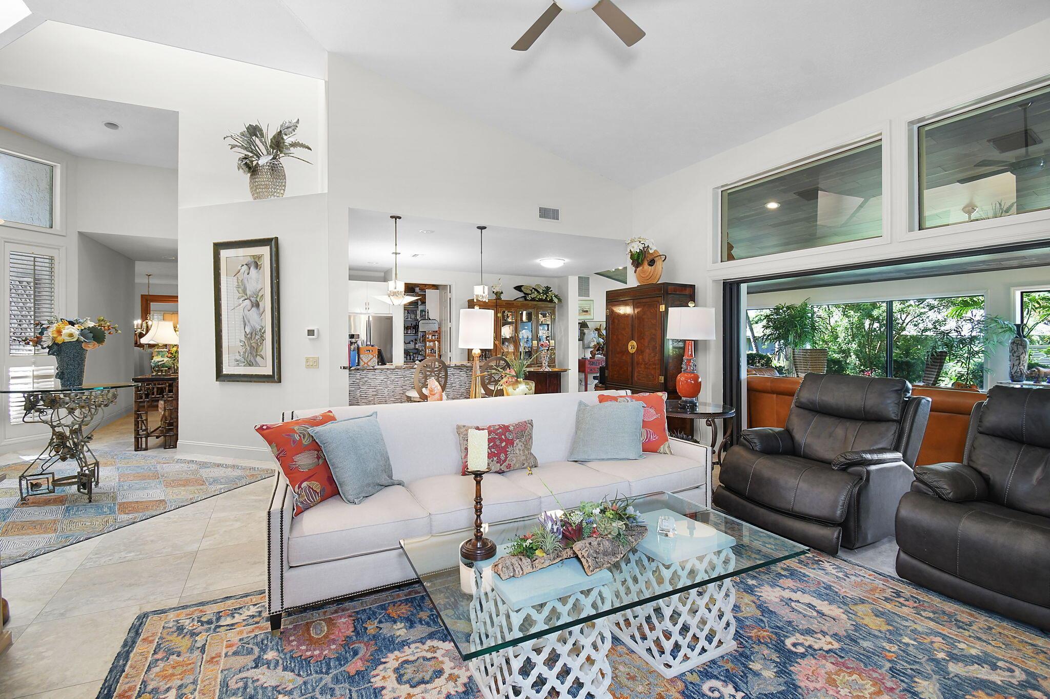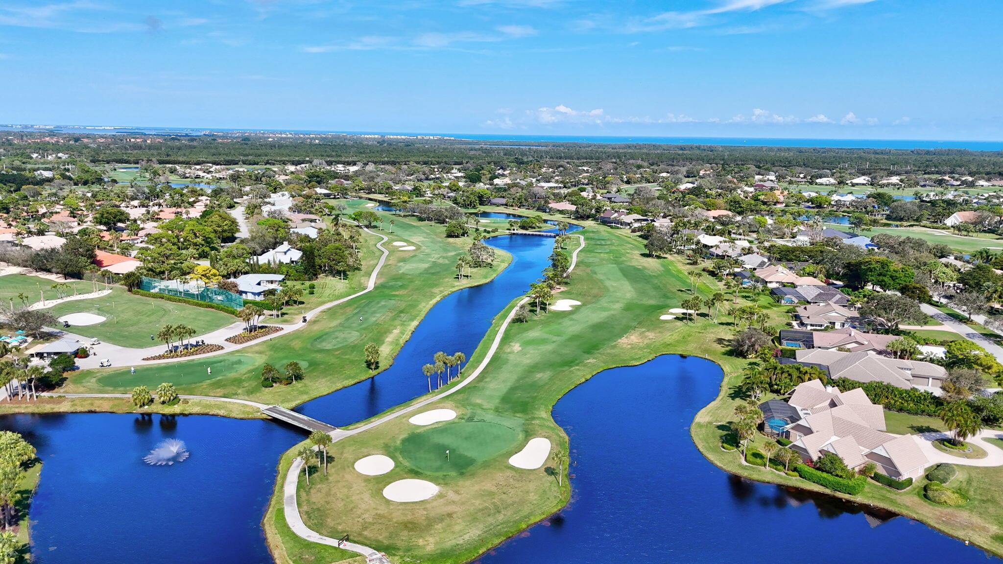 This 4 bedroom 3.5 bath home offers an expansive living space with vaulted ceilings. The recently remodeled kitchen has gorgeous granite countertops, stainless steel appliances, a large pantry & wine fridge that would please any chef. The Florida Room with wood ceilings overlooks a garden that could be easily turned into an inviting pool area. The large primary bedroom includes a sitting area & 2 walk-in closets. The massive primary bathroom has 2 vanities, step-in shower and soak tub. The Music & Recreation rooms at the rear of the home offer panoramic views of the Blue Course 14th fairway through impact glass picture windows. On the other side of the home are 3 bedrooms and 2 bathrooms. The home sits on a high & dry .58 acre lot. Garage doors replaced in 2025.