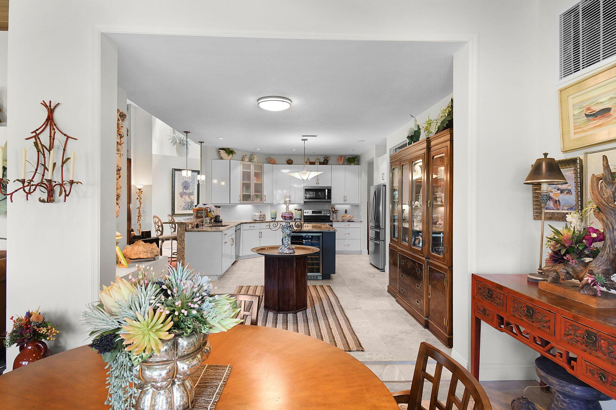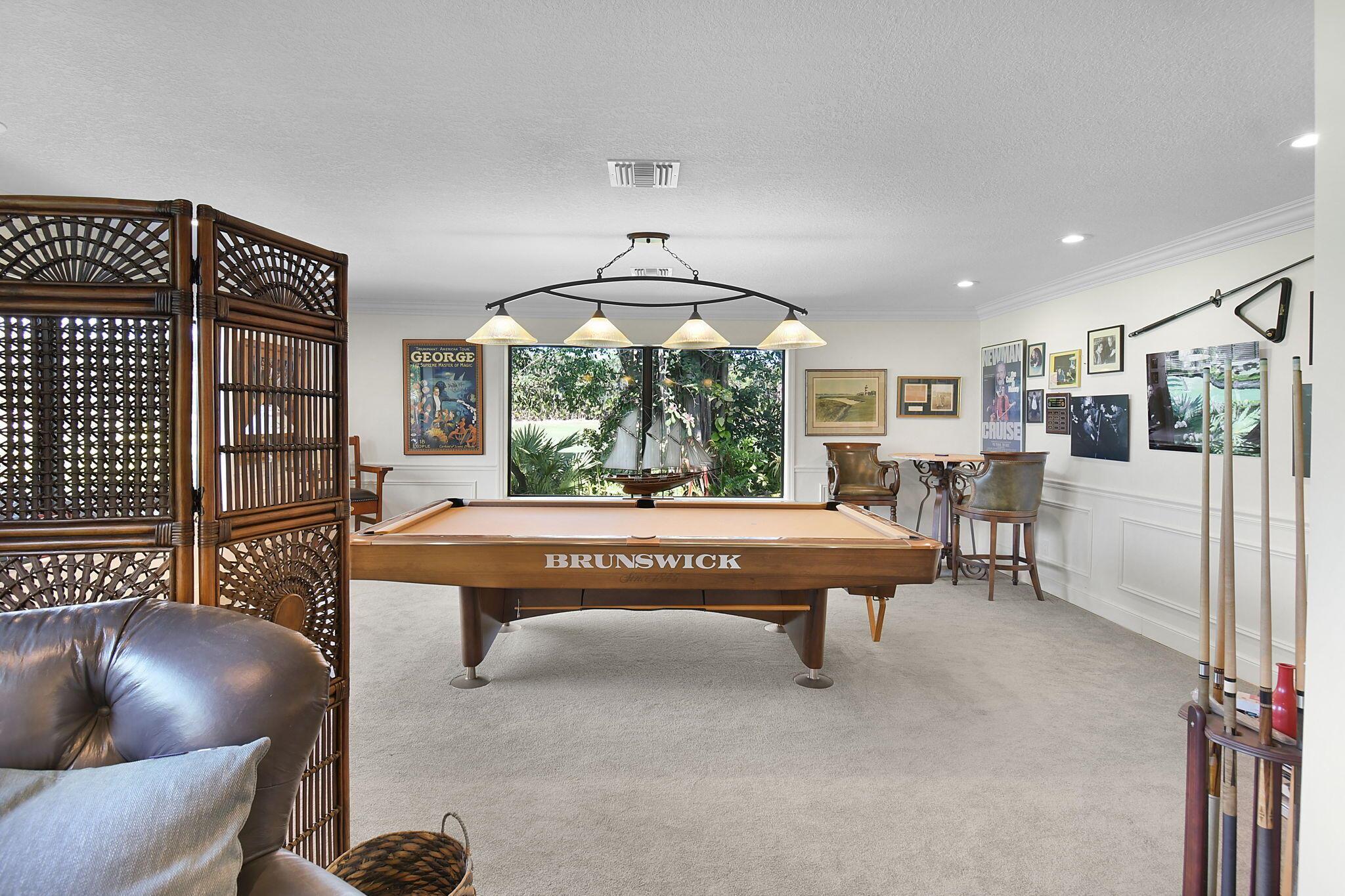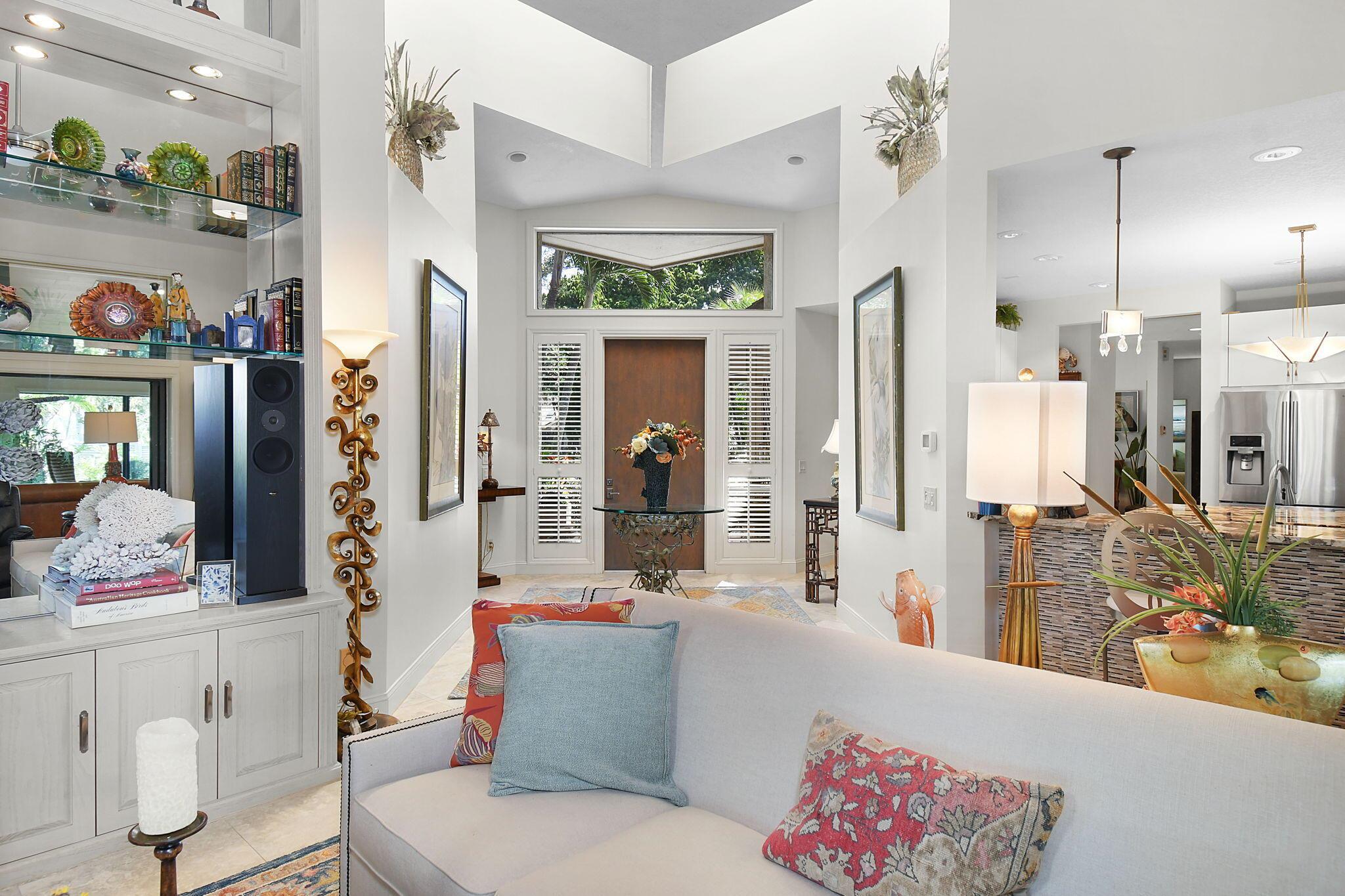 This 4 bedroom 3.5 bath home offers an expansive living space with vaulted ceilings. The recently remodeled kitchen has gorgeous granite countertops, stainless steel appliances, a large pantry & wine fridge that would please any chef. The Florida Room with wood ceilings overlooks a garden that could be easily turned into an inviting pool area. The large primary bedroom includes a sitting area & 2 walk-in closets. The massive primary bathroom has 2 vanities, step-in shower and soak tub. The Music & Recreation rooms at the rear of the home offer panoramic views of the Blue Course 14th fairway through impact glass picture windows. On the other side of the home are 3 bedrooms and 2 bathrooms. The home sits on a high & dry .58 acre lot. Garage doors replaced in 2025.