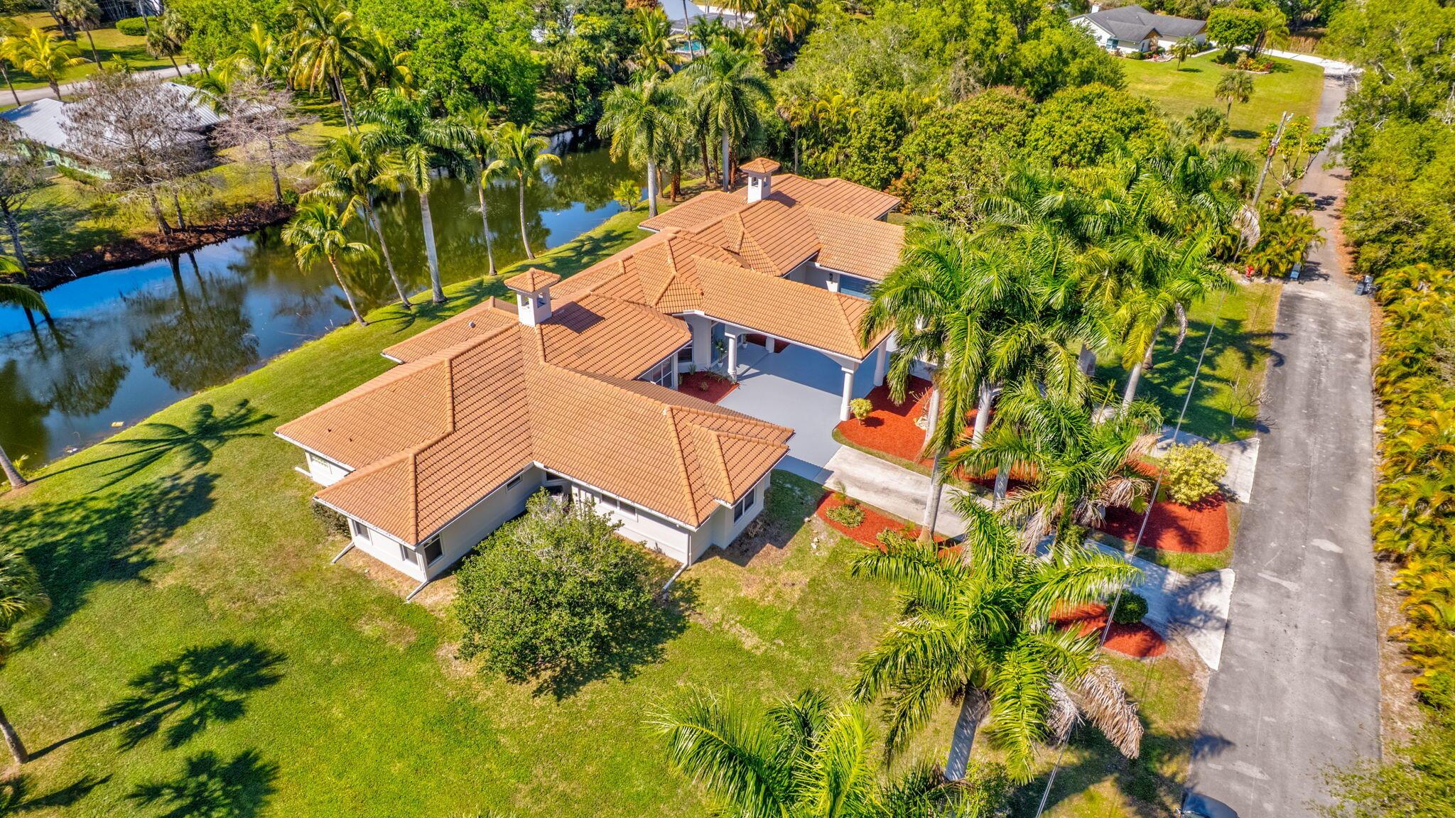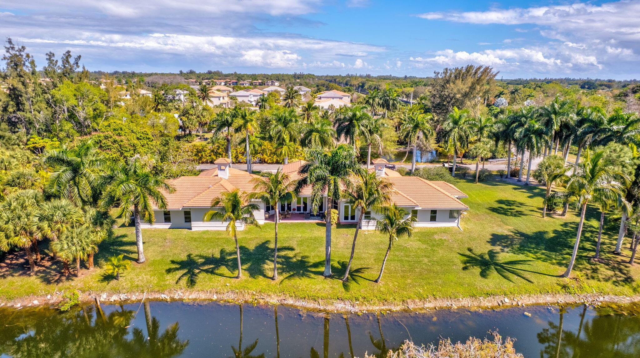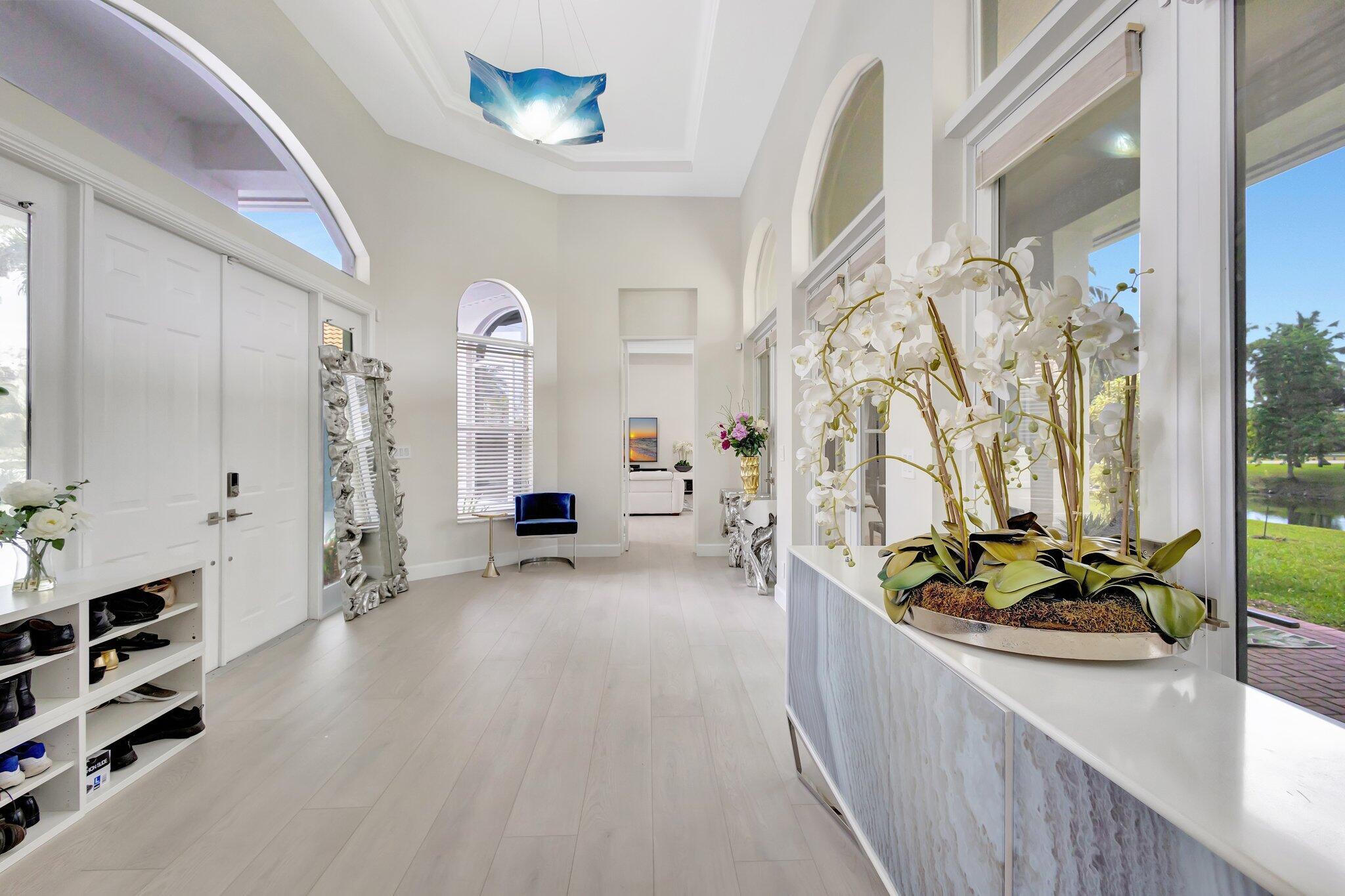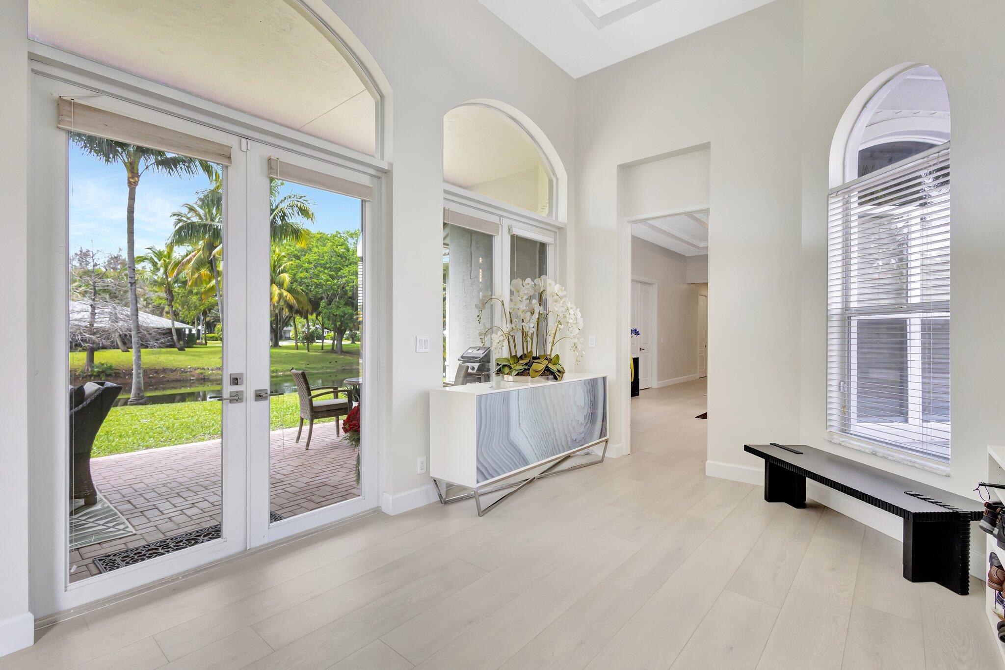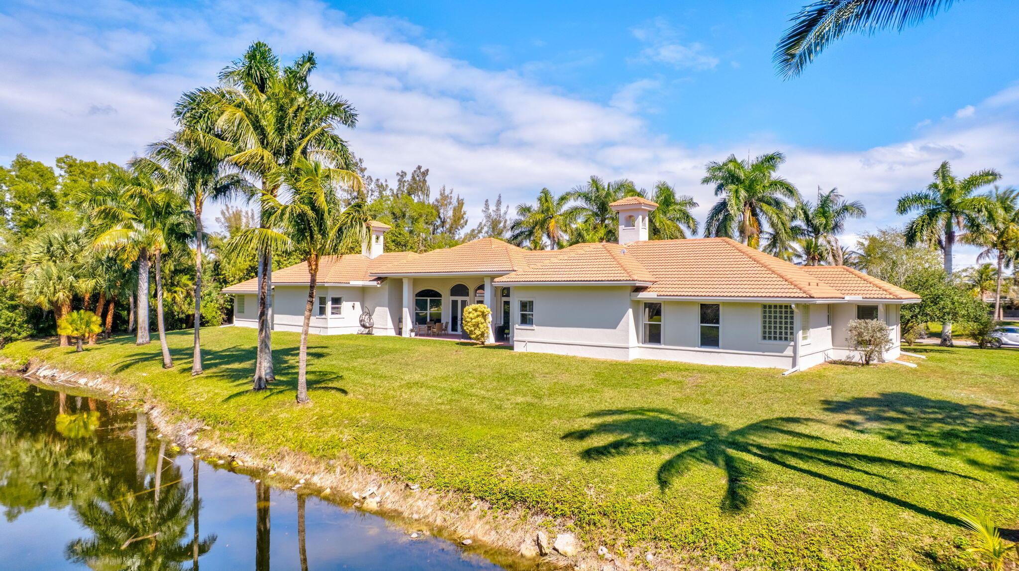 A rare find in the private Whippoorwill Lakes community, this unique estate sits on a spacious 2-acre corner lot. With an elegant portico, two 2-car garages, and a circular driveway lined with royal palms, it offers both style and convenience. Recently renovated, the home features soaring ceilings, a brand-new kitchen, and updated flooring throughout. The split floorplan provides stunning water views, while lush landscaping, including fruit trees, adds to its charm. A perfect blend of comfort and sophistication.