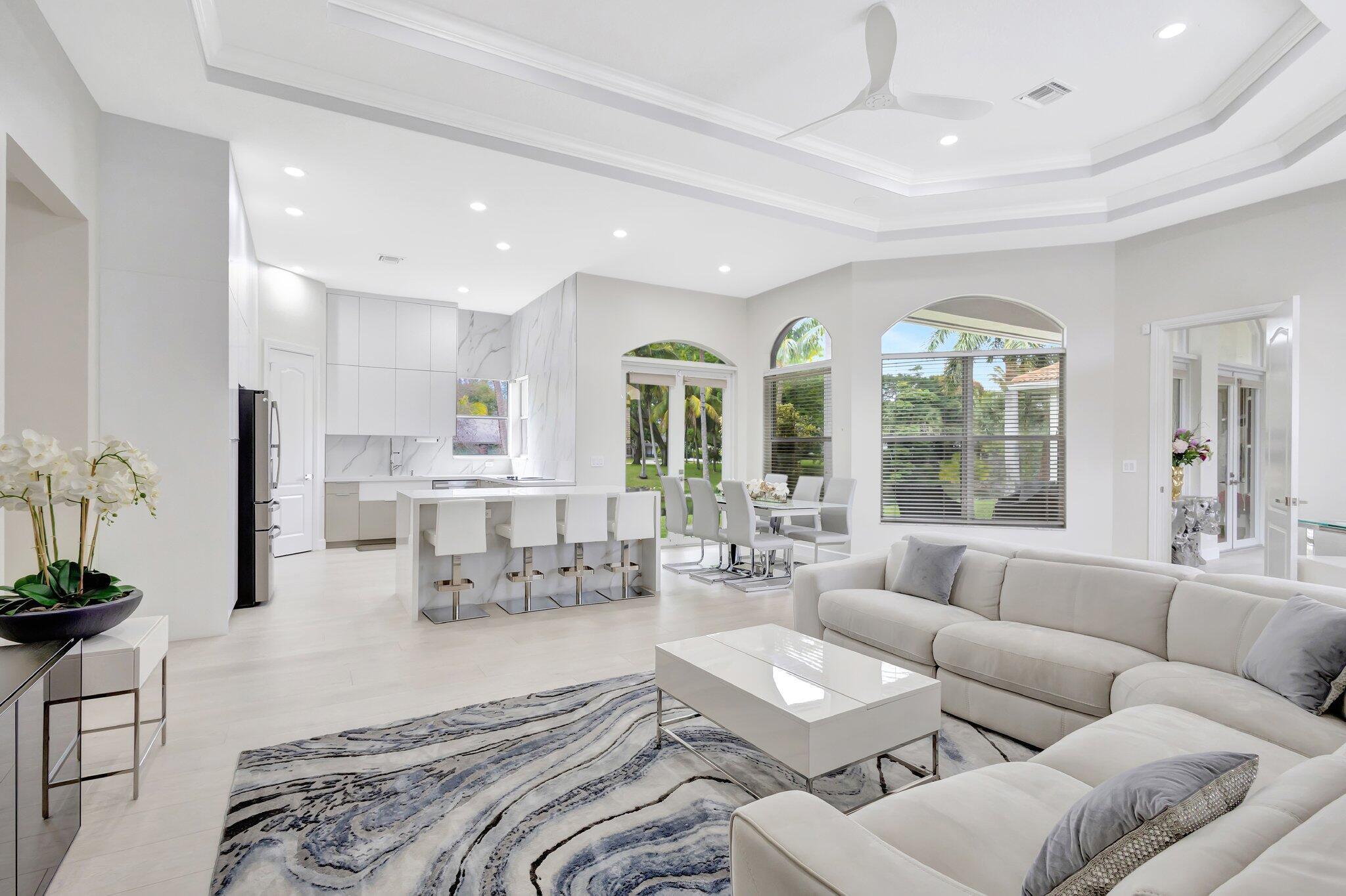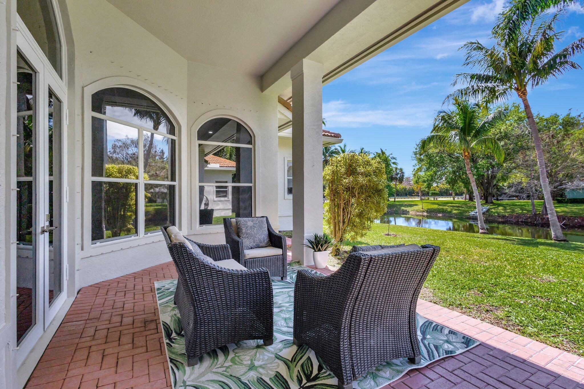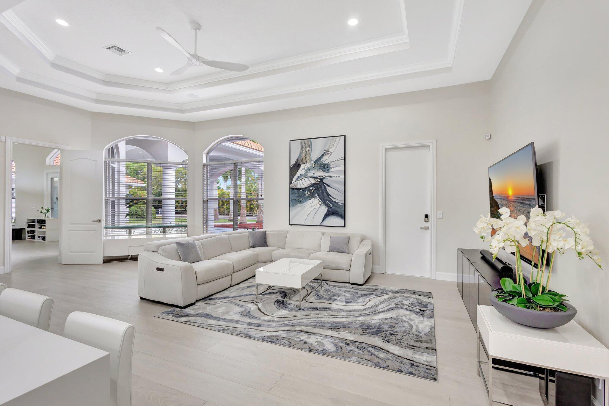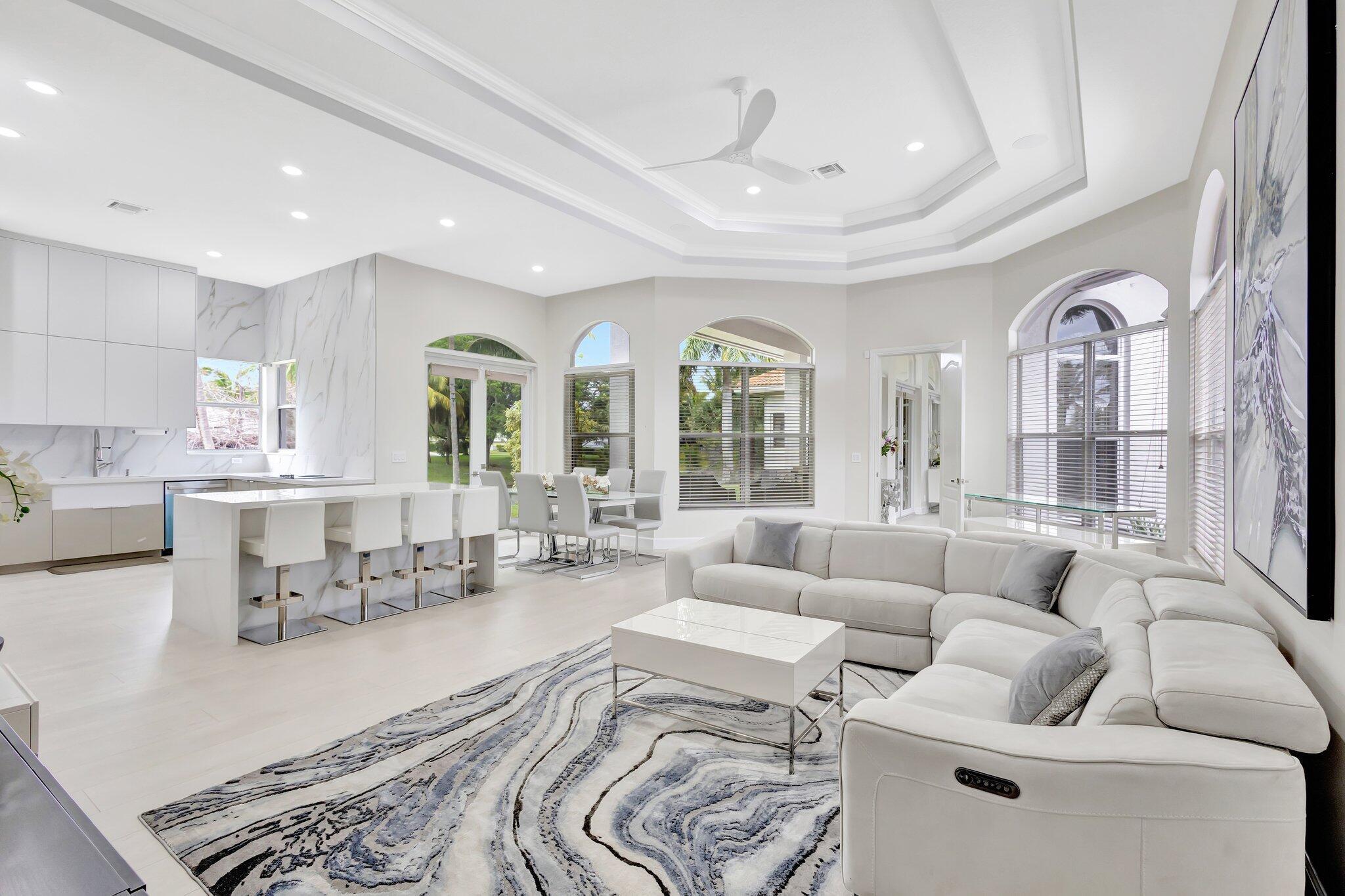 A rare find in the private Whippoorwill Lakes community, this unique estate sits on a spacious 2-acre corner lot. With an elegant portico, two 2-car garages, and a circular driveway lined with royal palms, it offers both style and convenience. Recently renovated, the home features soaring ceilings, a brand-new kitchen, and updated flooring throughout. The split floorplan provides stunning water views, while lush landscaping, including fruit trees, adds to its charm. A perfect blend of comfort and sophistication.