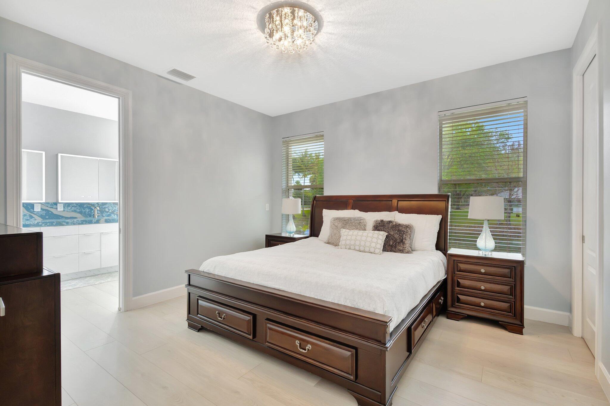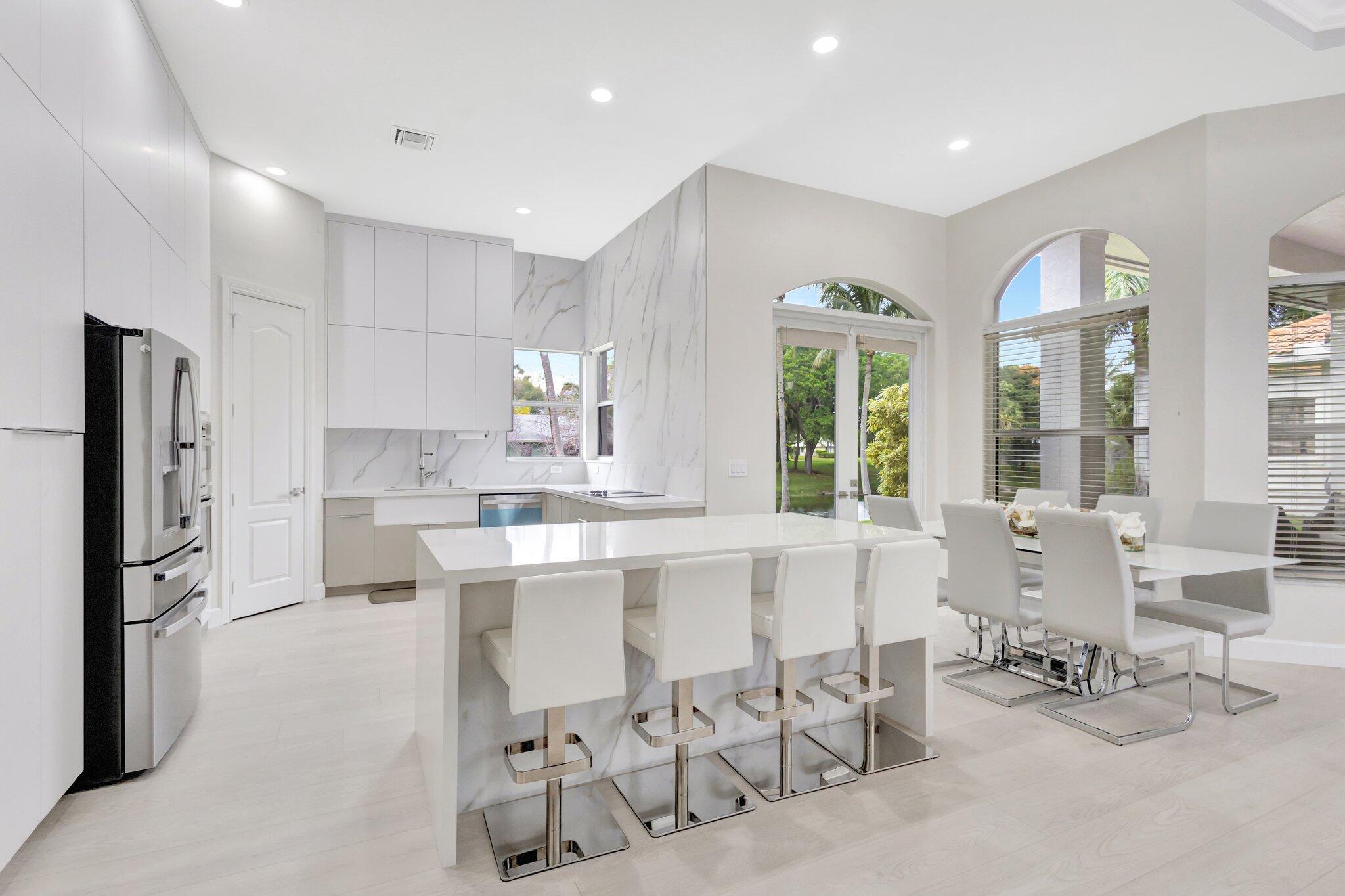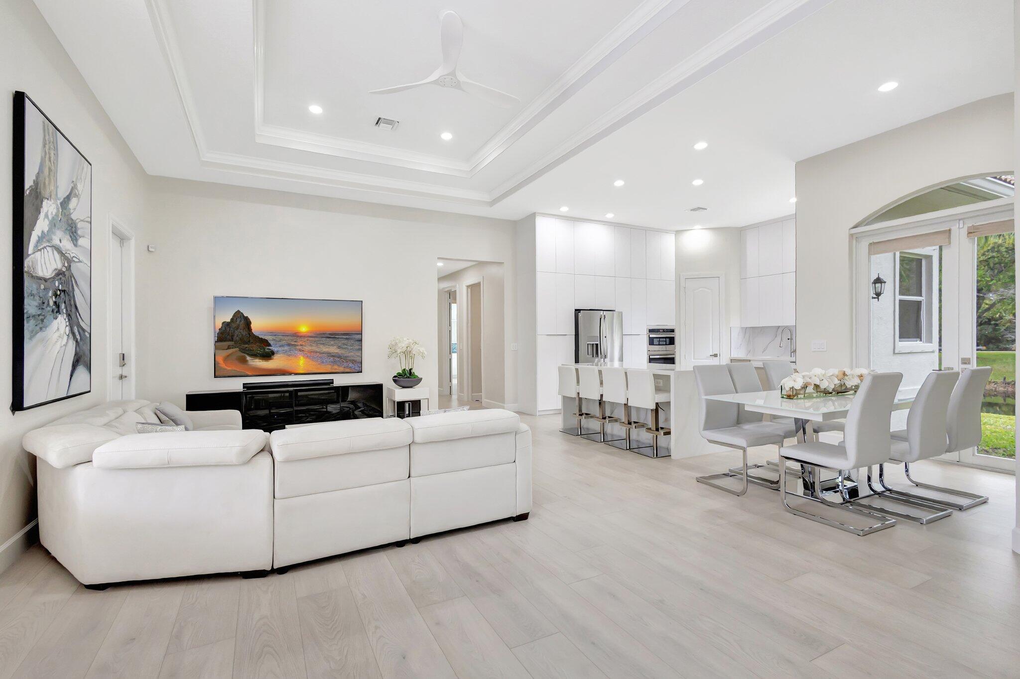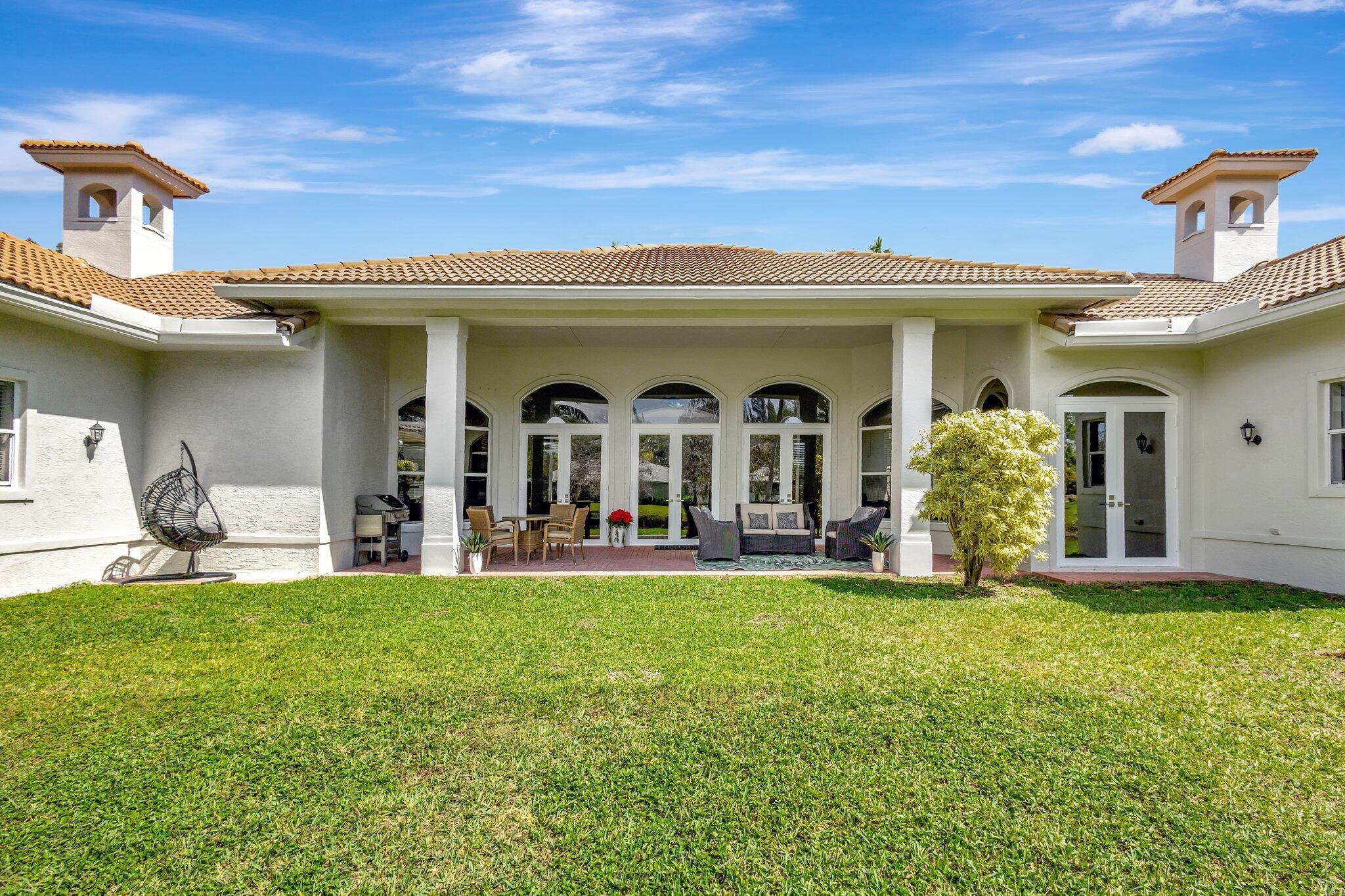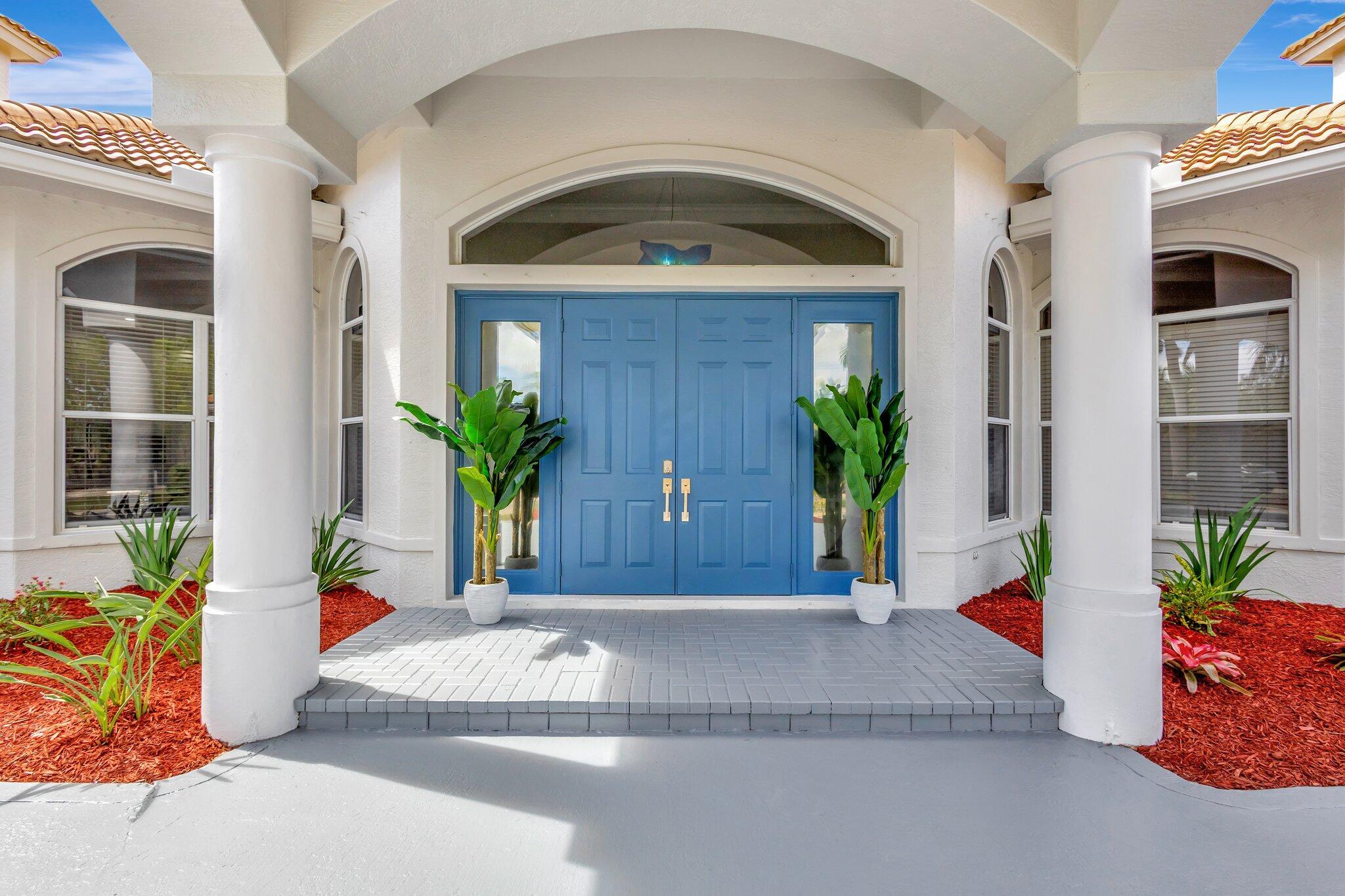 A rare find in the private Whippoorwill Lakes community, this unique estate sits on a spacious 2-acre corner lot. With an elegant portico, two 2-car garages, and a circular driveway lined with royal palms, it offers both style and convenience. Recently renovated, the home features soaring ceilings, a brand-new kitchen, and updated flooring throughout. The split floorplan provides stunning water views, while lush landscaping, including fruit trees, adds to its charm. A perfect blend of comfort and sophistication.