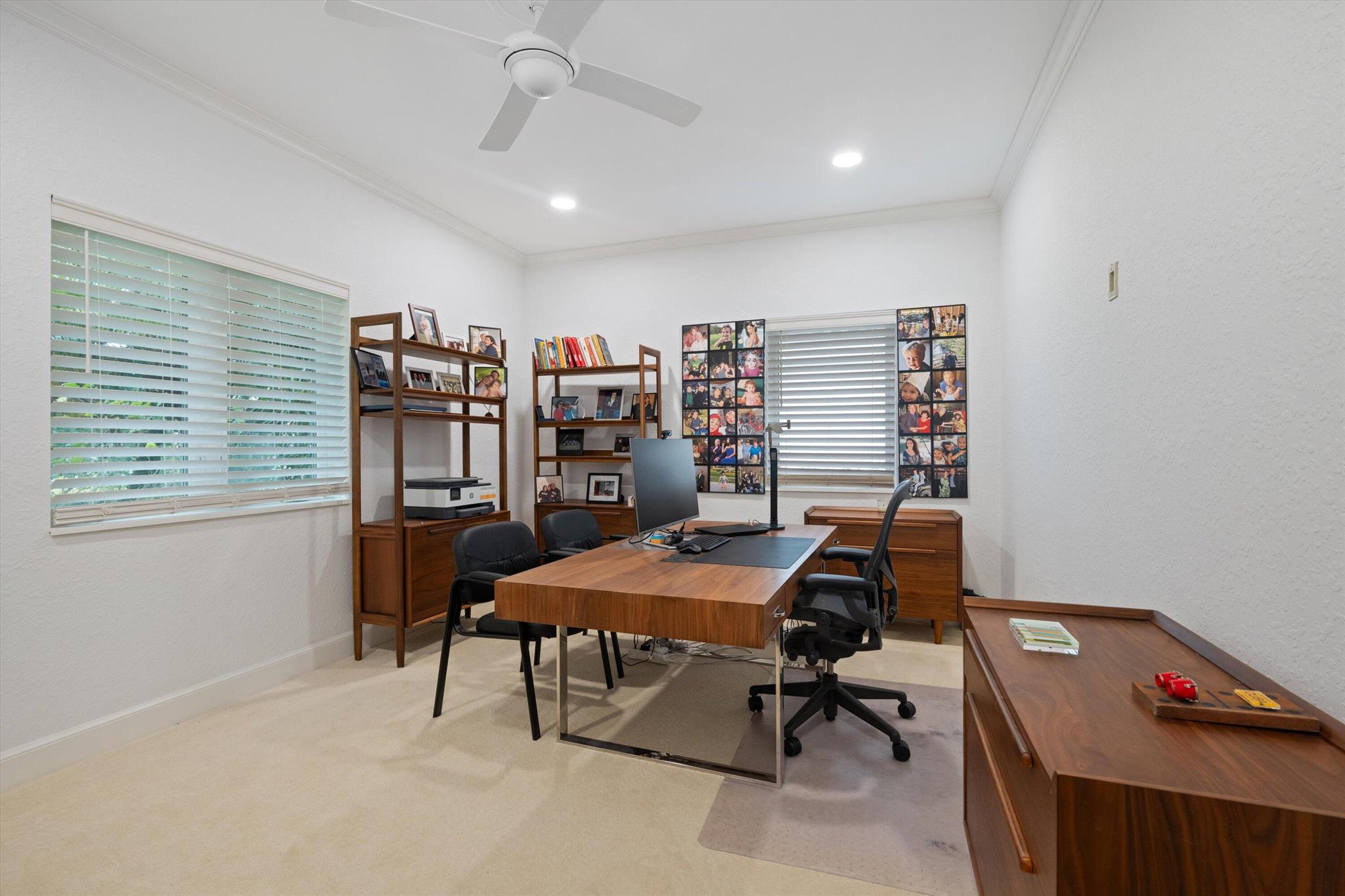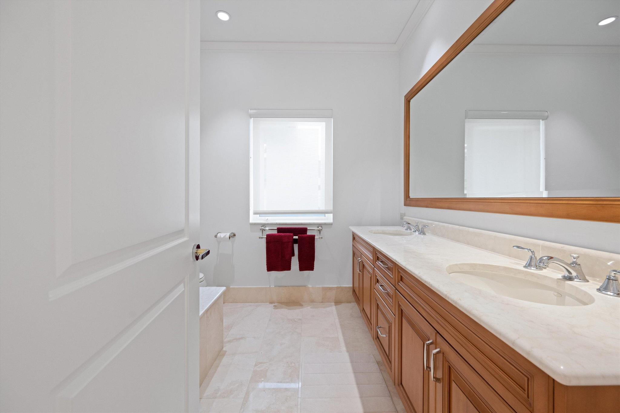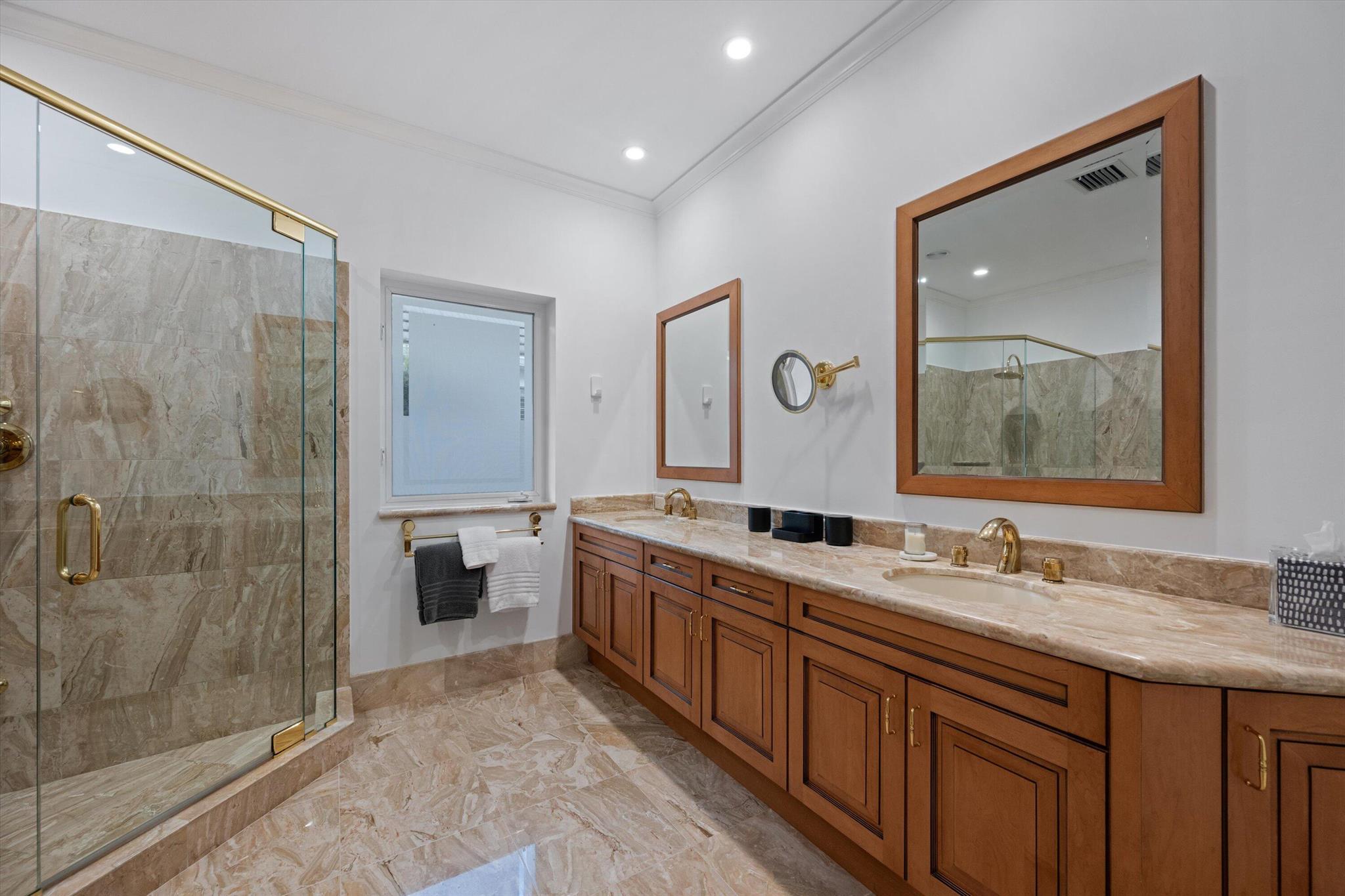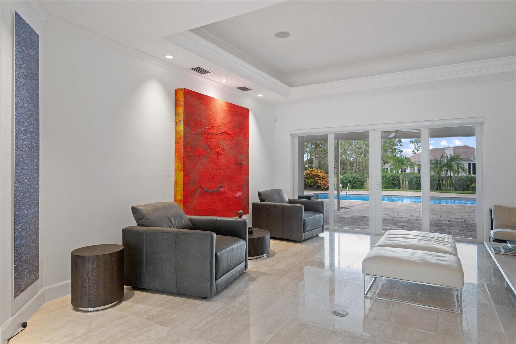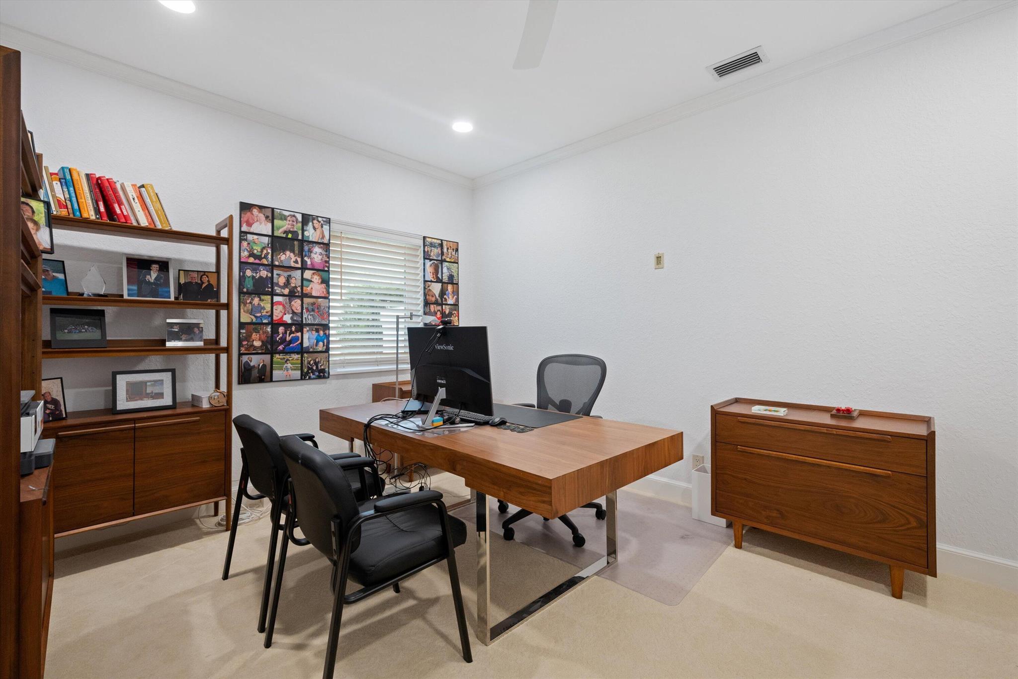 This stunning Palm Beach Bermuda-style home is perfectly positioned on a prime .54-acre lakefront lot in the heart of Breakers West. Move-in ready and impeccably updated, this home offers 3,500+ SF of spacious living, including 3 bedrooms, each with an ensuite bath, an office (or 4th bedroom), and a powder room.Offering impact windows & doors throughout for peace of mind;Gourmet chef's kitchen with custom Irpinia cabinetry, a large center island, granite counters & backsplash.Top-tier appliances: Sub-Zero refrigerator, Miele oven & dishwasher, KitchenAid cooktop.Sunny Living Room with recessed cove lighting, crown molding & sliding doors leading to the outdoor entertaining areaFormal Dining Room conveniently