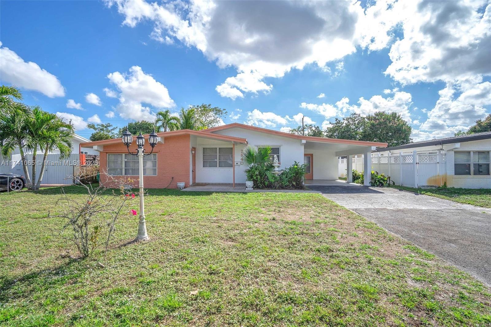 Welcome to this charming 2-bed, 1-bath home with a 1-car carport, spacious driveway, and a separate washer-dryer utility /storage room. Classic terrazzo floors with tons of natural light throughout! The separate living and dining areas create a great flow, while the large backyard offers plenty of space for an abundance of options such as a pool, gardening, to relax and/or entertain. No HOA means more freedom to make it your own! Enjoy peace of mind with a 2017 AC, 2022 water heater, and hurricane panels for storm protection. Conveniently located near shopping, dining, and Hard Rock.