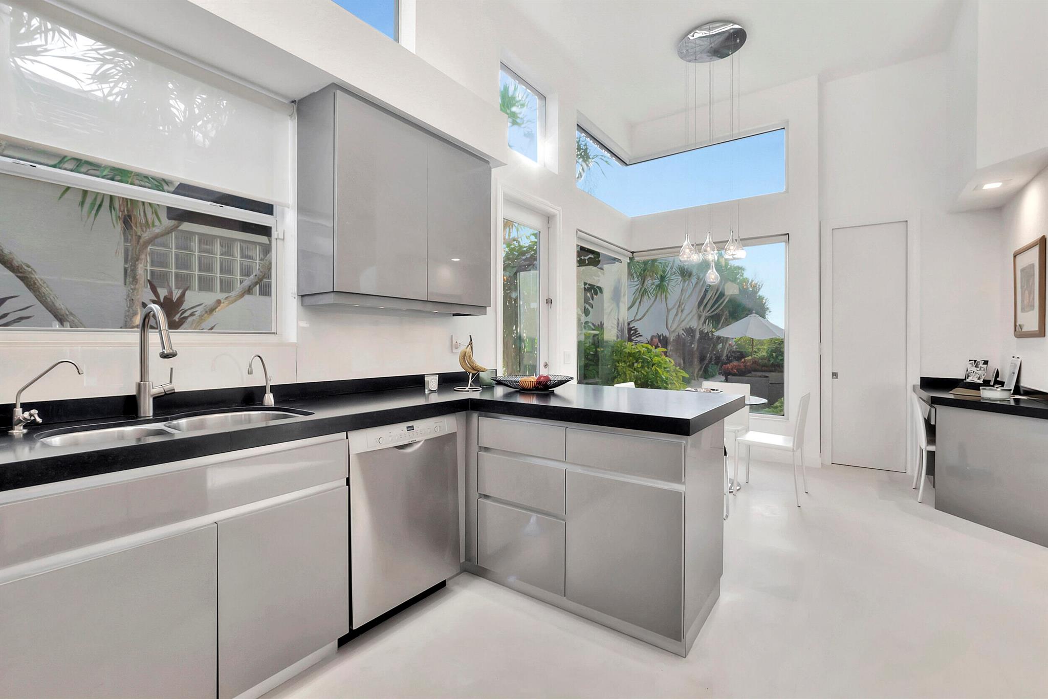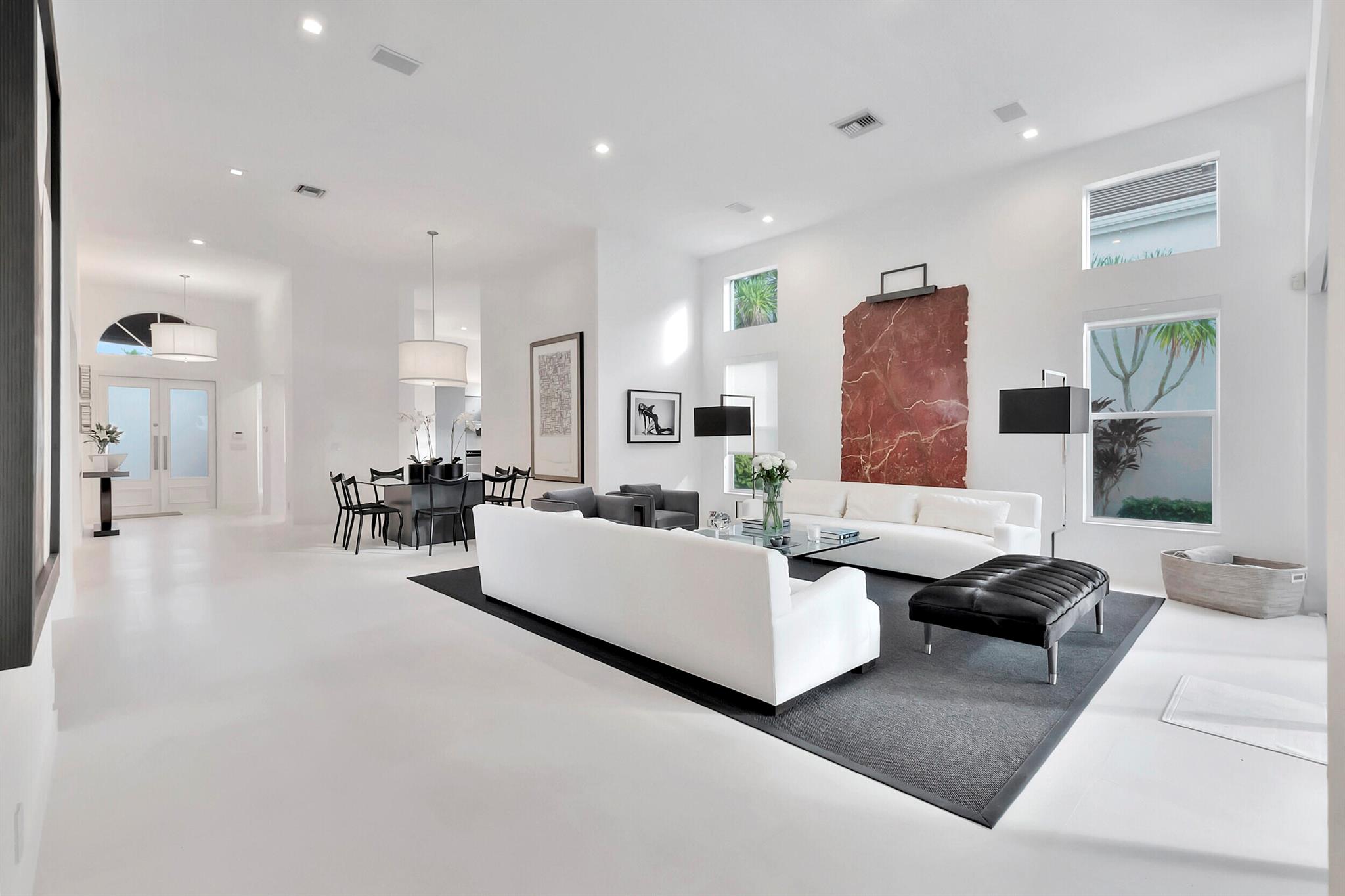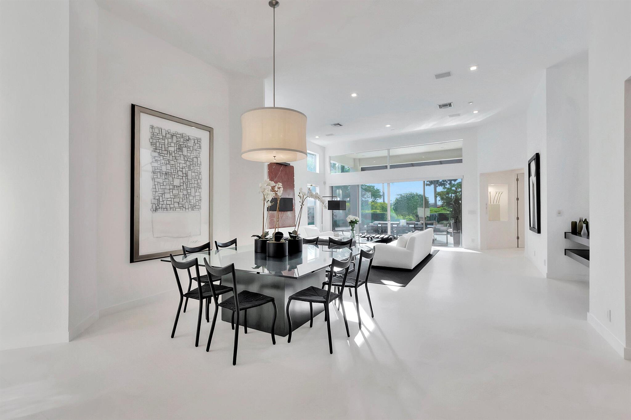 Situated along the golf course, this fully updated 4 BD + den/office / 3.5 BA home in Clubside at Woodfield Country Club offers spectacular views. Vaulted ceilings throughout enhance the sense of space, while sliding doors and expansive windows along the back flood the interior with natural light. White limestone floors create a seamless, open feel, complementing the sleek, modern kitchen outfitted with high-gloss gray cabinetry, dark countertops, and stainless steel finishes. Two stylish dining areas, adorned with chic light fixtures, provide the perfect setting for effortless entertaining and enjoying meals prepared in this stunning culinary space. Outside, the pool area exudes contemporary elegance, featuring a shaded patio ideal for al fresco dining.