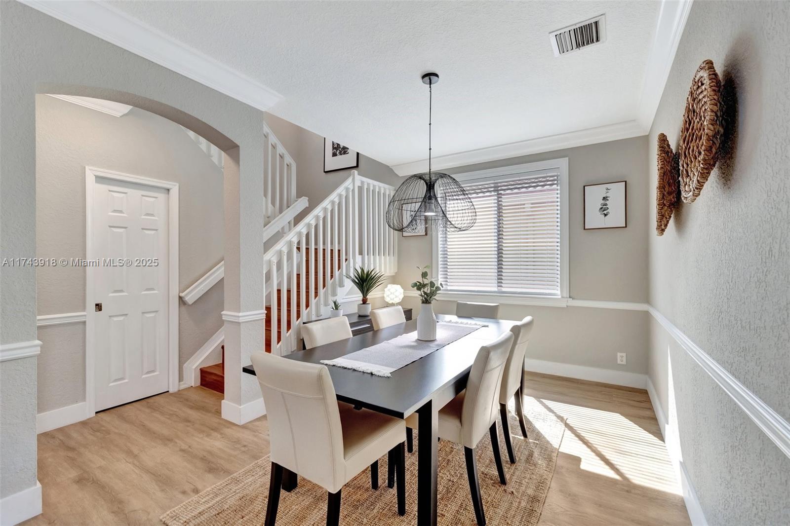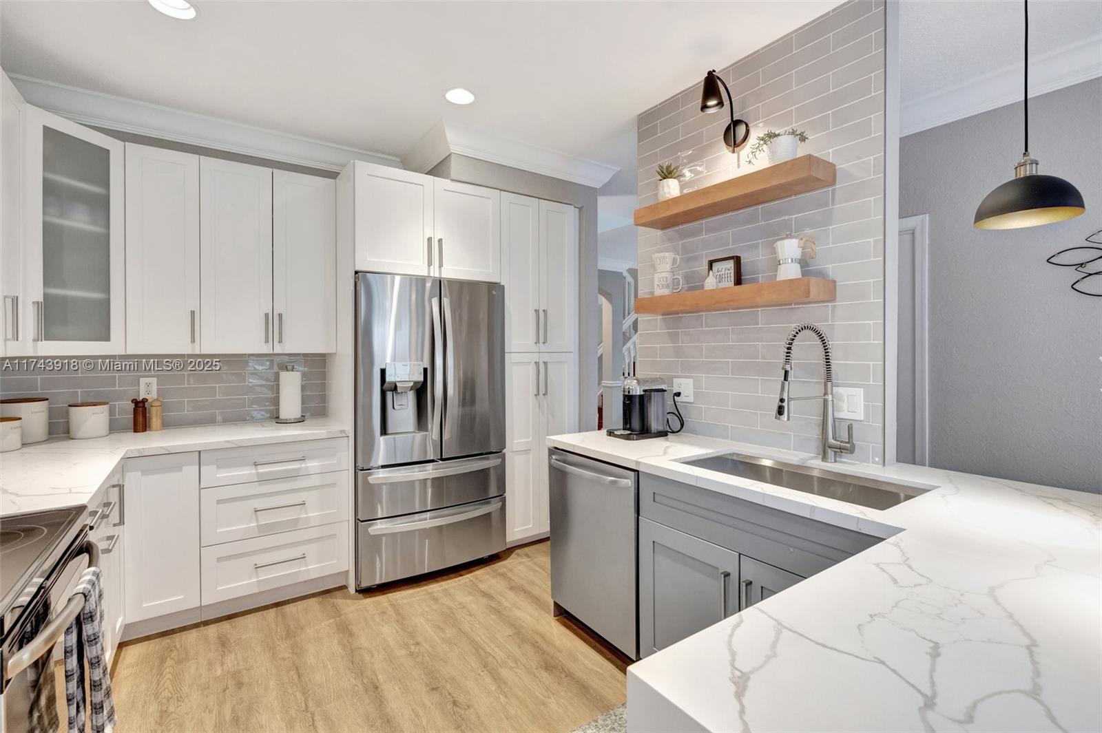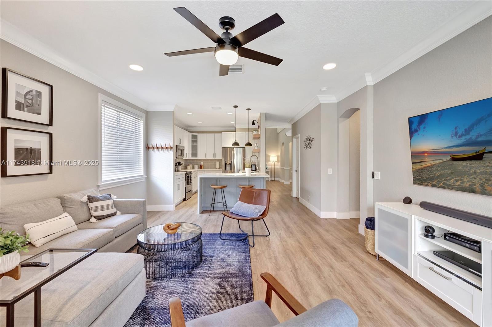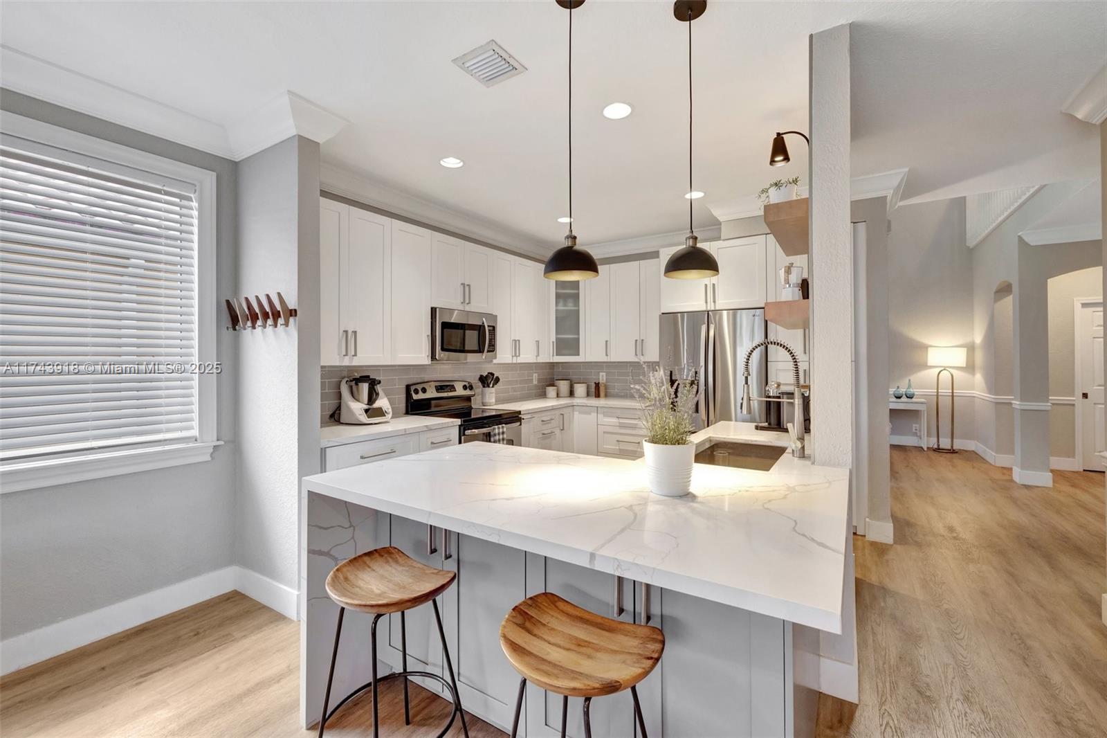 This pristine residence showcases the sought-after Windmill Elite floorplan, featuring upgrades that make this property truly exceptional. High ceilings & elegant foyer welcome you home, leading into the formal living area. Beautifully renovated kitchen meets the highest standards of modern style & functionality. Quartz counters, waterfall edge, two-tone cabinetry in crisp white & sophisticated grey, pullouts, new LG fridge, storage beneath island. Primary suite on 1st floor. Half-bath & 2nd bath renovated. New flooring, baseboards, light fixtures & dimmers. Laundry w/new dryer. Crown molding, trim around windows. Sliding doors to patio & a cozy seating space. New 5-ton A/C. Hurricane shutters, impact front door, workbench in garage perfect for DIY. Your exquisite living experience awaits!