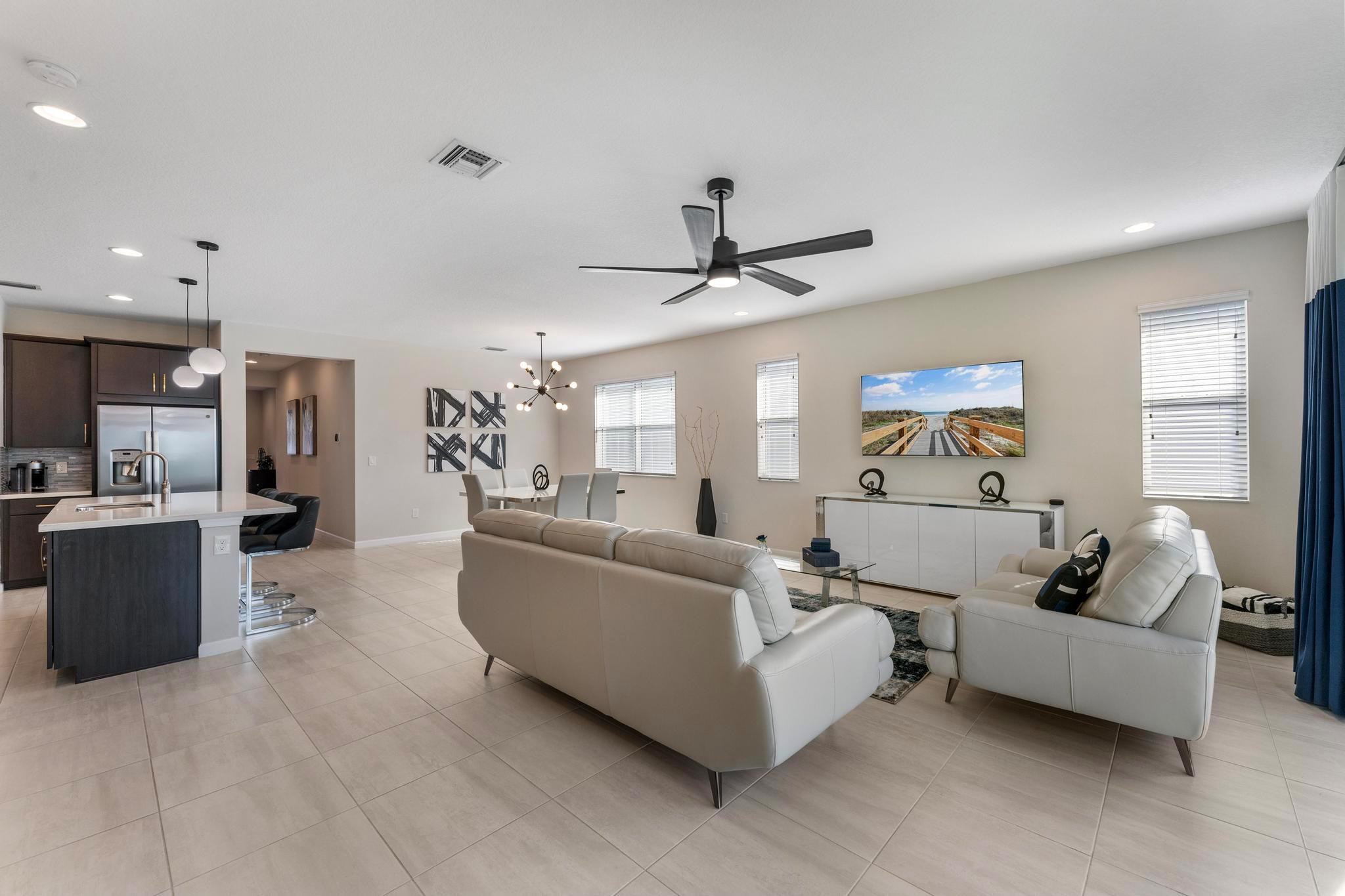 Step into this stunning 3-bedroom, 2-bathroom home with a 2-car garage, where modern design meets comfort. Built in 2021, this property features an open concept layout with high ceilings, creating an inviting and spacious atmosphere. The eat-in kitchen features dark wood cabinets, quartz countertops, a beautiful backsplash, stainless steel appliances, and a generously sized walk-in pantry. The ample-sized primary bedroom is connected to the primary bath featuring double sinks, a well-sized walk-in shower, linen closet, and a large walk-in closet for added convenience. Step outside to the expansive backyard, perfect for entertaining or unwinding. This home is the only one offering direct views of the lake and fountain, providing a peaceful and picturesque backdrop that's truly unique.