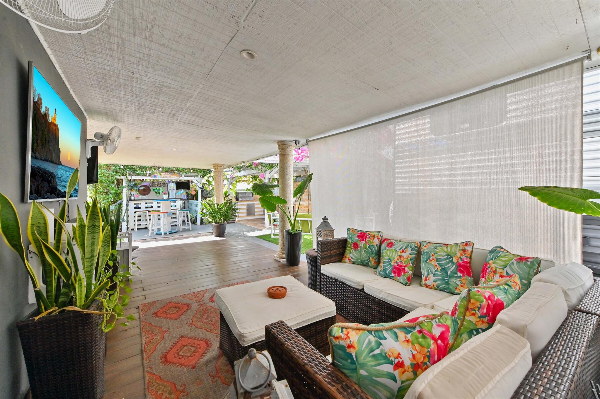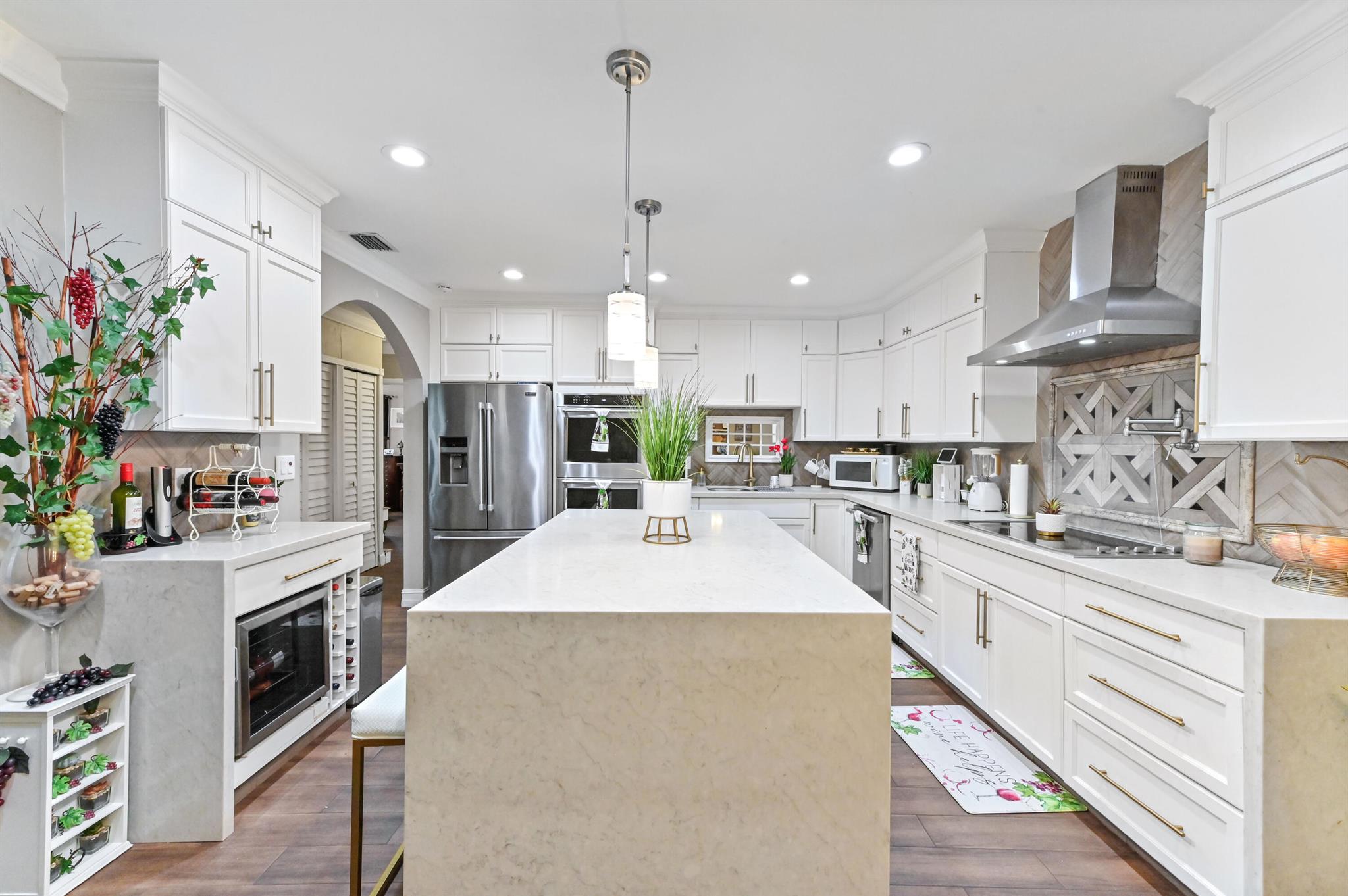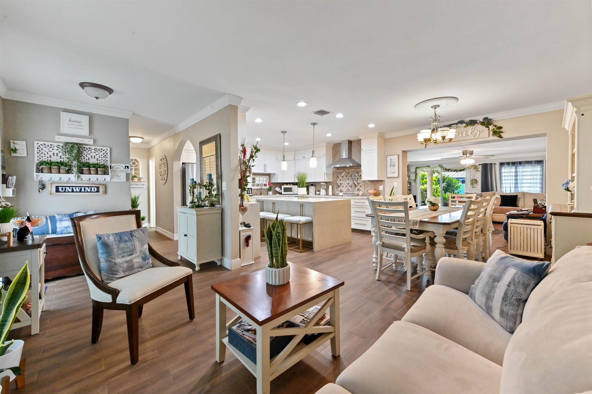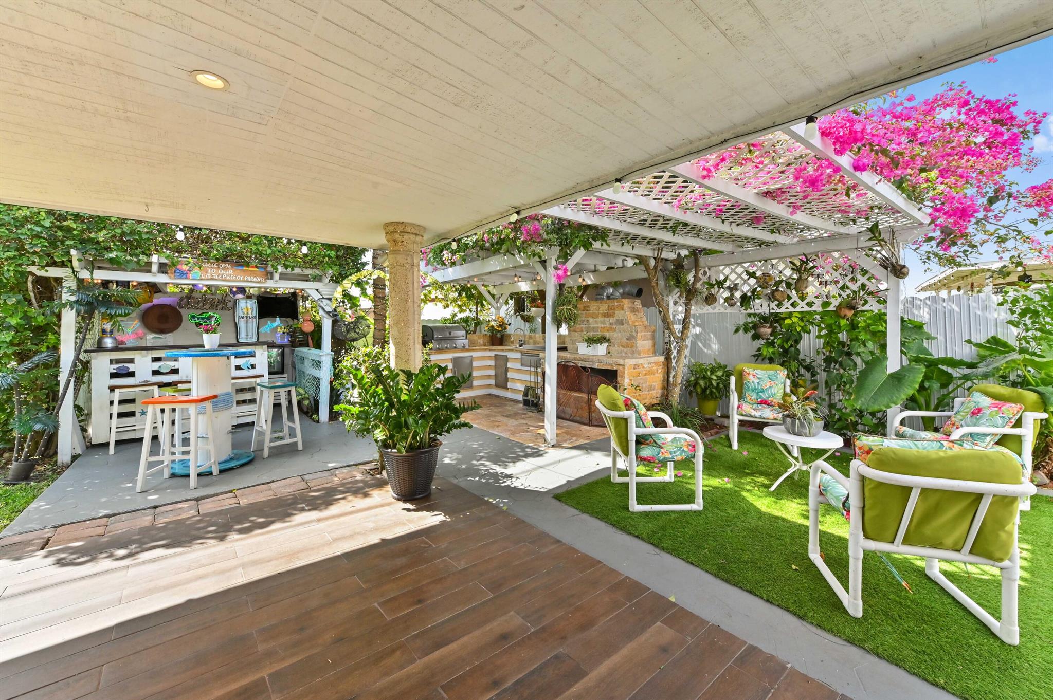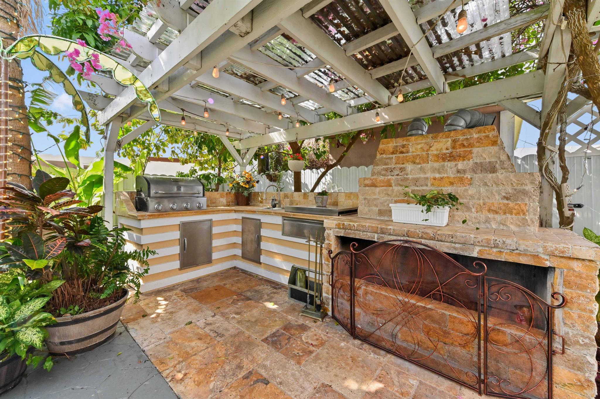 This meticulously renovated 2-bedroom, 2.5-bathroom home offers 1,383 sq ft of entry-level living space, ideal for everyday living. Outdoor features an oasis perfect for entertaining with a summer kitchen, covered seating with TVs and a bar. Inside you are welcomed with a living, dining and family room providing a welcoming atmosphere, while the kitchen features a stylish island with seating, perfect for casual dining or entertaining. Enjoy cooking with a cooktop stove and double-wall oven. The property also includes a washer and dryer for added convenience.Step outside to a fenced backyard with plenty of room for a potential pool and a garden patio, creating a private retreat. The home features a summer kitchen and a wet bar for outdoor entertaining.