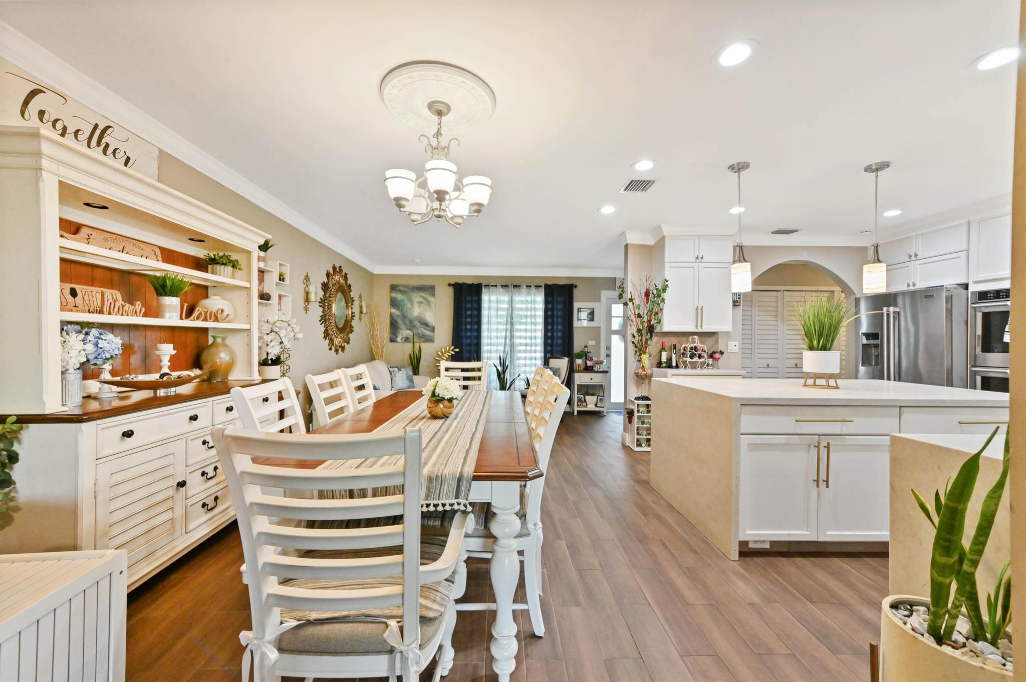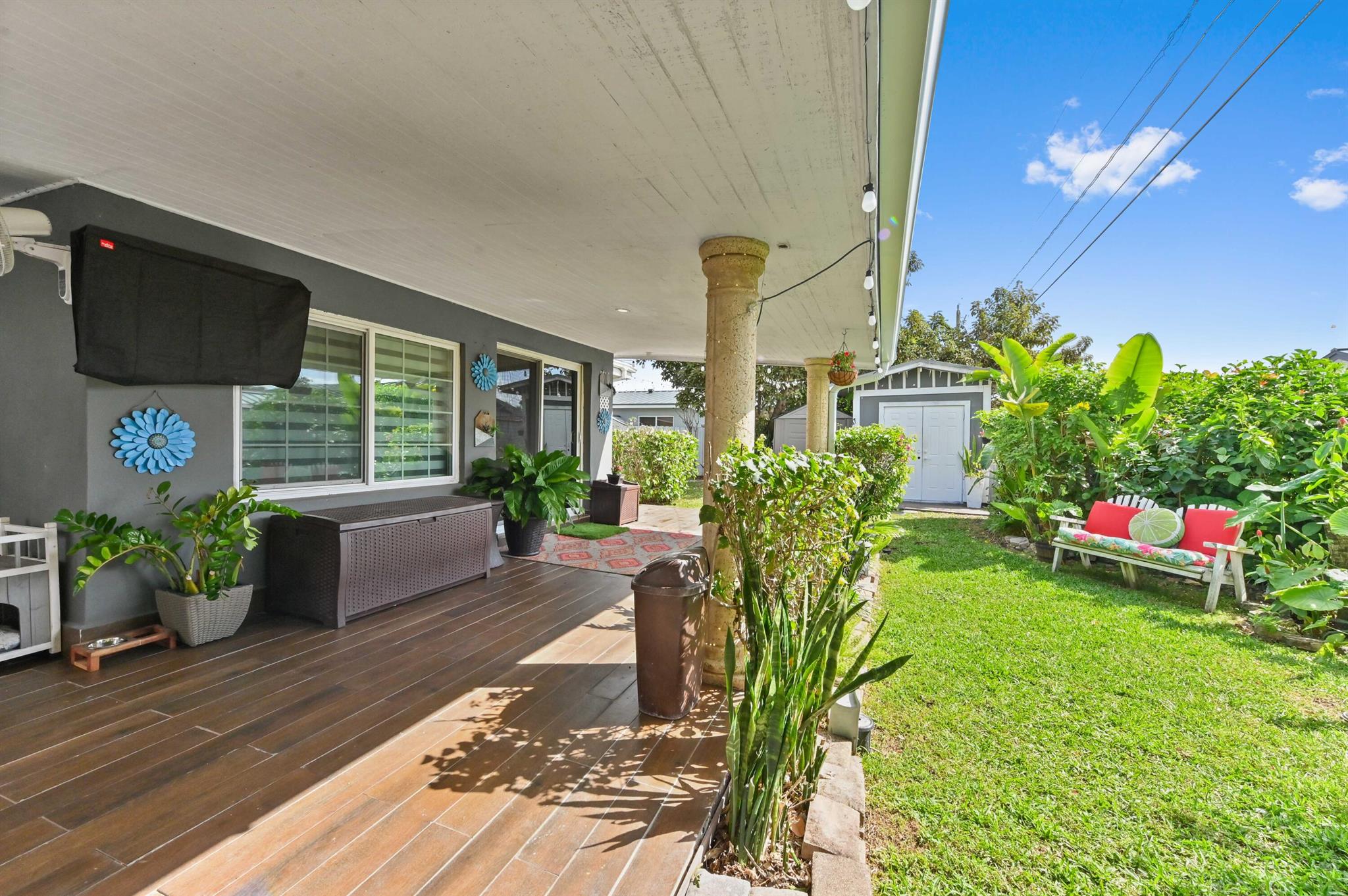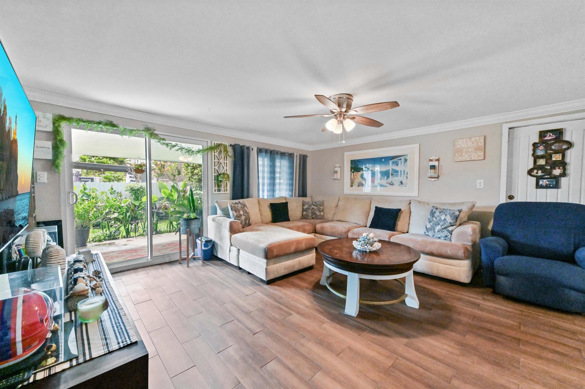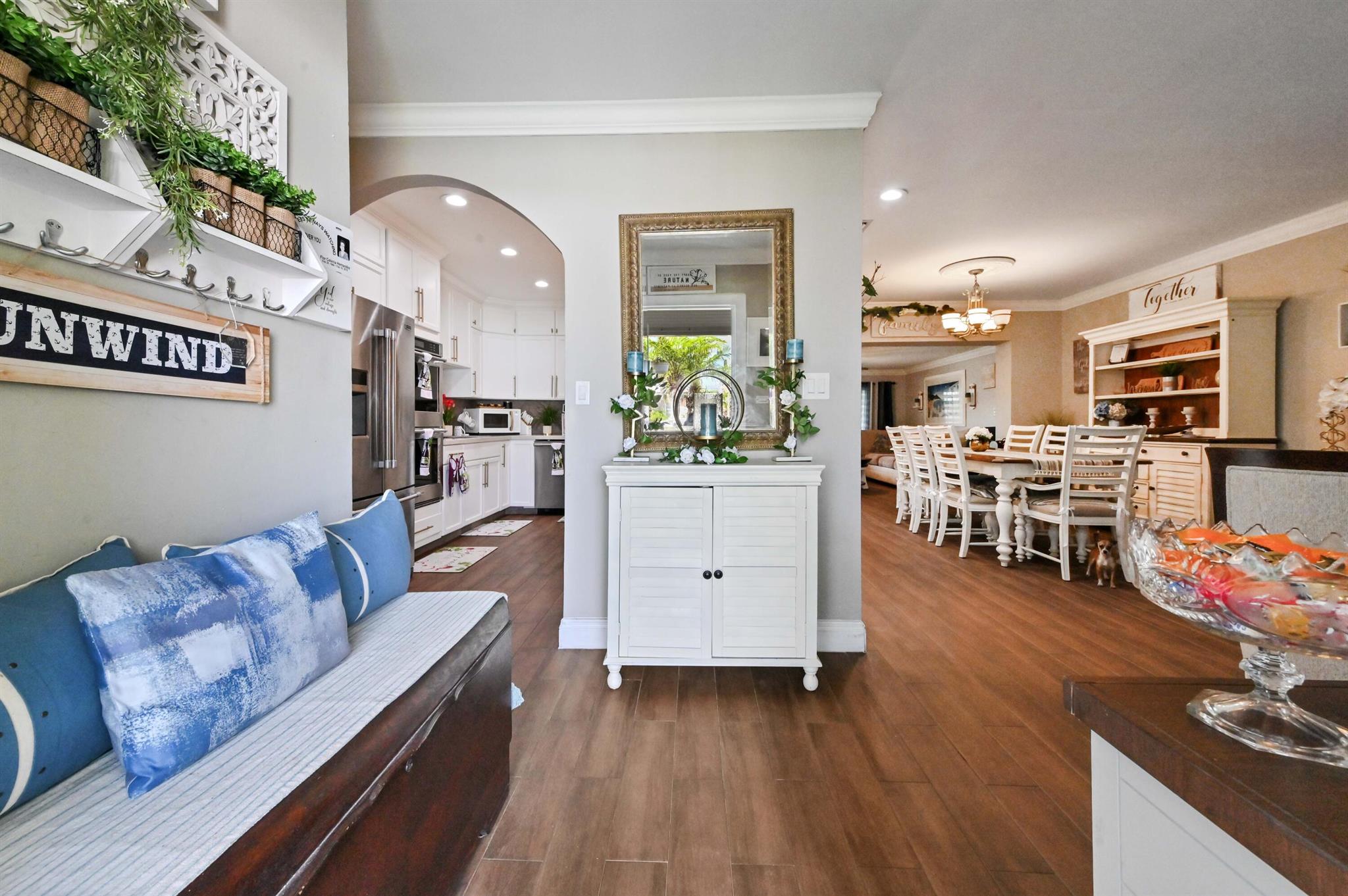 This meticulously renovated 2-bedroom, 2.5-bathroom home offers 1,383 sq ft of entry-level living space, ideal for everyday living. Outdoor features an oasis perfect for entertaining with a summer kitchen, covered seating with TVs and a bar. Inside you are welcomed with a living, dining and family room providing a welcoming atmosphere, while the kitchen features a stylish island with seating, perfect for casual dining or entertaining. Enjoy cooking with a cooktop stove and double-wall oven. The property also includes a washer and dryer for added convenience.Step outside to a fenced backyard with plenty of room for a potential pool and a garden patio, creating a private retreat. The home features a summer kitchen and a wet bar for outdoor entertaining.