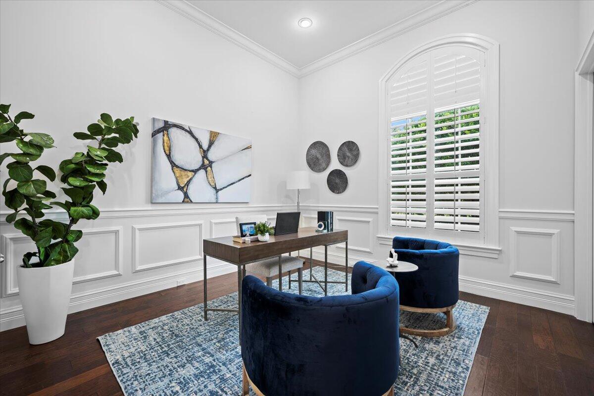 Welcome to 5775 Lady Luck Road, an exquisite property located in the tranquil Steeplechase community. This transitional home effortlessly combines modern features with timeless design on a sprawling 1.17 acre lot. Situated on the corner of Steeplechase Drive and Lady Luck Road, the home offers 5,800 square feet of expansive living space, with soaring ceilings, regal arched hallways, five en-suite bedrooms, a dedicated office, three garage bays, luxurious kitchen, salt water pool, an upstairs bonus space and much more. As you enter the home from the convenient half circle-driveway you will be greeted with a stunning, solid-wood double door entry as you step into the foyer overlooking an inviting formal entertainment area with sweeping views of the pool and the fully fenced backyard.
