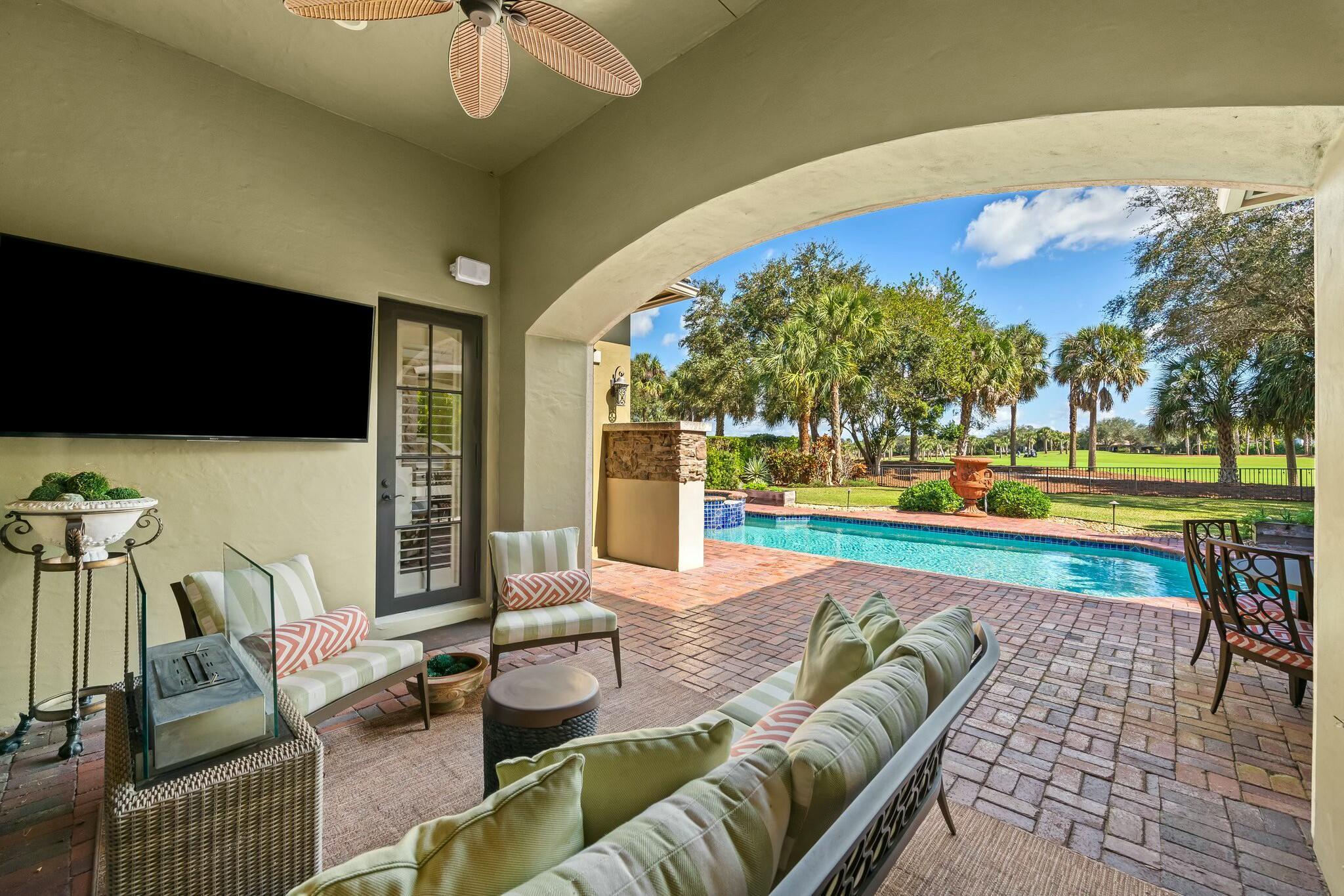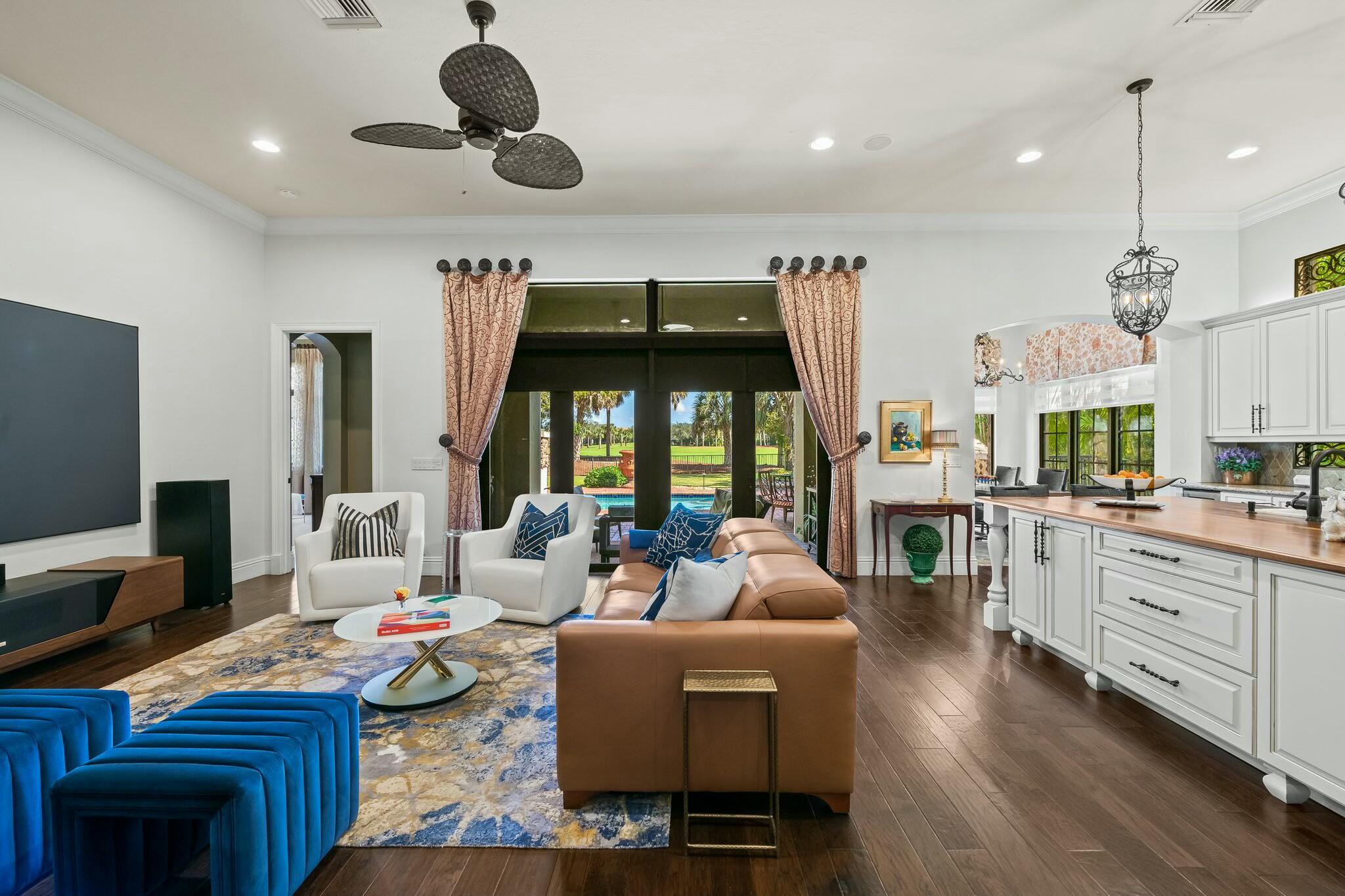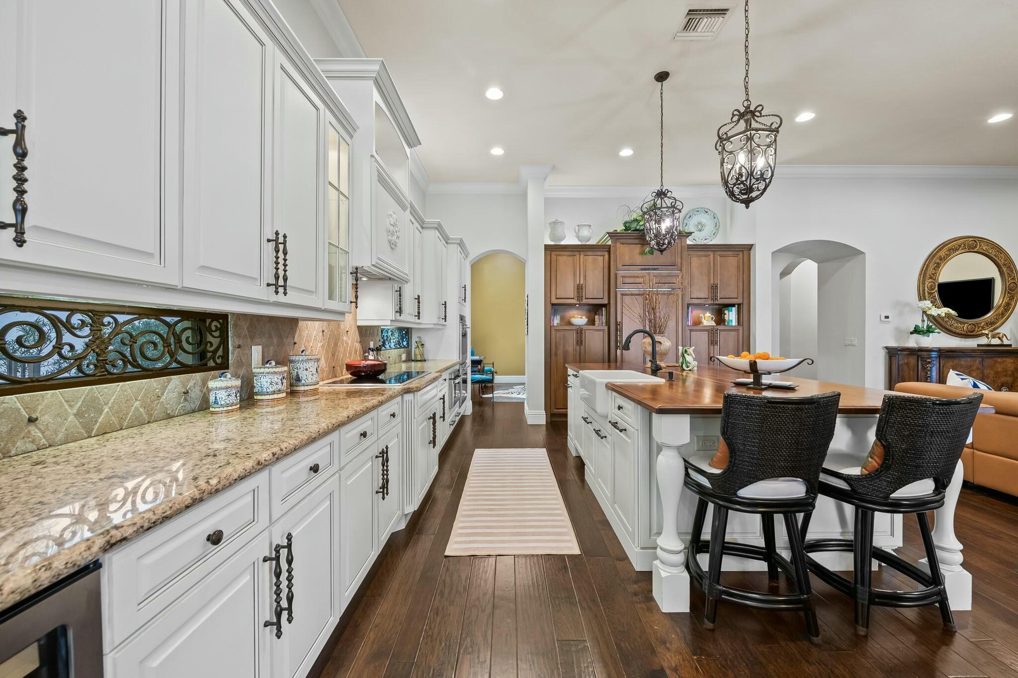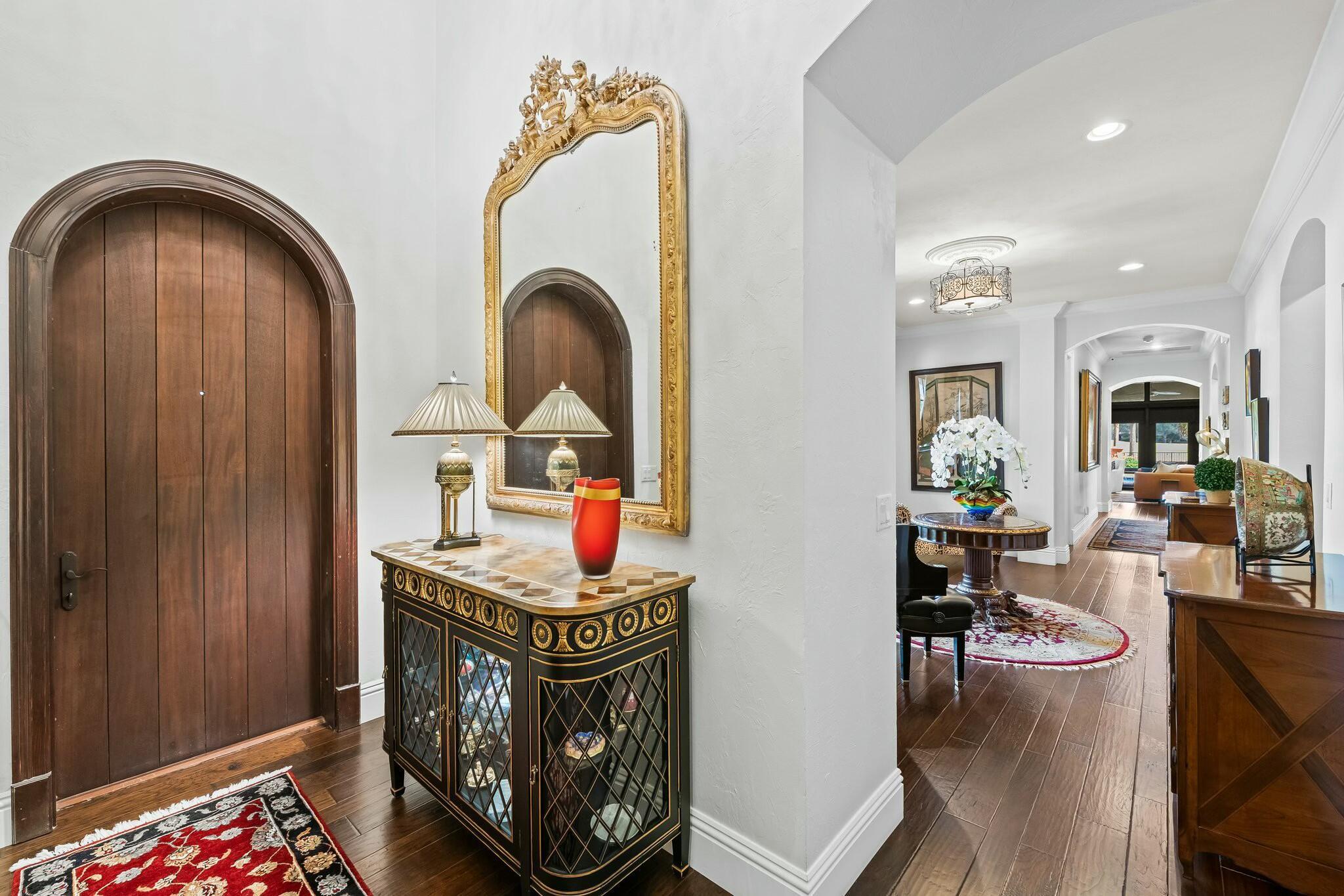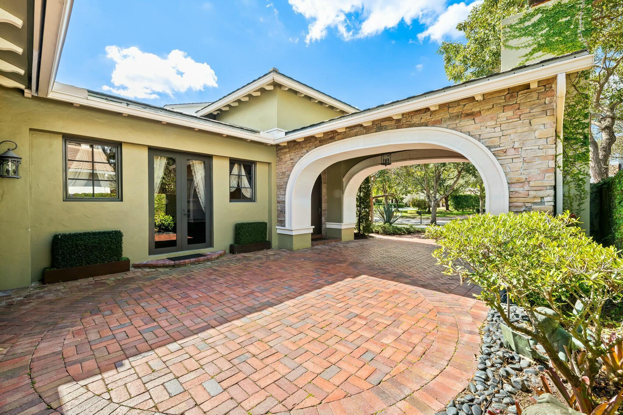 Welcome to this stunning home, located on a tranquil cul-de-sac with spectacular double fairway golf views and a spacious fenced lot. The entryway features a charming private porte-cochere and outdoor fireplace, offering a luxurious welcome. Inside, the home is beautifully renovated with elegant wood doors and flooring across the living areas, enhancing its warmth and grandeur. The gourmet kitchen is a chef's dream, equipped with high-end Wolf induction cooktop and ovens, a Miele dishwasher, a SubZero refrigerator, and ample storage with pull-out drawers and a large island perfect for entertaining. This thoughtfully designed single-story open floor plan includes a guest wing at the front and an expansive primary suite at the rear, both offering delightful views of the pool & golf course.