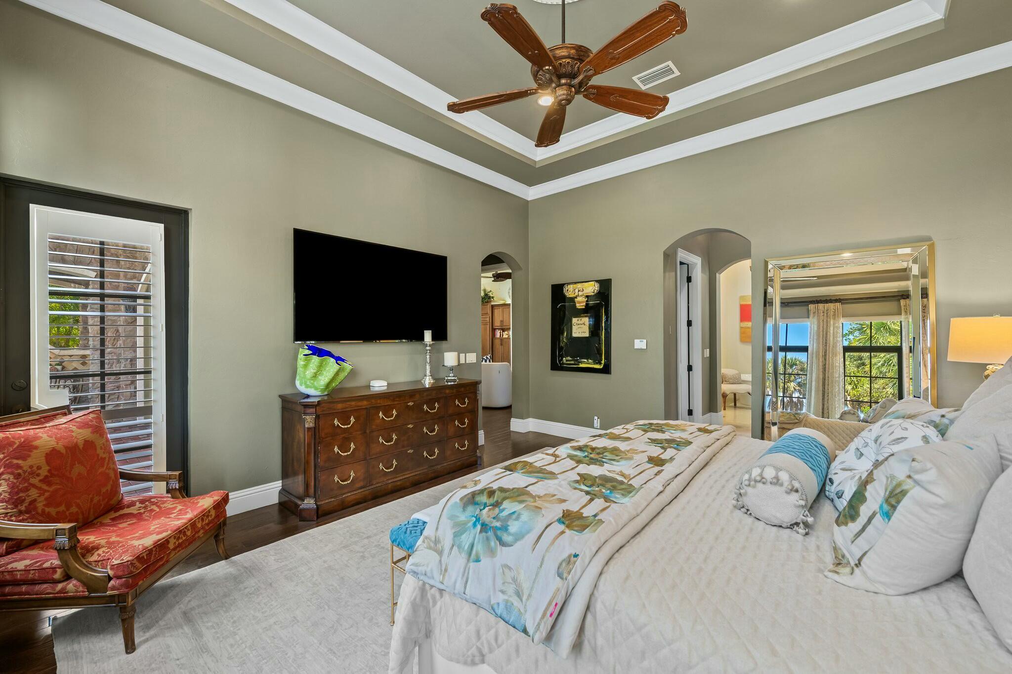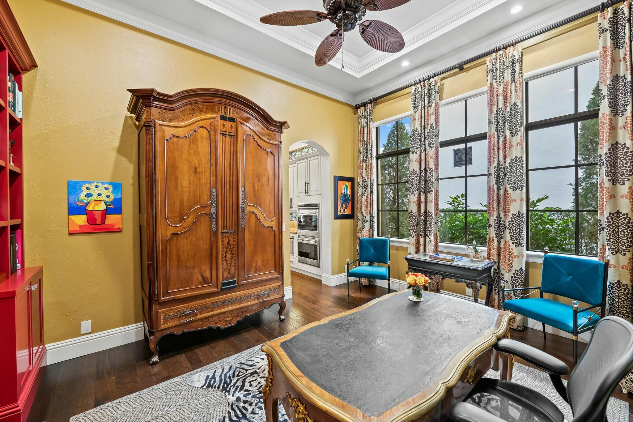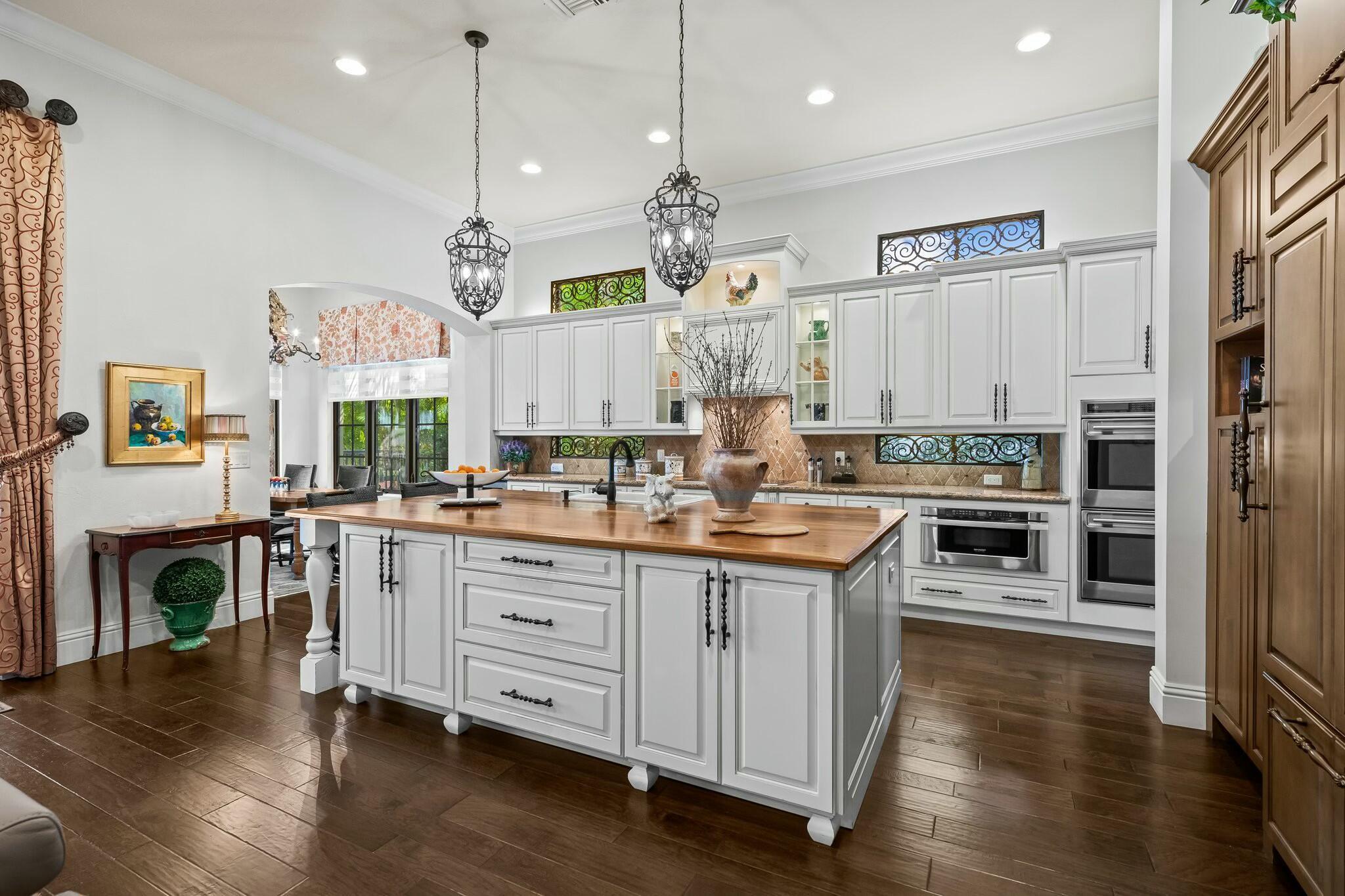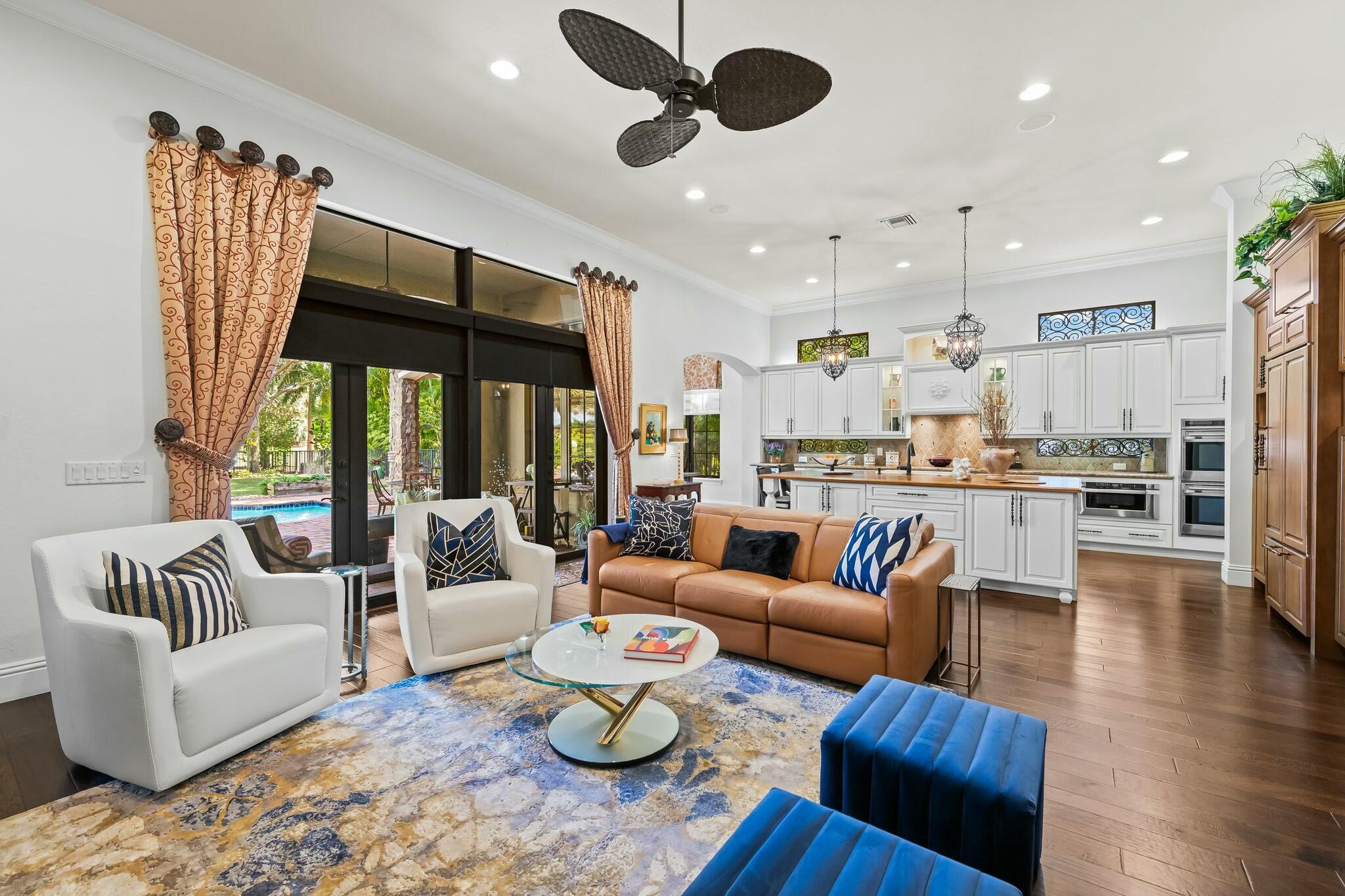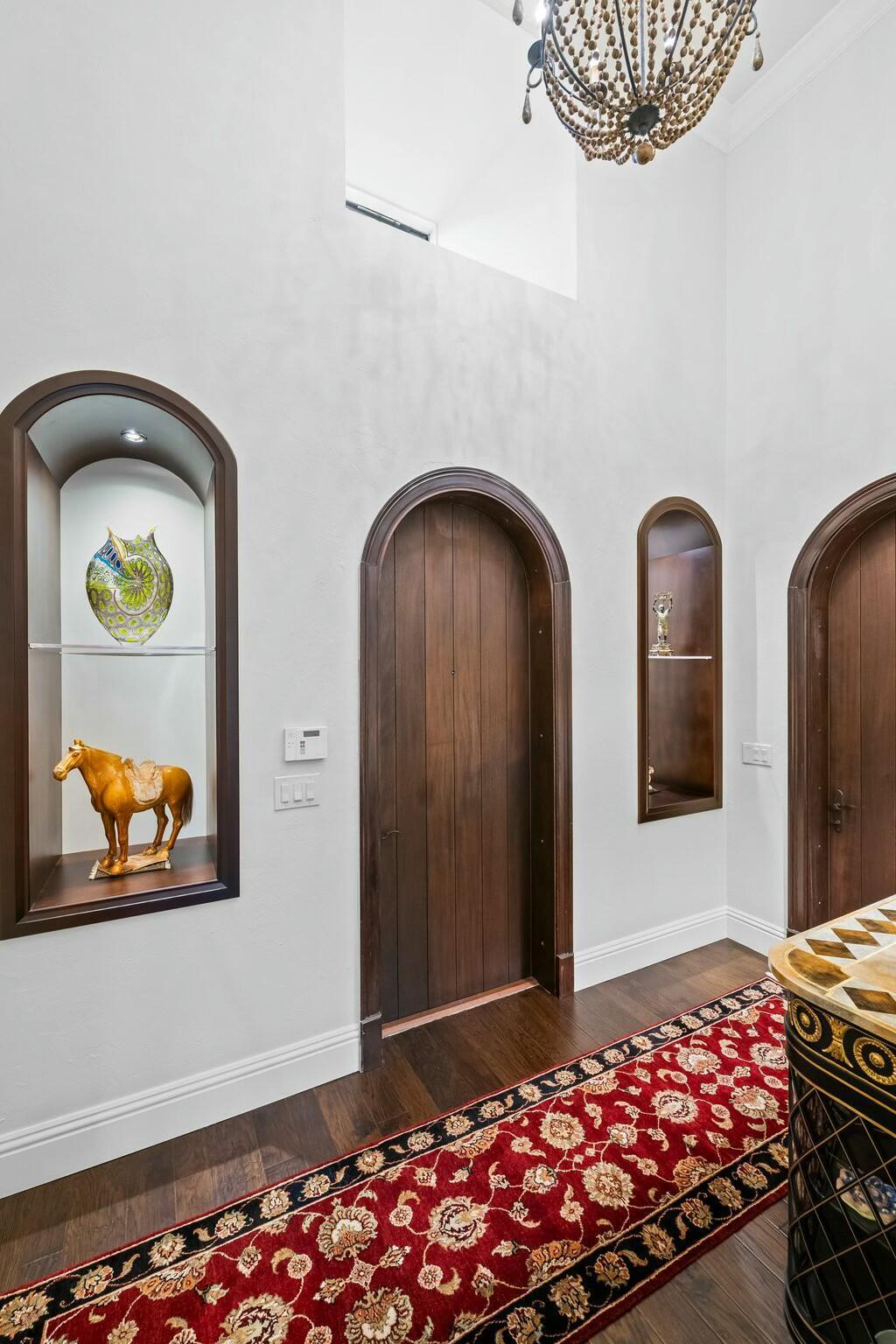 Welcome to this stunning home, located on a tranquil cul-de-sac with spectacular double fairway golf views and a spacious fenced lot. The entryway features a charming private porte-cochere and outdoor fireplace, offering a luxurious welcome. Inside, the home is beautifully renovated with elegant wood doors and flooring across the living areas, enhancing its warmth and grandeur. The gourmet kitchen is a chef's dream, equipped with high-end Wolf induction cooktop and ovens, a Miele dishwasher, a SubZero refrigerator, and ample storage with pull-out drawers and a large island perfect for entertaining. This thoughtfully designed single-story open floor plan includes a guest wing at the front and an expansive primary suite at the rear, both offering delightful views of the pool & golf course.
