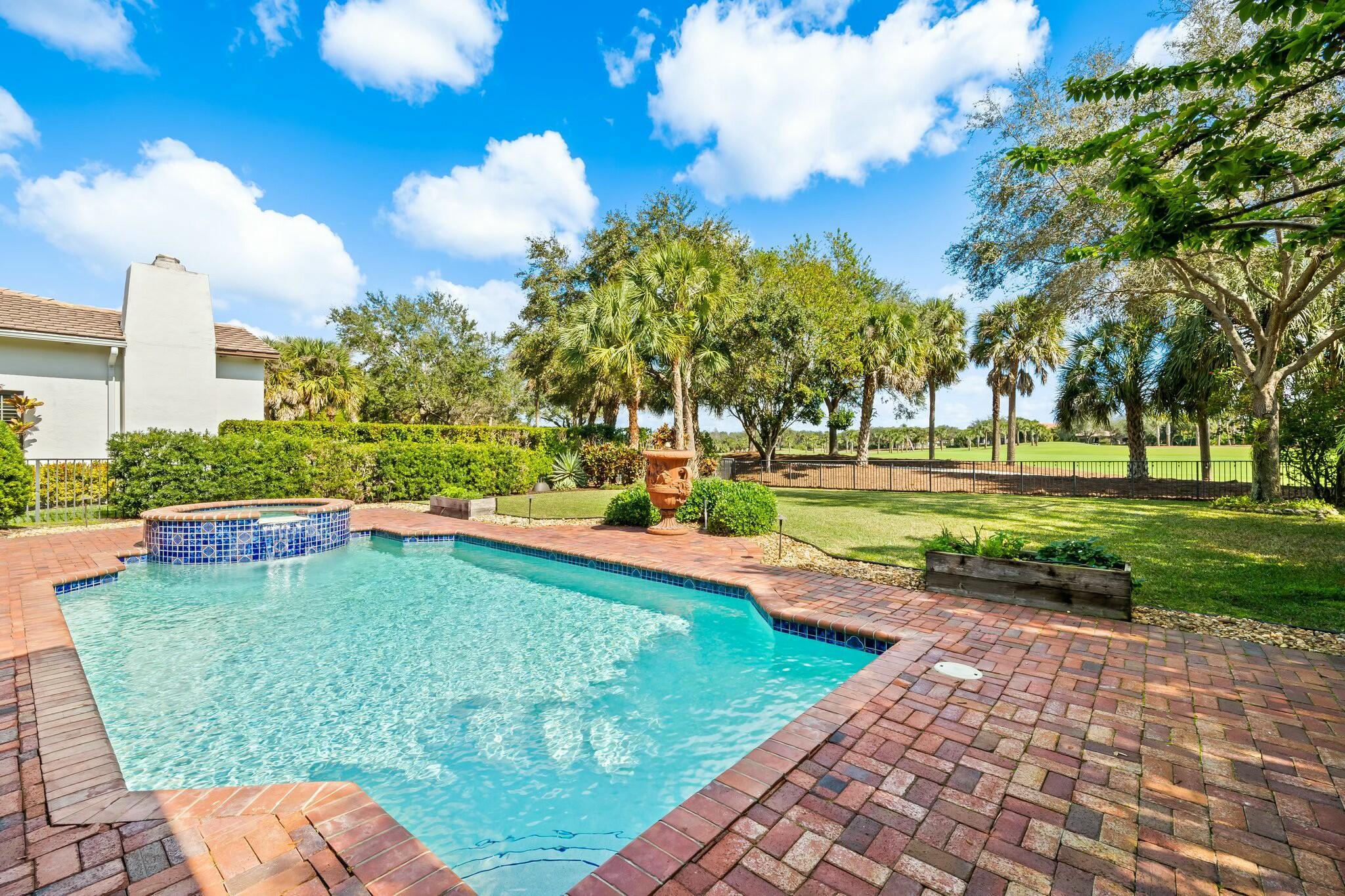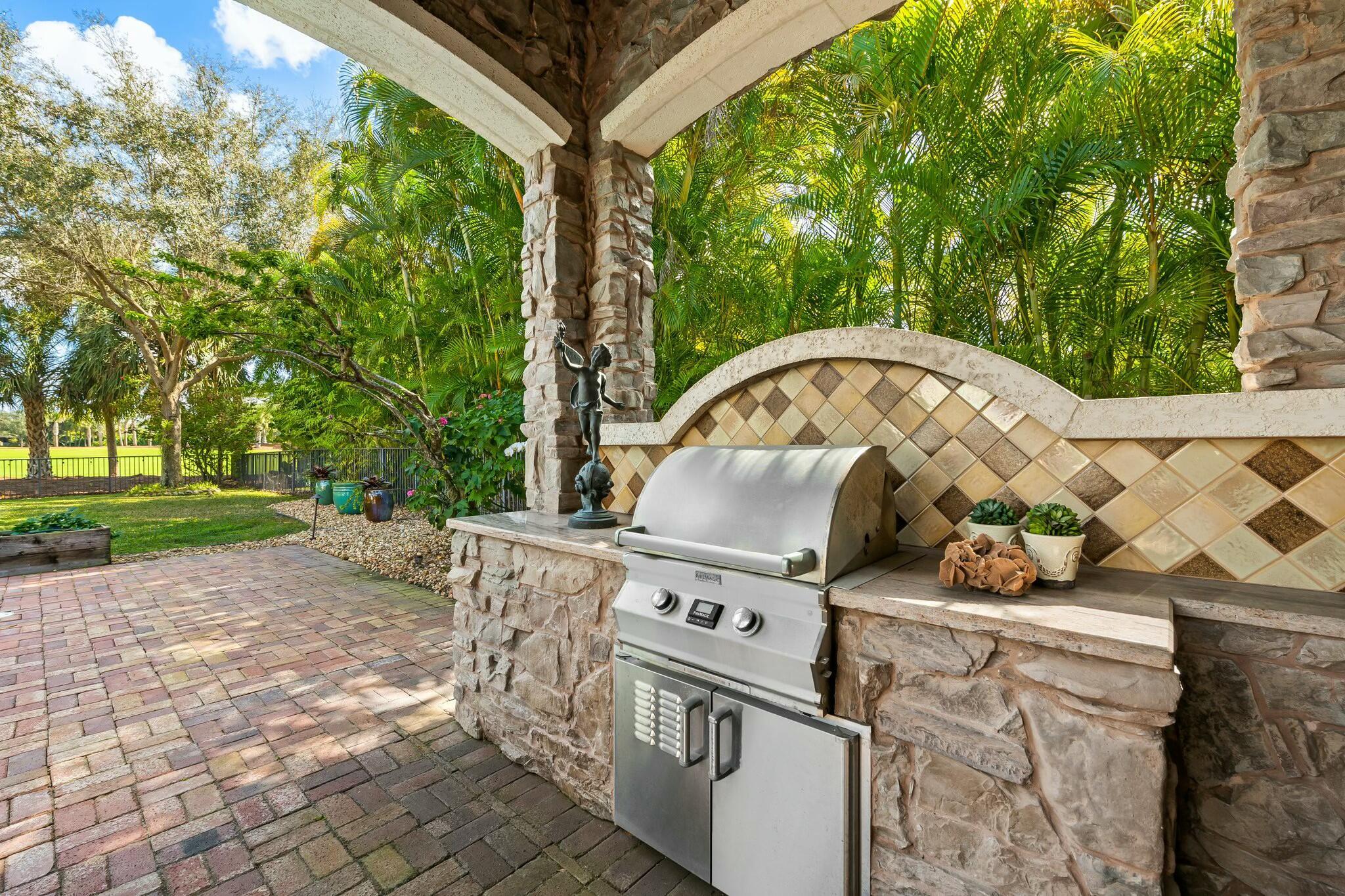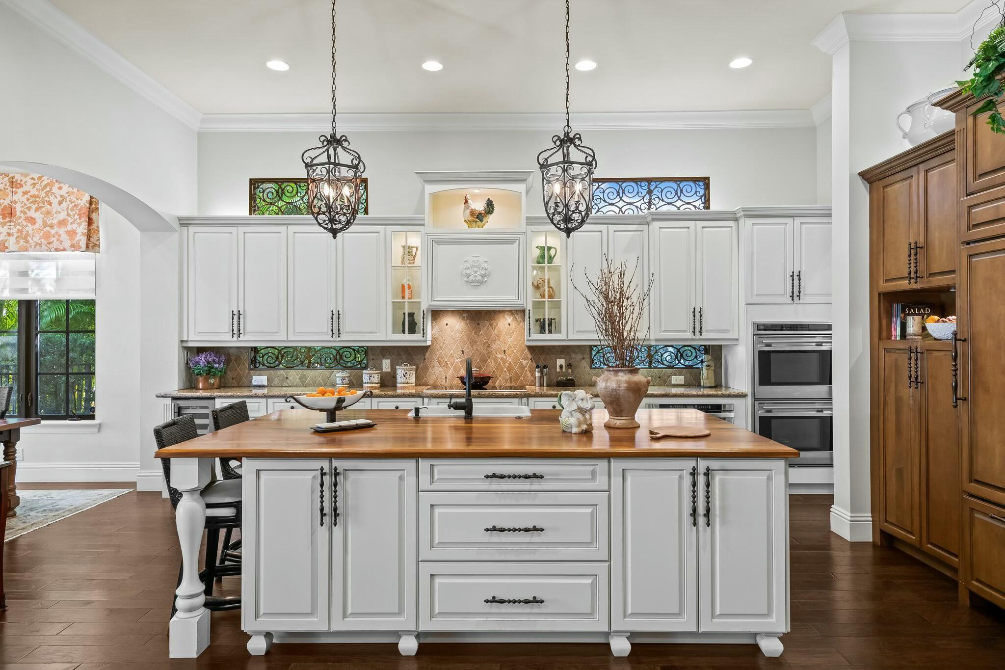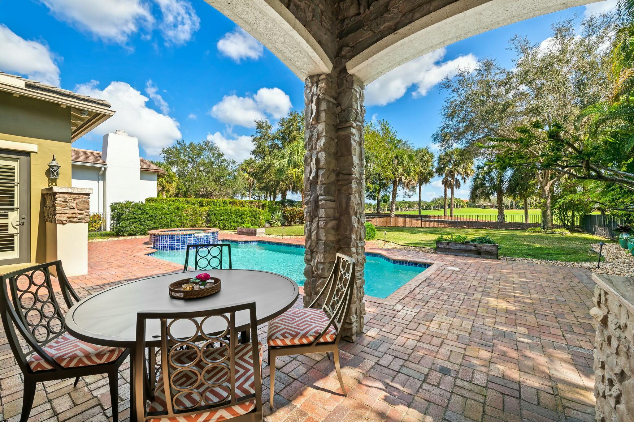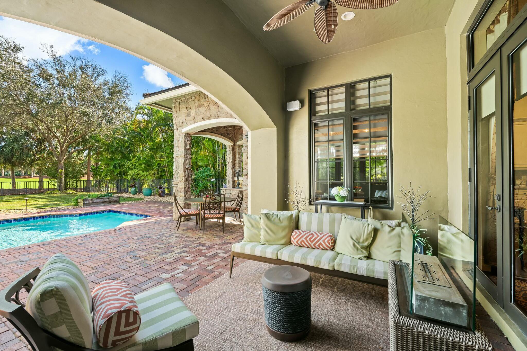 Welcome to this stunning home, located on a tranquil cul-de-sac with spectacular double fairway golf views and a spacious fenced lot. The entryway features a charming private porte-cochere and outdoor fireplace, offering a luxurious welcome. Inside, the home is beautifully renovated with elegant wood doors and flooring across the living areas, enhancing its warmth and grandeur. The gourmet kitchen is a chef's dream, equipped with high-end Wolf induction cooktop and ovens, a Miele dishwasher, a SubZero refrigerator, and ample storage with pull-out drawers and a large island perfect for entertaining. This thoughtfully designed single-story open floor plan includes a guest wing at the front and an expansive primary suite at the rear, both offering delightful views of the pool & golf course.