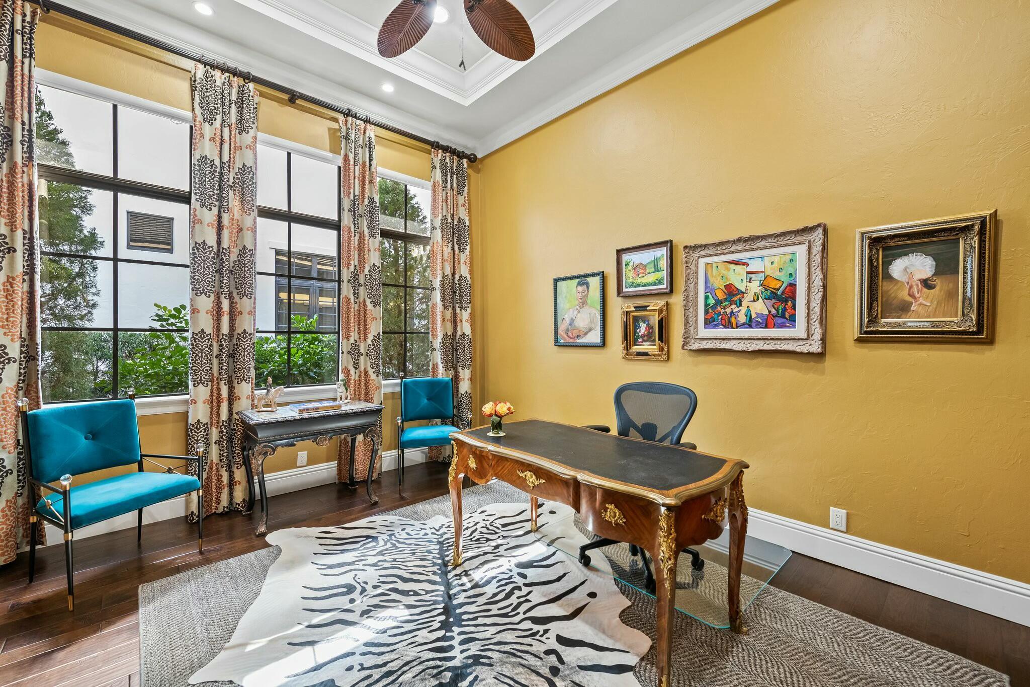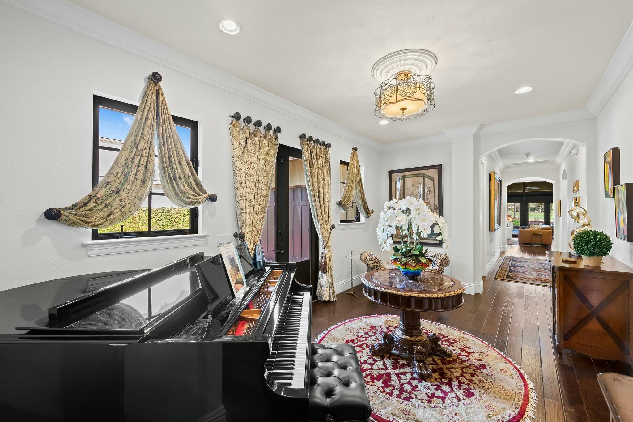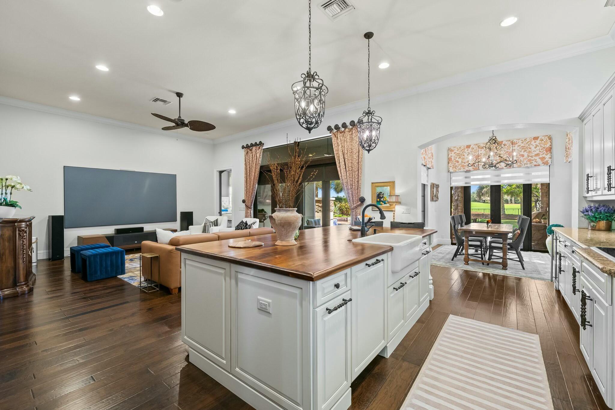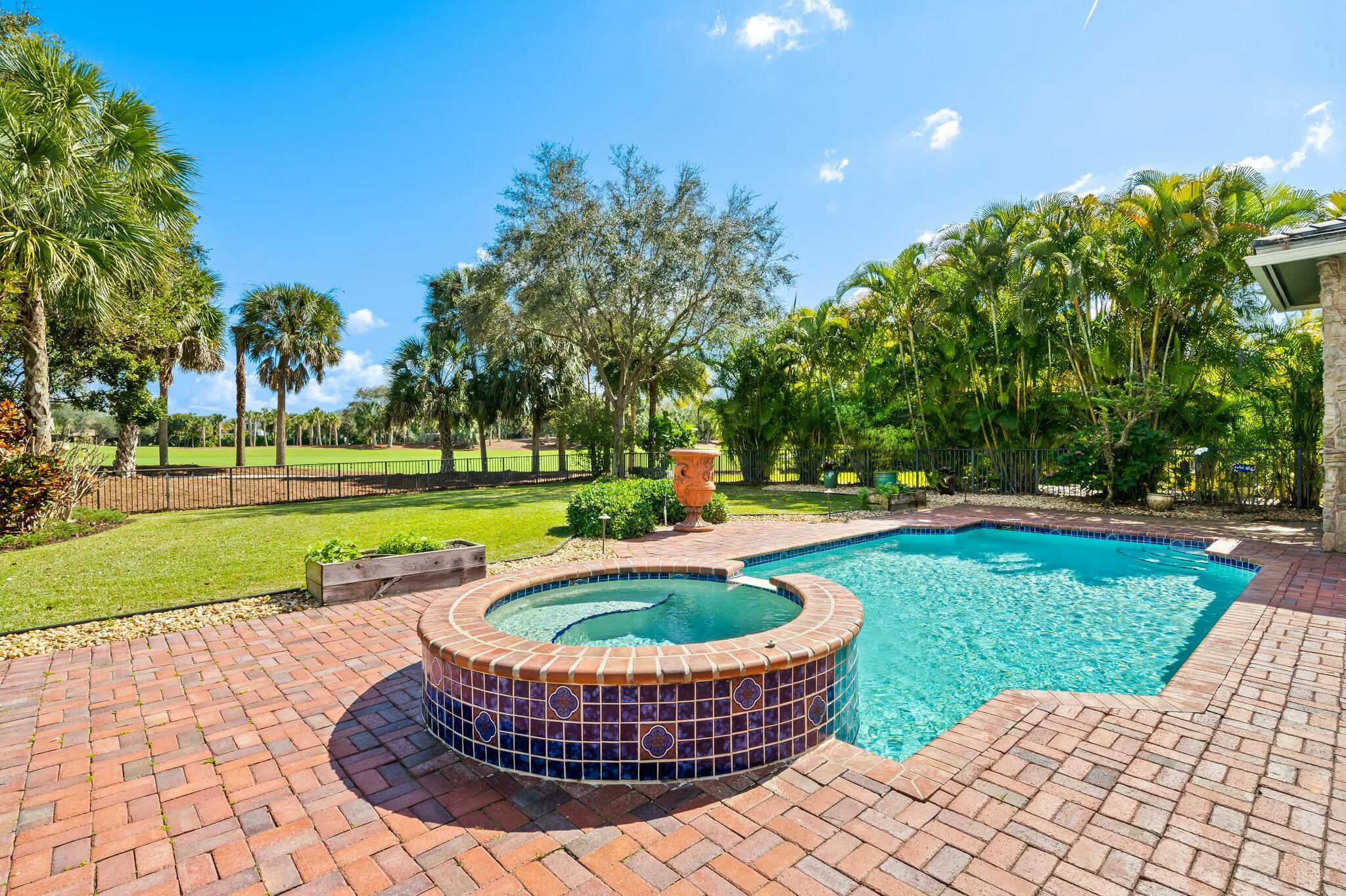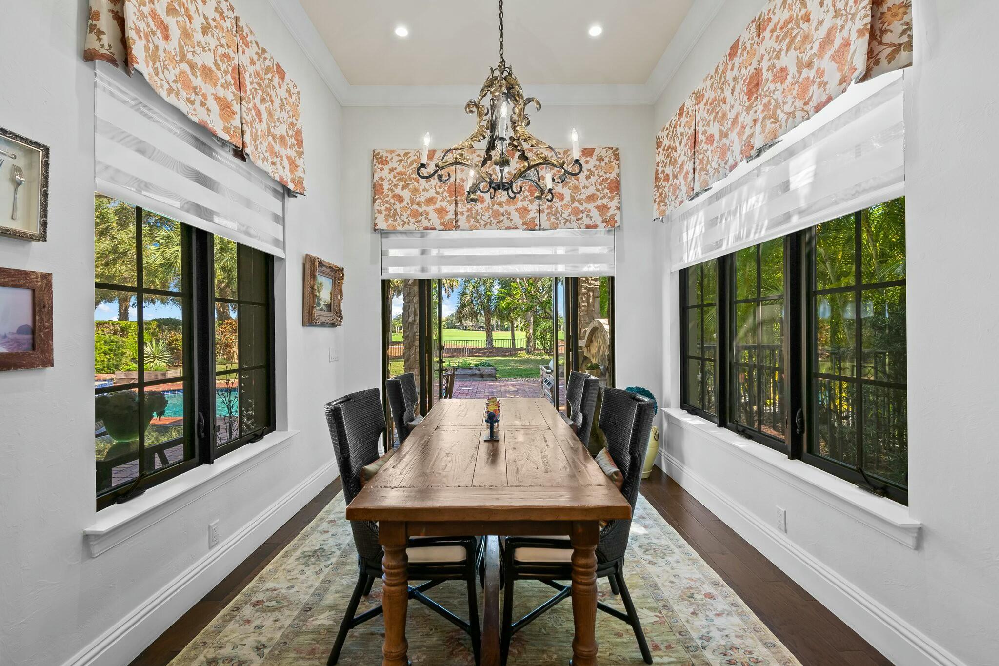 Welcome to this stunning home, located on a tranquil cul-de-sac with spectacular double fairway golf views and a spacious fenced lot. The entryway features a charming private porte-cochere and outdoor fireplace, offering a luxurious welcome. Inside, the home is beautifully renovated with elegant wood doors and flooring across the living areas, enhancing its warmth and grandeur. The gourmet kitchen is a chef's dream, equipped with high-end Wolf induction cooktop and ovens, a Miele dishwasher, a SubZero refrigerator, and ample storage with pull-out drawers and a large island perfect for entertaining. This thoughtfully designed single-story open floor plan includes a guest wing at the front and an expansive primary suite at the rear, both offering delightful views of the pool & golf course.