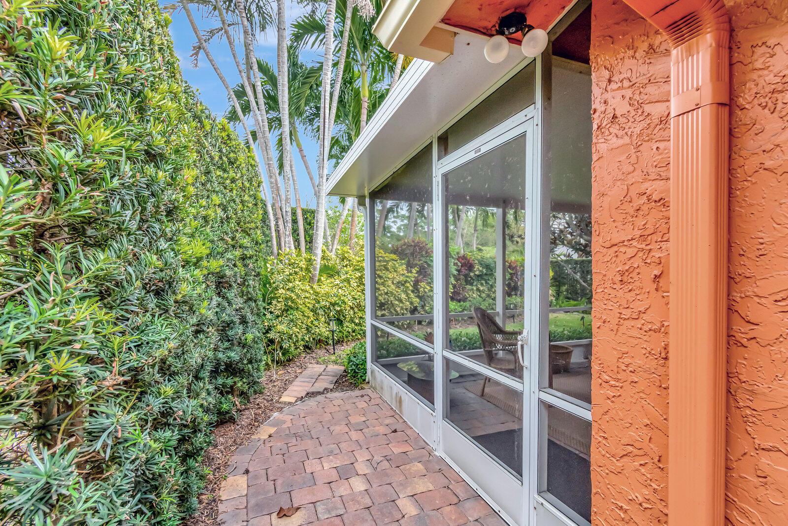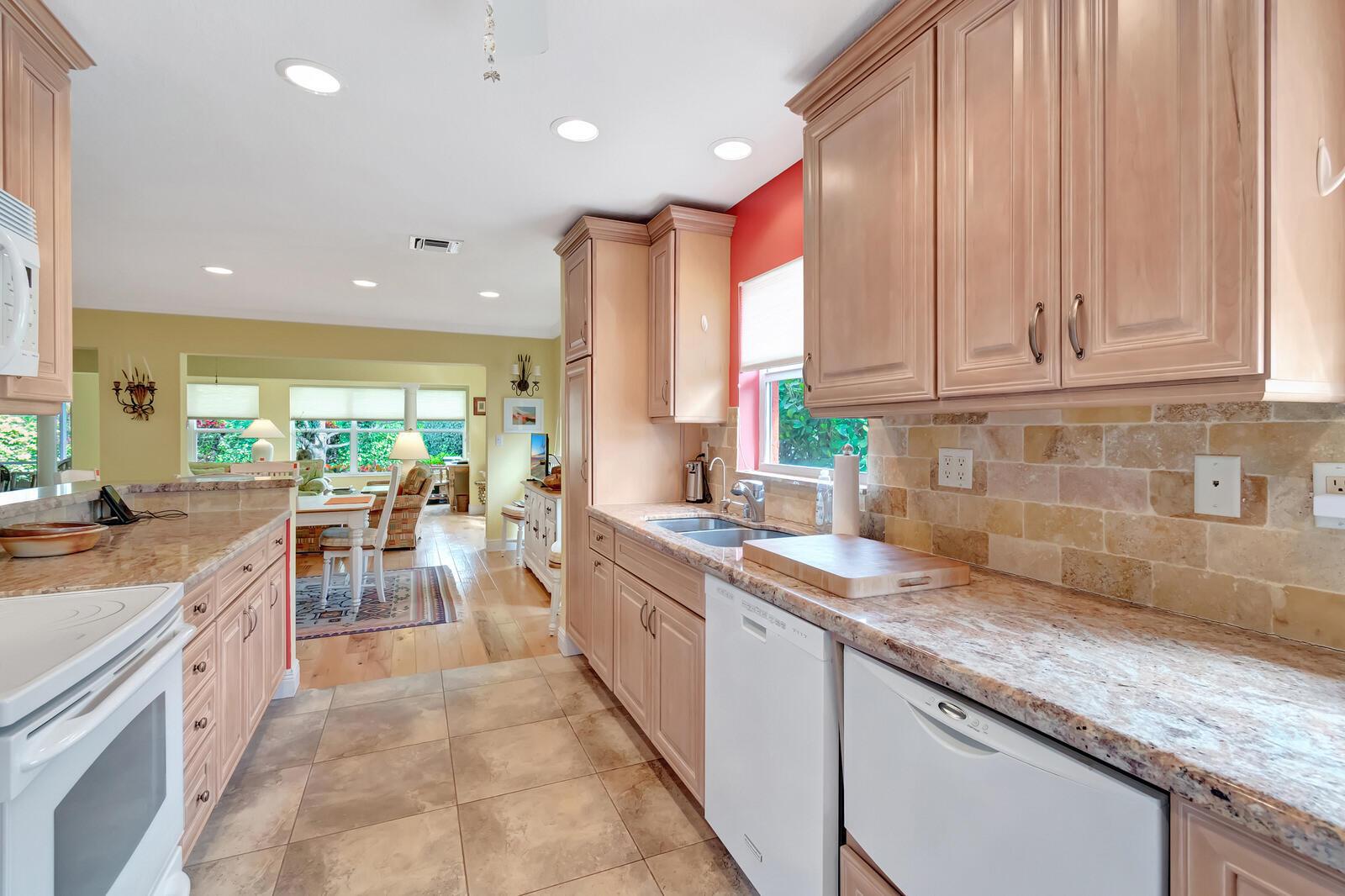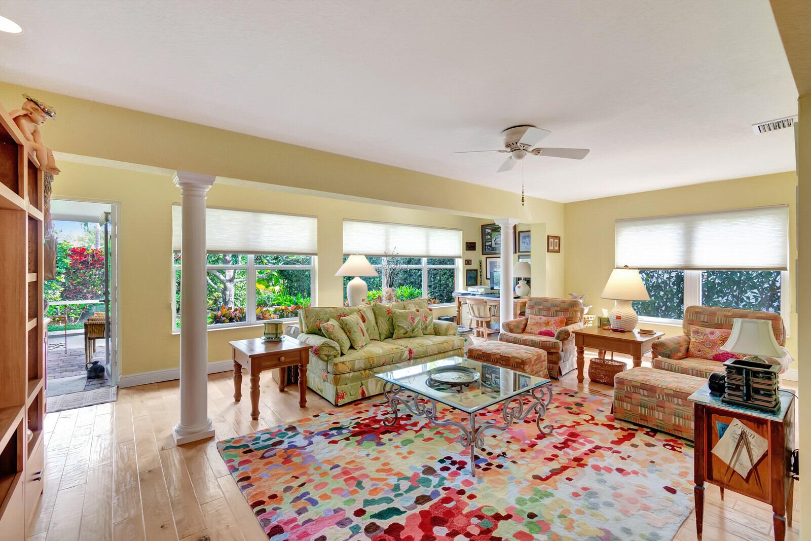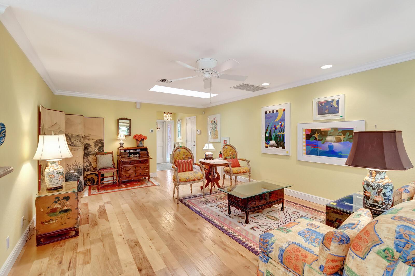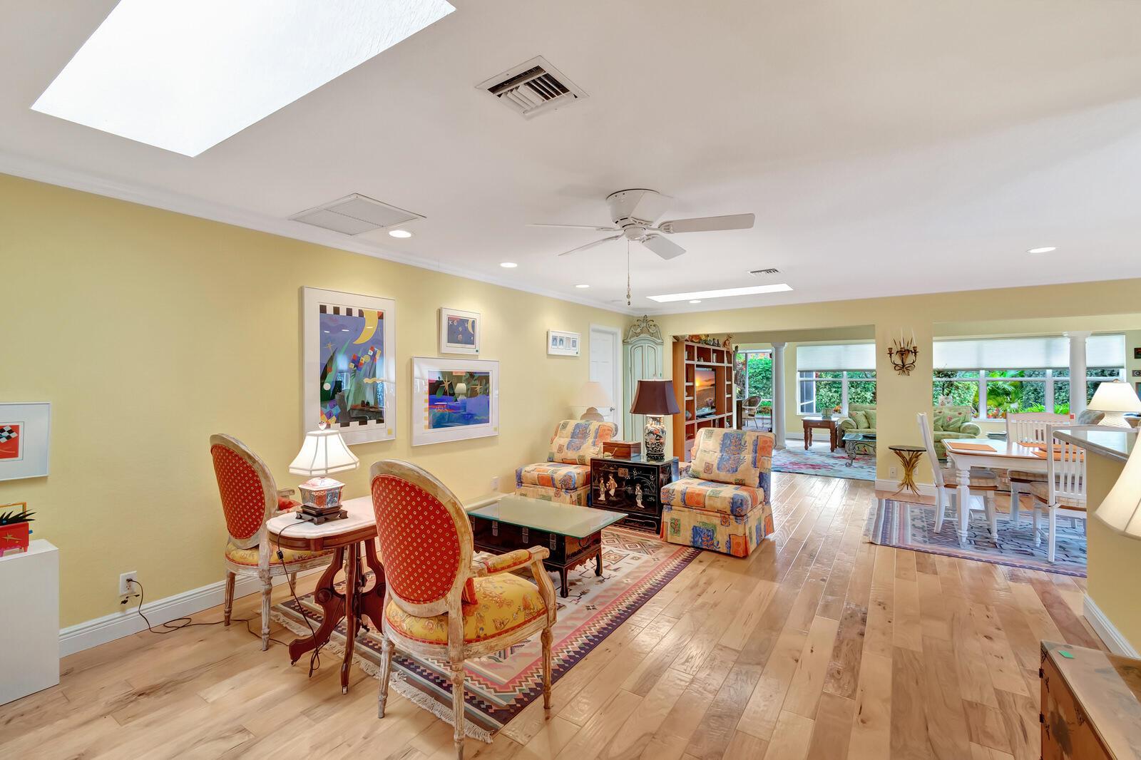 Very Spacious and open 2 BR, 2 Bath single family home with extended family room and screen porch in rear yard overlooking tropical landscaping. Tastefully updated in 2005 with Beautiful Hickory wood floors throughout (except for carpeting in BR 2). Granite/whitewash cabinetry in kitchen and bathrooms give a beachy feel. Crown molding, textured ceilings, hi hat lighting and 2 skylights in living area add lots of light. Impact glass throughout home. One car garage with laundry area & utility sink, pull down attic steps. Paver Driveway. Mini bar in rear area of home, extra half dishwasher in kitchen for those small loads. HOA fee includes basic lawn care, community pool, tennis/pickleball courts. Just .5 mile to downtown Boca Raton, 1 mile to Mizner Park & Brightline train station.