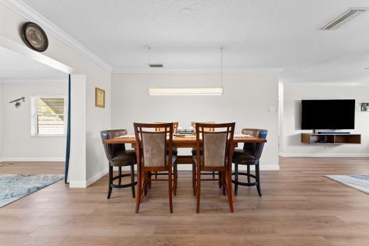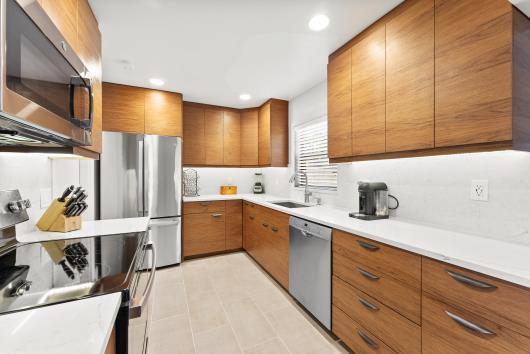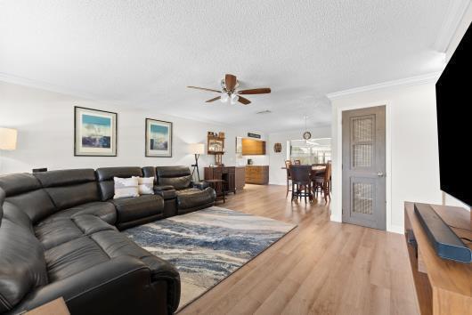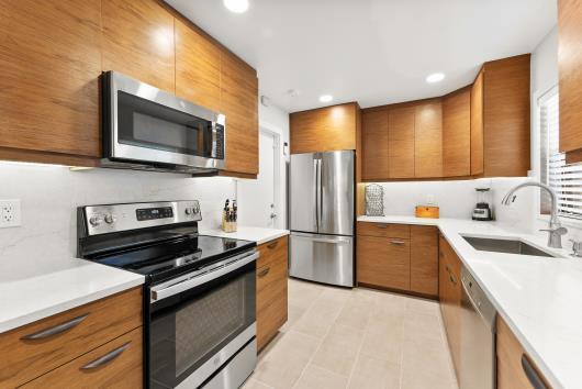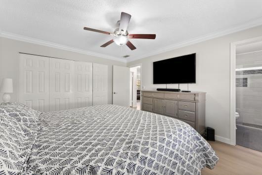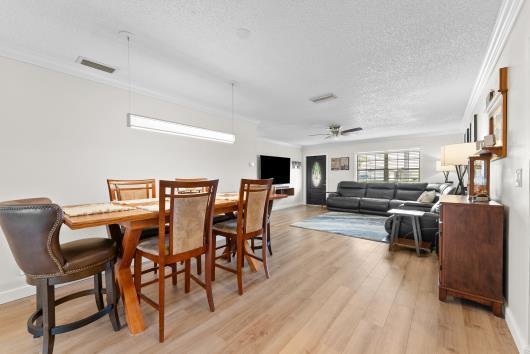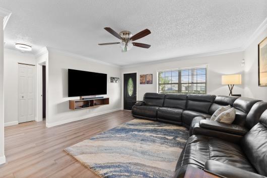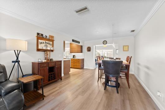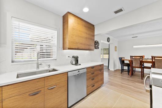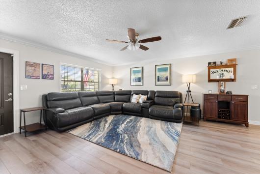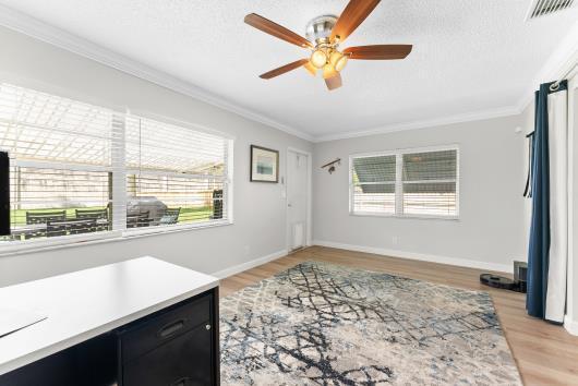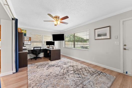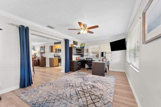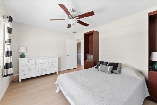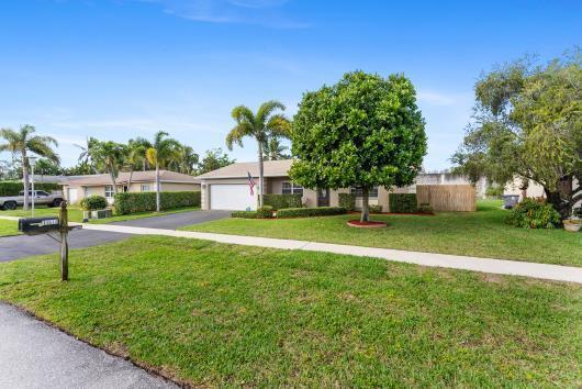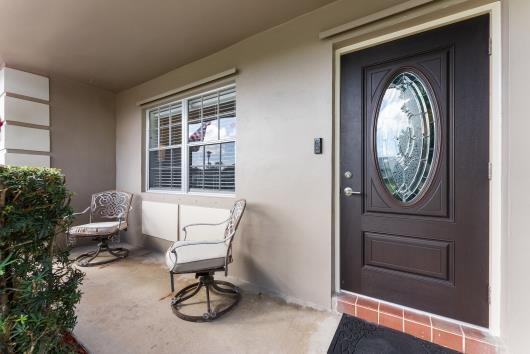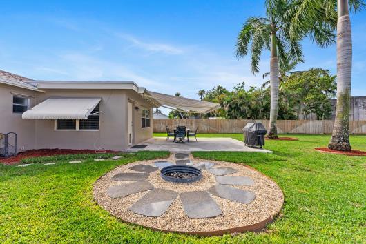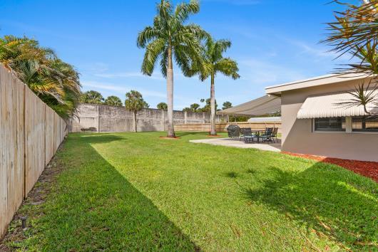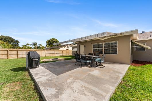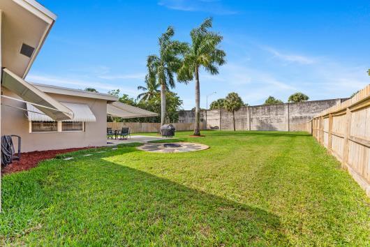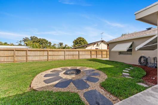 Welcome to this beautifully remodeled 2/2 home with large den/office in great neighborhood with low HOA fees and brand NEW ROOF. The modern kitchen has black walnut cabinetry with quartz countertops and stainless steel appliances. Bathrooms have been completely remodeled with custom cabinetry and tiling. There are endless possibilities for the additional living space that leads to your huge backyard oasis. Completely fenced yard with motorized retractable awning and dedicated firepit area has room for a pool is great for entertaining. Exterior has just been painted. Front door and garage door hurricane rated with protection for all other windows. Neighborhood amenities include pool, playground, tennis, basketball and pickleball. Great schools, shopping and restaurants.