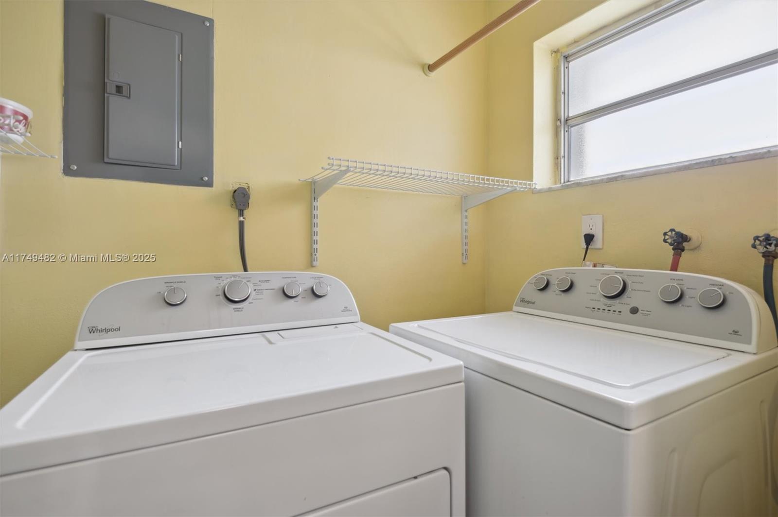 This cozy home offers 2 bedrooms 1 1/2 baths plus a bonus room. The flooring has tile in the common areas and both bedrooms have a wood laminate. Nicely renovated kitchen with granite countertops and stainless steel appliances. Separate laundry room with large full size washer/dryer. The master bedroom is bright and spacious and offers a private bathroom with a glass shower enclosure. New roof added in 2023. Accordion shutters on all windows. Located in a very quiet 55+ community just steps away from the clubhouse and pool. Local shopping, highways and restaurants are minutes away.