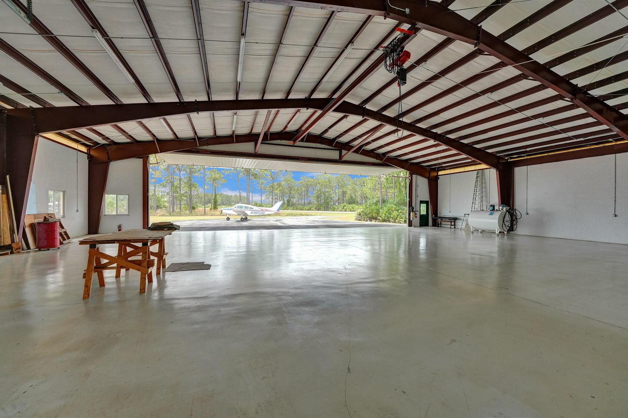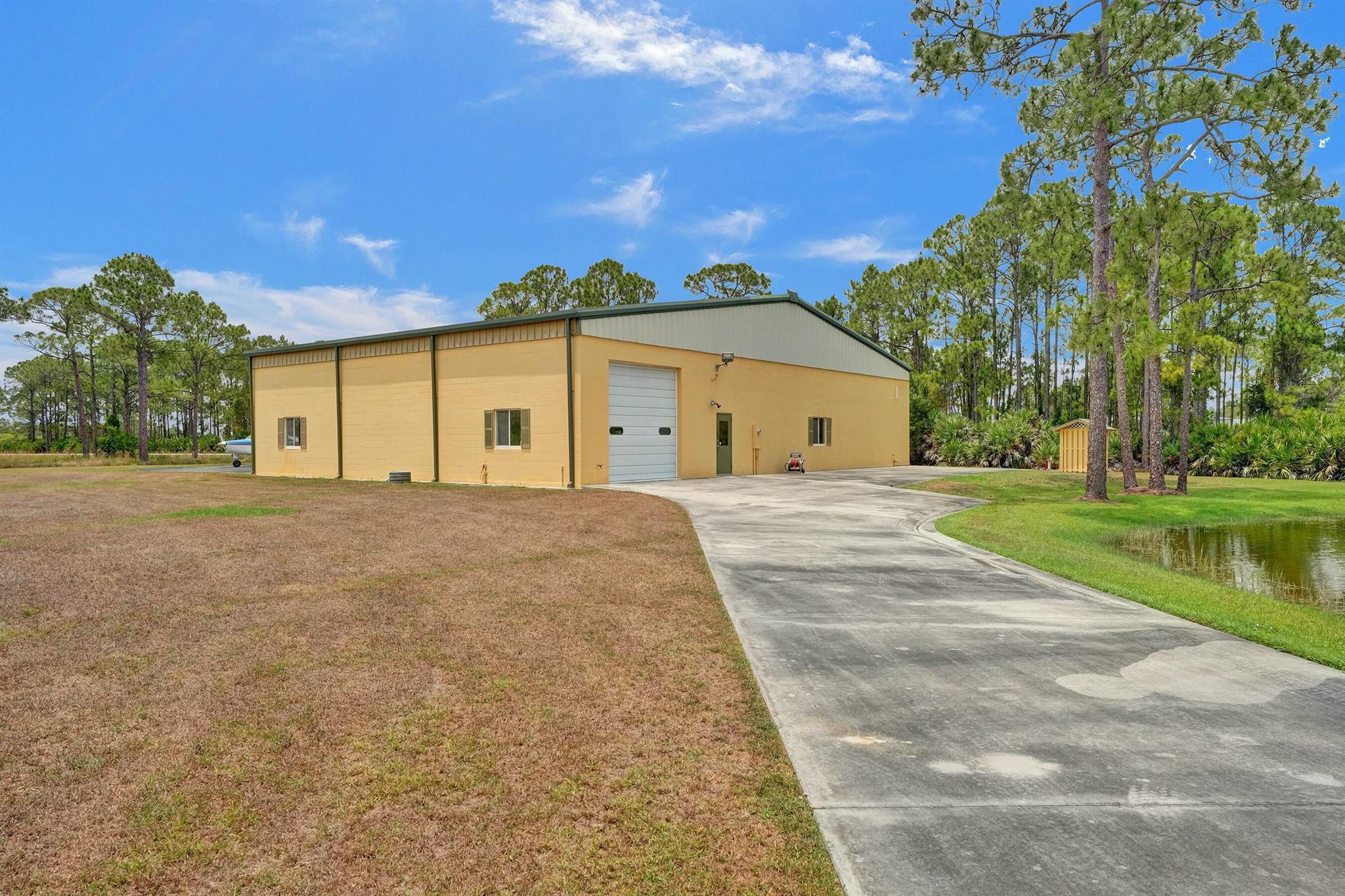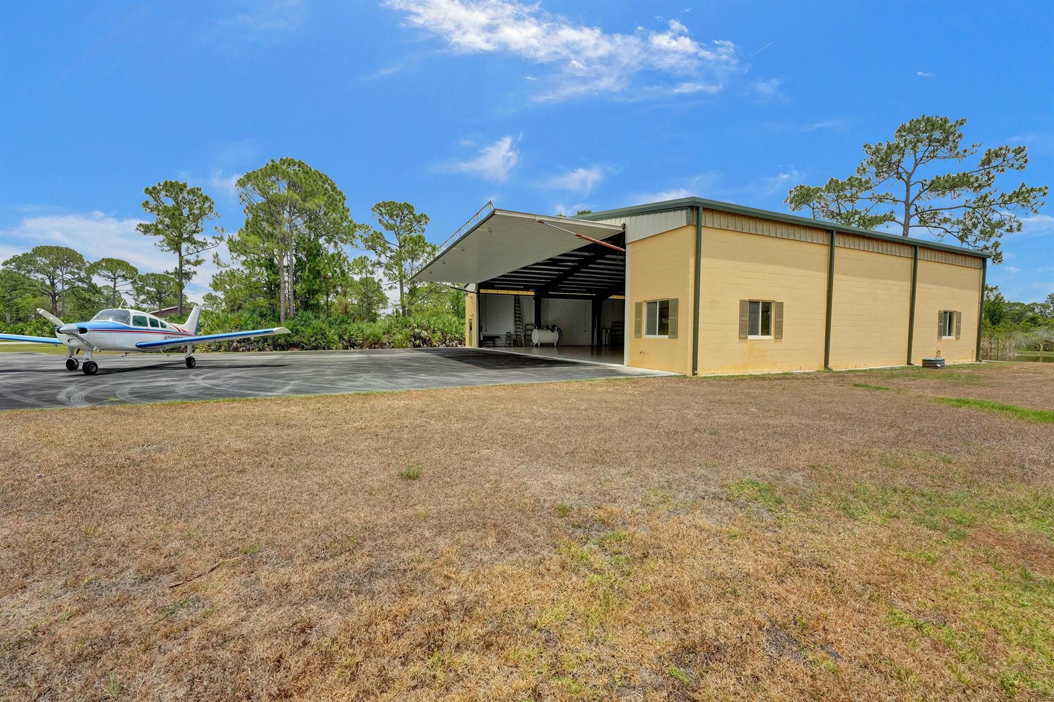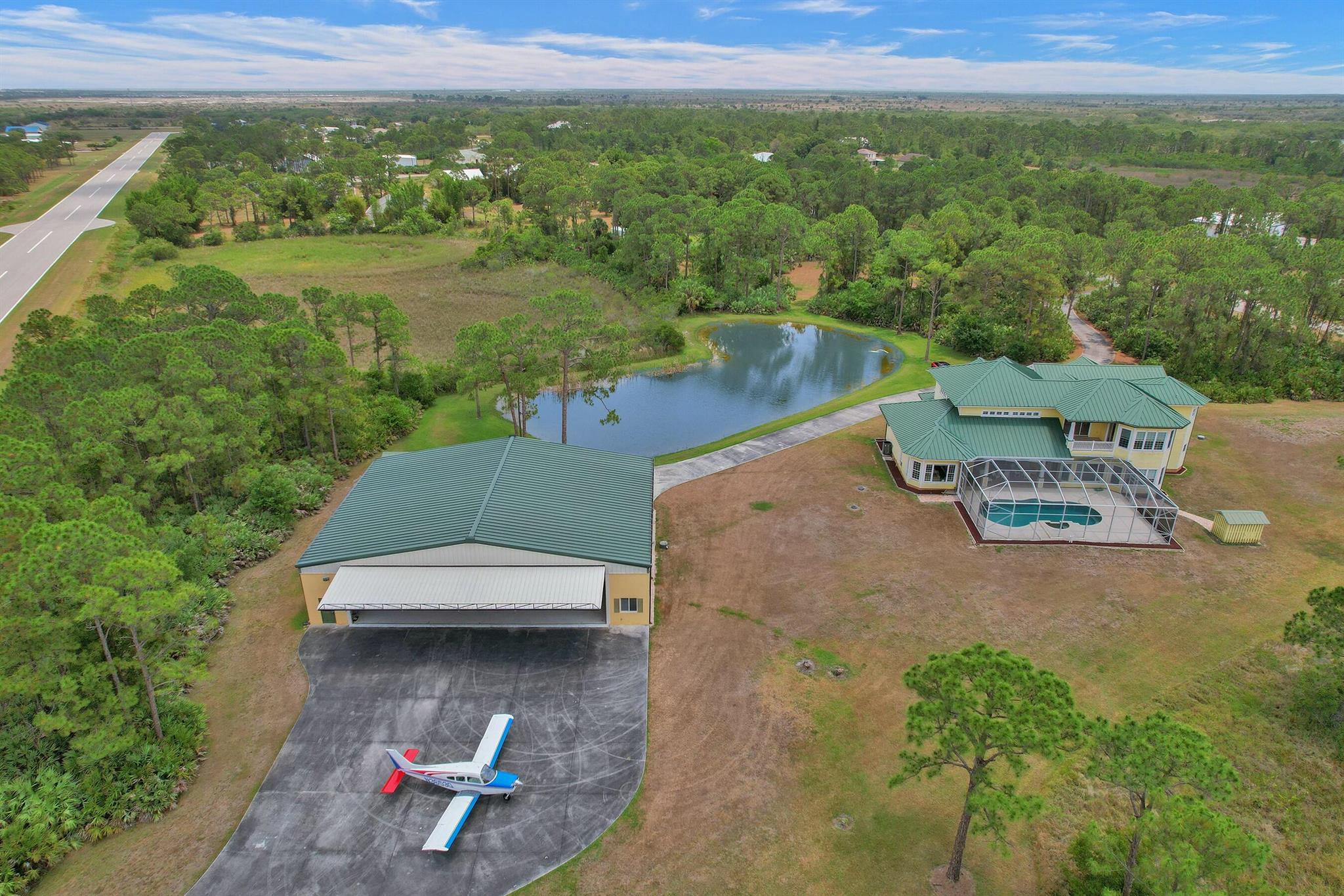 Welcome to an extraordinary aviation estate at 15350 Skyking Dr, located in the prestigious Treasure Coast Airpark (FL37) in Port Saint Lucie, FL. This remarkable property offers aviation enthusiasts direct access to a 4,067' x 48' paved and lighted runway (10-28), perfectly situated halfway down the runway for unparalleled views of aircraft taking off and landing. Property Highlights: Residence: - Spacious Living: 4 bedrooms and 3 baths, plus an outdoor cabana bath with a toilet and shower. - Expansive Grounds: 14.65 acres across 2 lots, providing ample privacy and room for outdoor activities. - Gourmet Kitchen: Featuring Slate countertops from Maine, a Miele oven, and an expansive walk-in pantry with abundant storage.