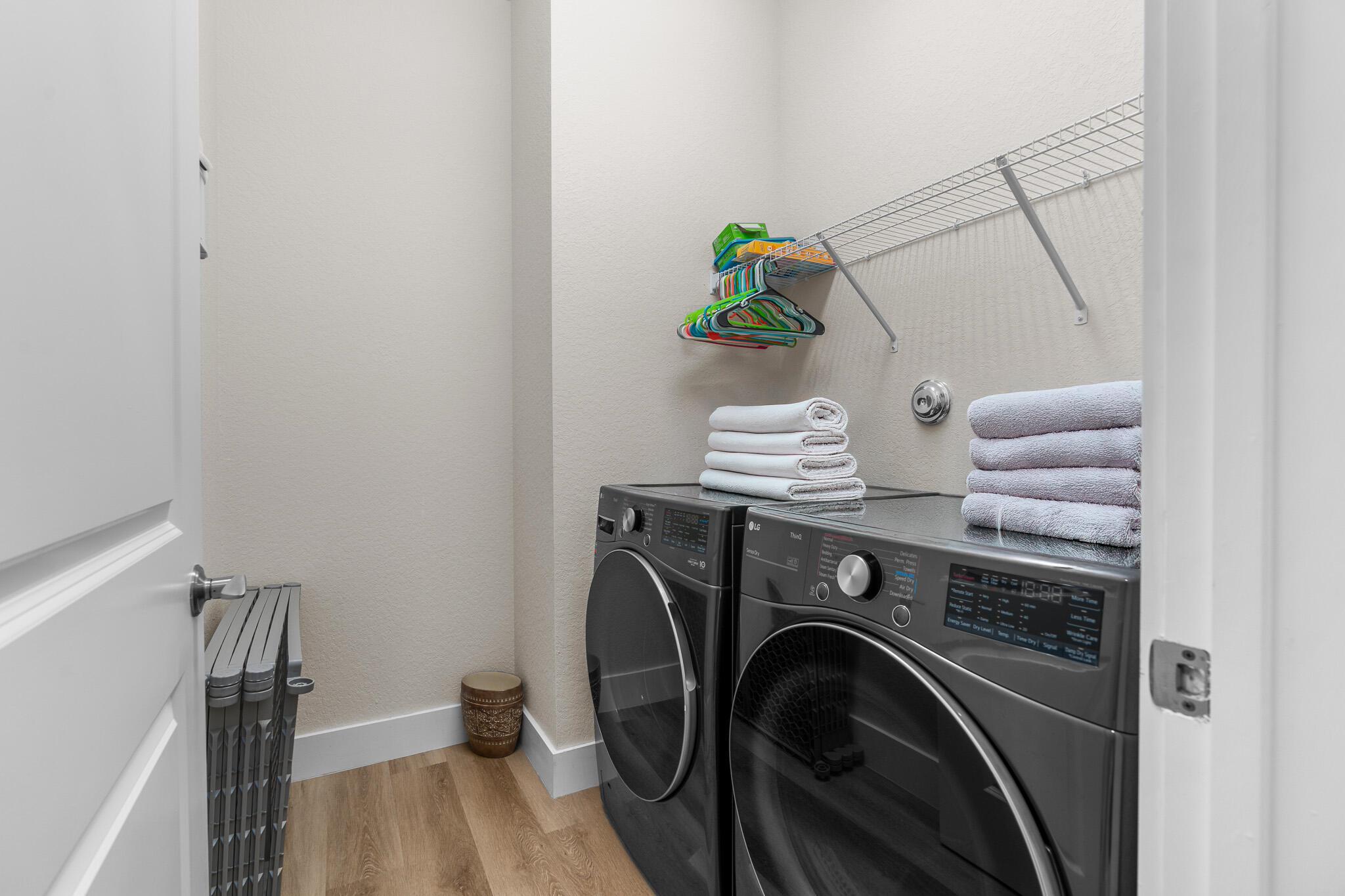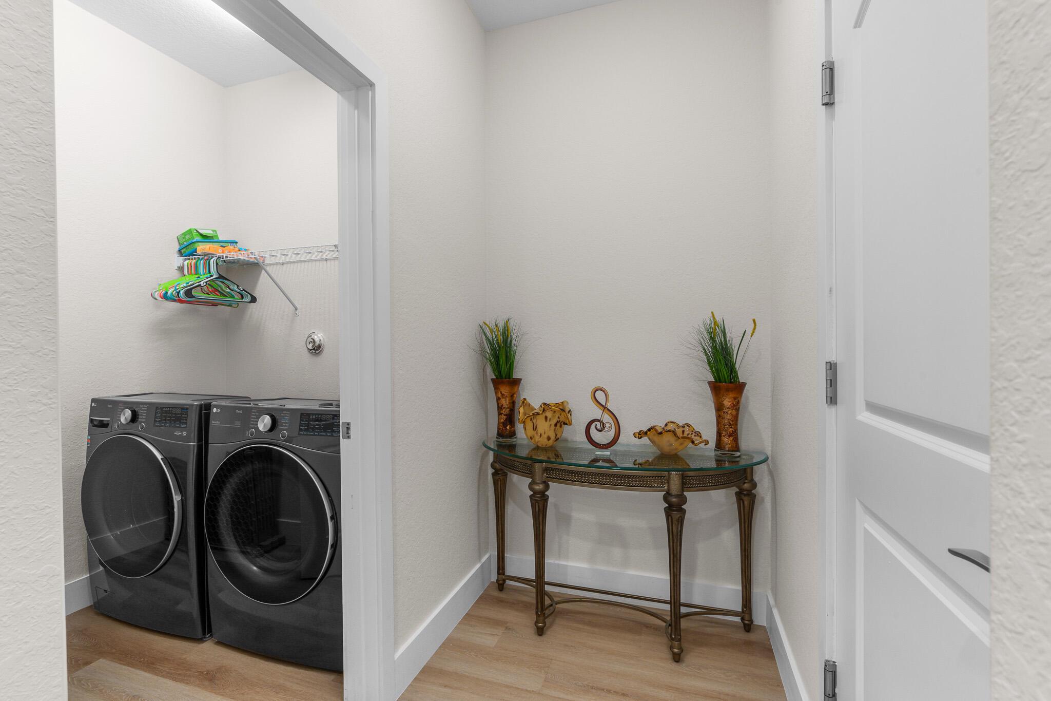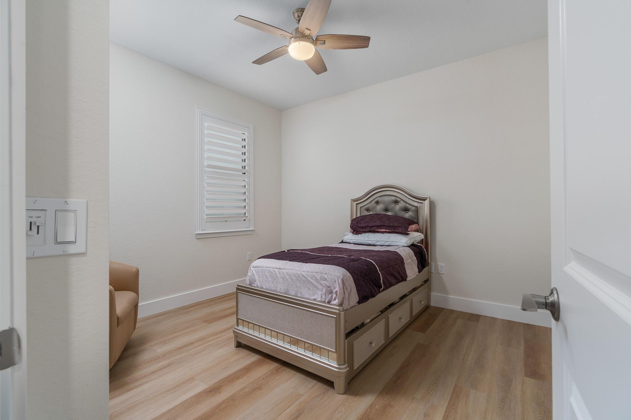 Newly built in 2022 and recently upgraded by the current owner, this 4 bedroom/ 2 bathroom / oversized 2 car garage gorgeous home is located in the gated & family-friendly community of The Fields. Brand-new just finished upgrades include: large-format plank flooring throughout, new countertops in the gourmet chef's kitchen on an expanded island with thick mitered edges and deep sink, kitchen backsplash and modern baseboards & door trim.Fire up the gas range and enjoy peaceful lake views from the screened-in lanai or take advantage of the spacious backyard with plenty of room for a pool (ask for the renderings). complete hurricane impact windows and doors as well. Enjoy the spacious primary suite with large walk-in shower and enough closet space to make anyone happy!