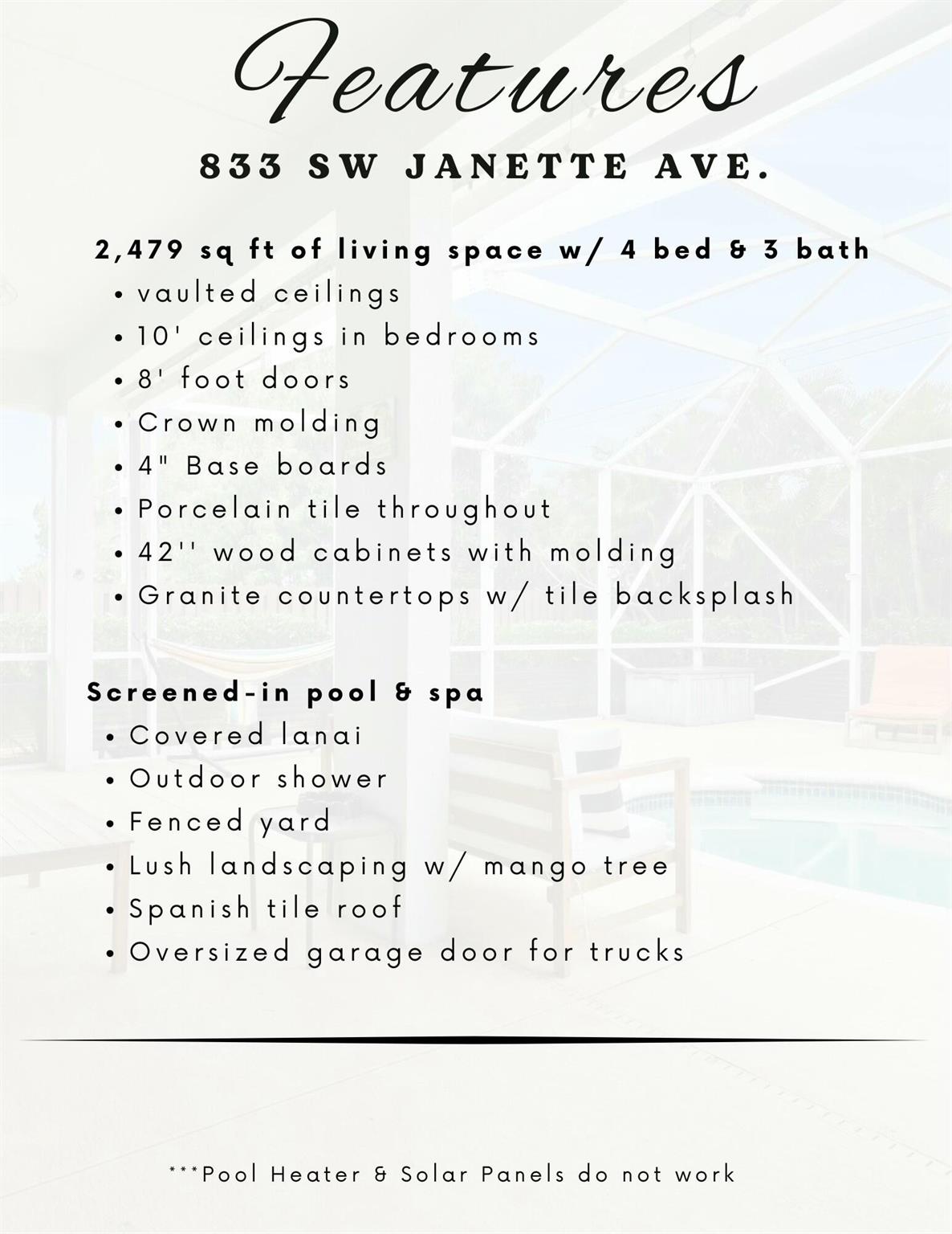 PRICE IMPROVEMENT + POOL HOME! Discover the space, comfort, and indoor/outdoor living you've been searching for in this 4-bed, 3-bath CBS home with nearly 2,500 sq ft of living space. Enjoy soaring ceilings, formal living + dining rooms, and a spacious kitchen with granite counters, 42'' wood cabinetry, and stainless-steel appliances. Relax or entertain by your private screened pool and covered patio inside a fully fenced backyard. Primary suite features dual closets and pool access. Tile flooring throughout--no carpet! Located east of the Turnpike near great parks, schools, shopping, and dining. Room for everyone to spread out and make this home their own. No HOA! Bring your toys and live the Florida lifestyle you love.