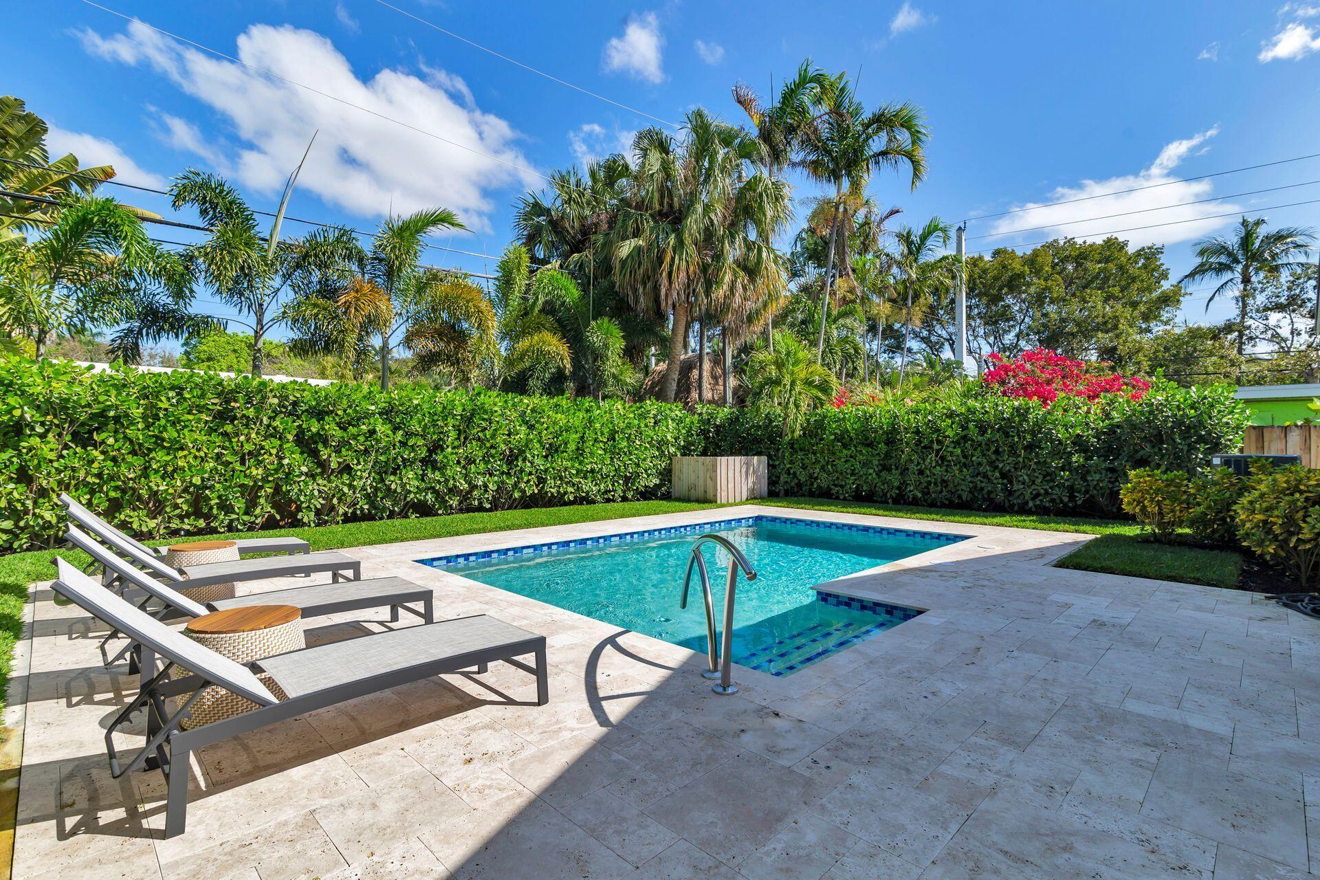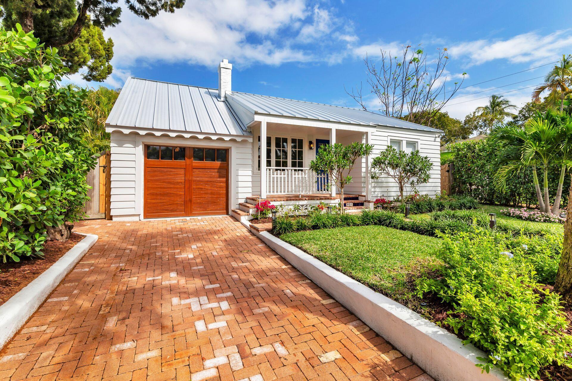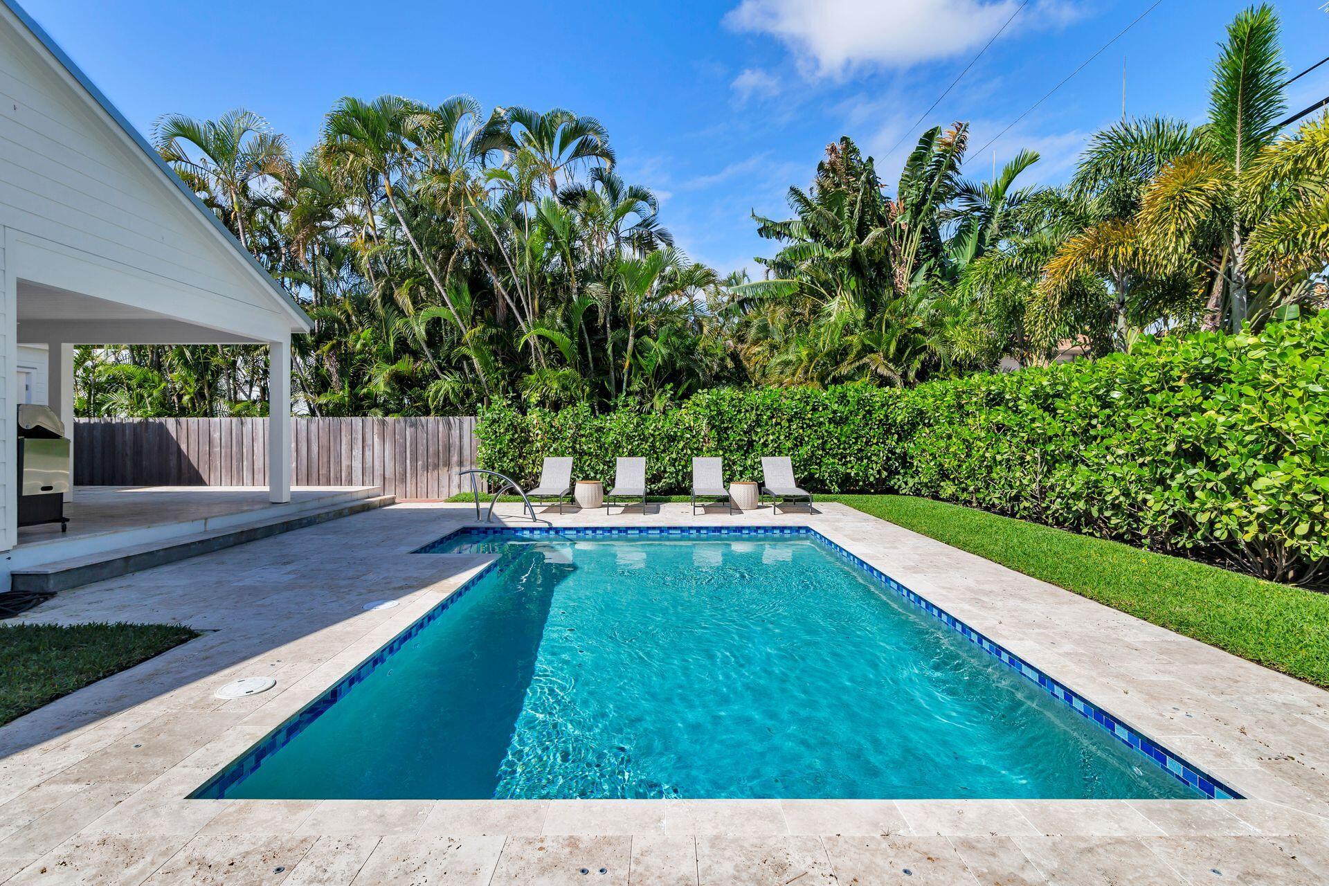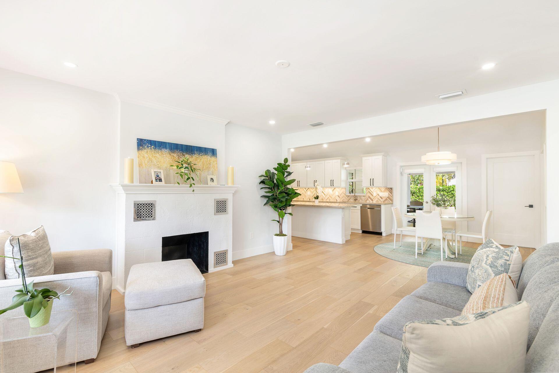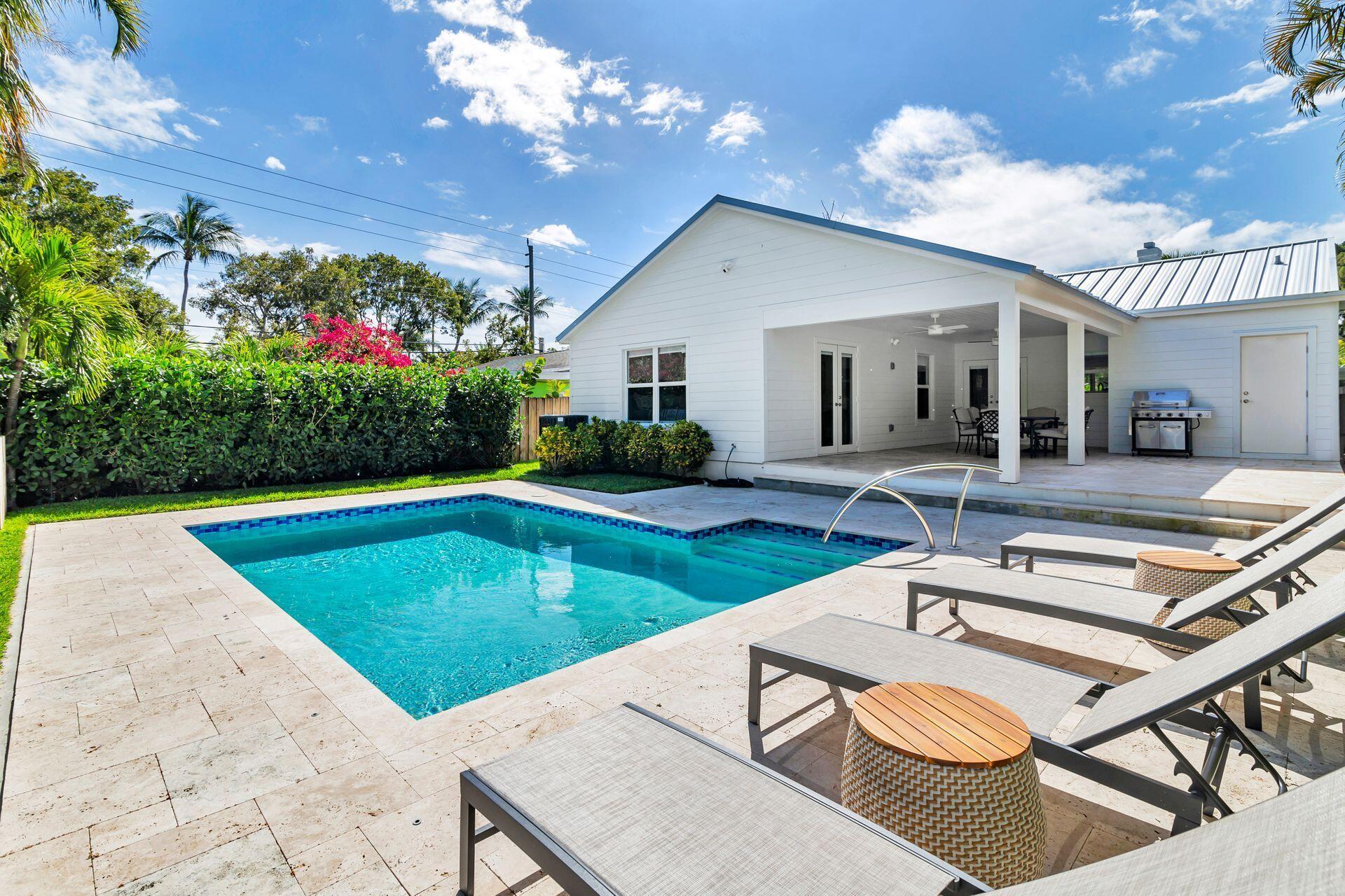 True Florida Bungalow in the Heart of Historic Flamingo Park! Spectacularly renovated to combine modern amenities with 'Old Florida' charm. Situated on an elevated lot, a welcoming front porch opens to a light filled living room with original fireplace. Wide-plank floors throughout, impact windows and doors! Gorgeous kitchen with quartz counters, prep island with sink, abundant cabinetry, gas range & high vaulted ceilings extending over dining area. Large primary bedroom opens to porch. Bright bath, dual vanities & oversized shower. 2 guest bedrooms with en suite baths. Large covered porch with cabana bath, New pool surrounded by greenery for the utmost private outdoor experience. 1 car garage with pull down stairs to attic. Brick paver drive and walkways. Close to everything downtown WPB