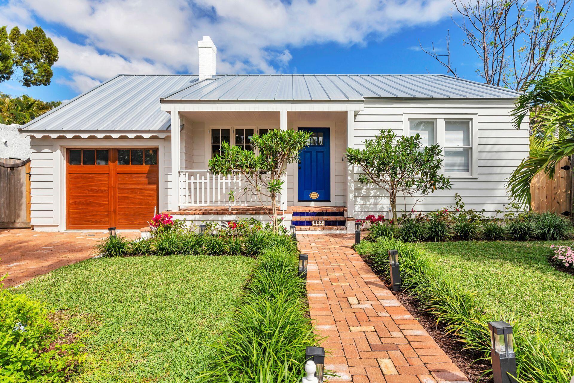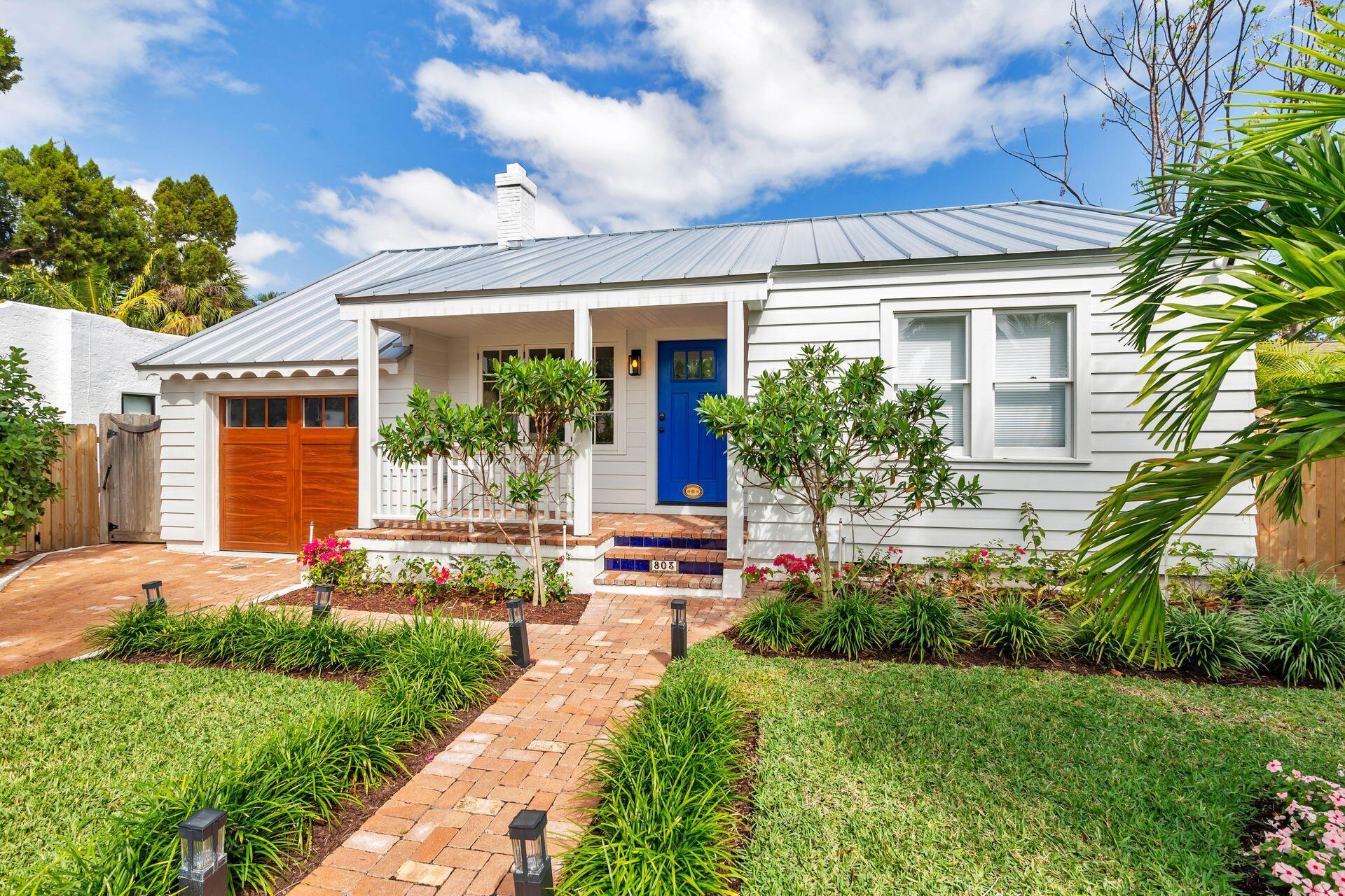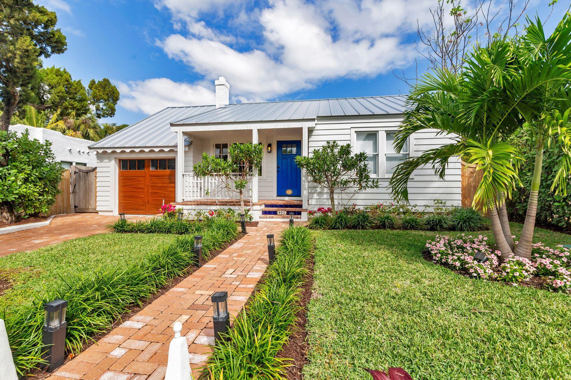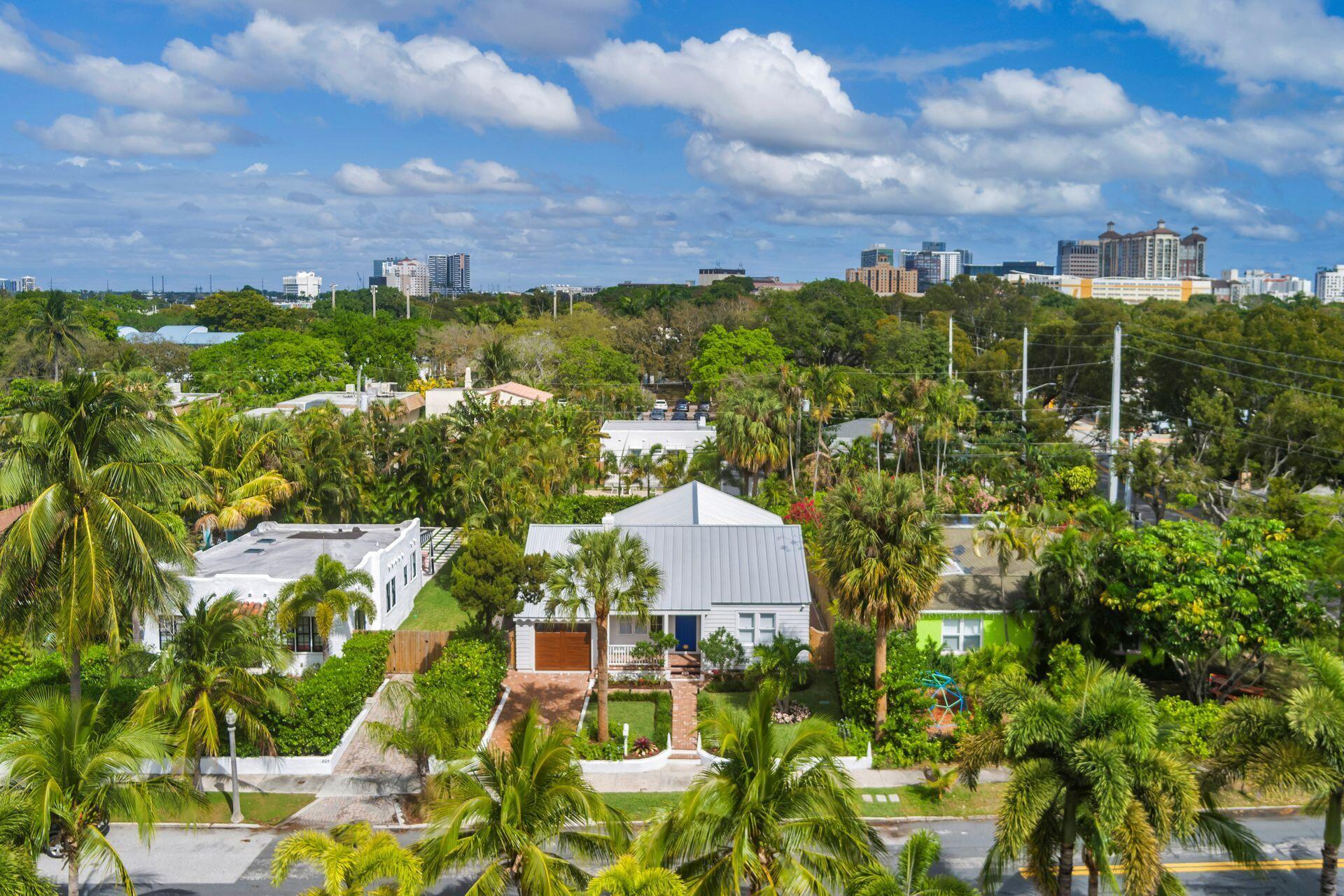 True Florida Bungalow in the Heart of Historic Flamingo Park! Spectacularly renovated to combine modern amenities with 'Old Florida' charm. Situated on an elevated lot, a welcoming front porch opens to a light filled living room with original fireplace. Wide-plank floors throughout, impact windows and doors! Gorgeous kitchen with quartz counters, prep island with sink, abundant cabinetry, gas range & high vaulted ceilings extending over dining area. Large primary bedroom opens to porch. Bright bath, dual vanities & oversized shower. 2 guest bedrooms with en suite baths. Large covered porch with cabana bath, New pool surrounded by greenery for the utmost private outdoor experience. 1 car garage with pull down stairs to attic. Brick paver drive and walkways. Close to everything downtown WPB