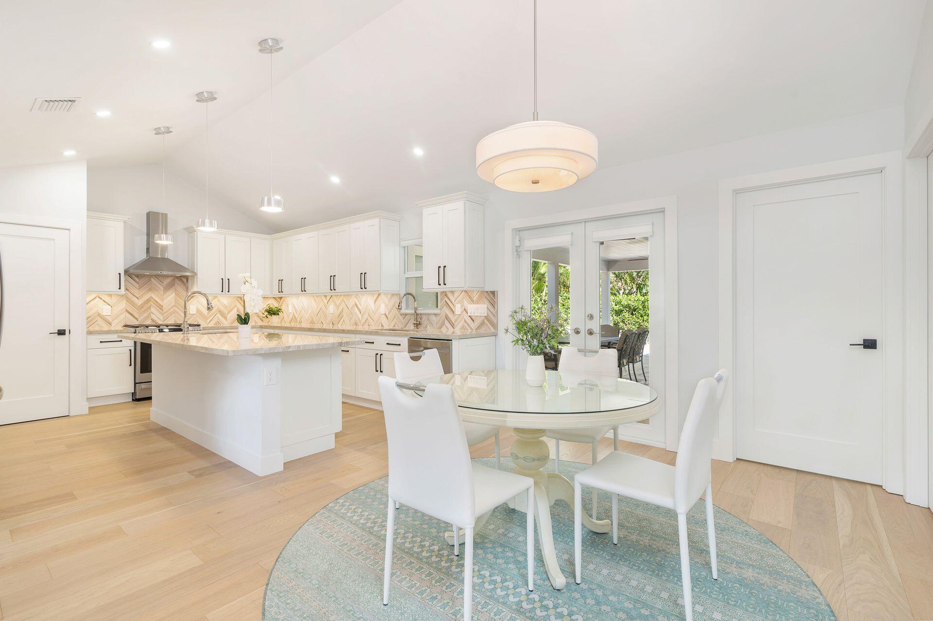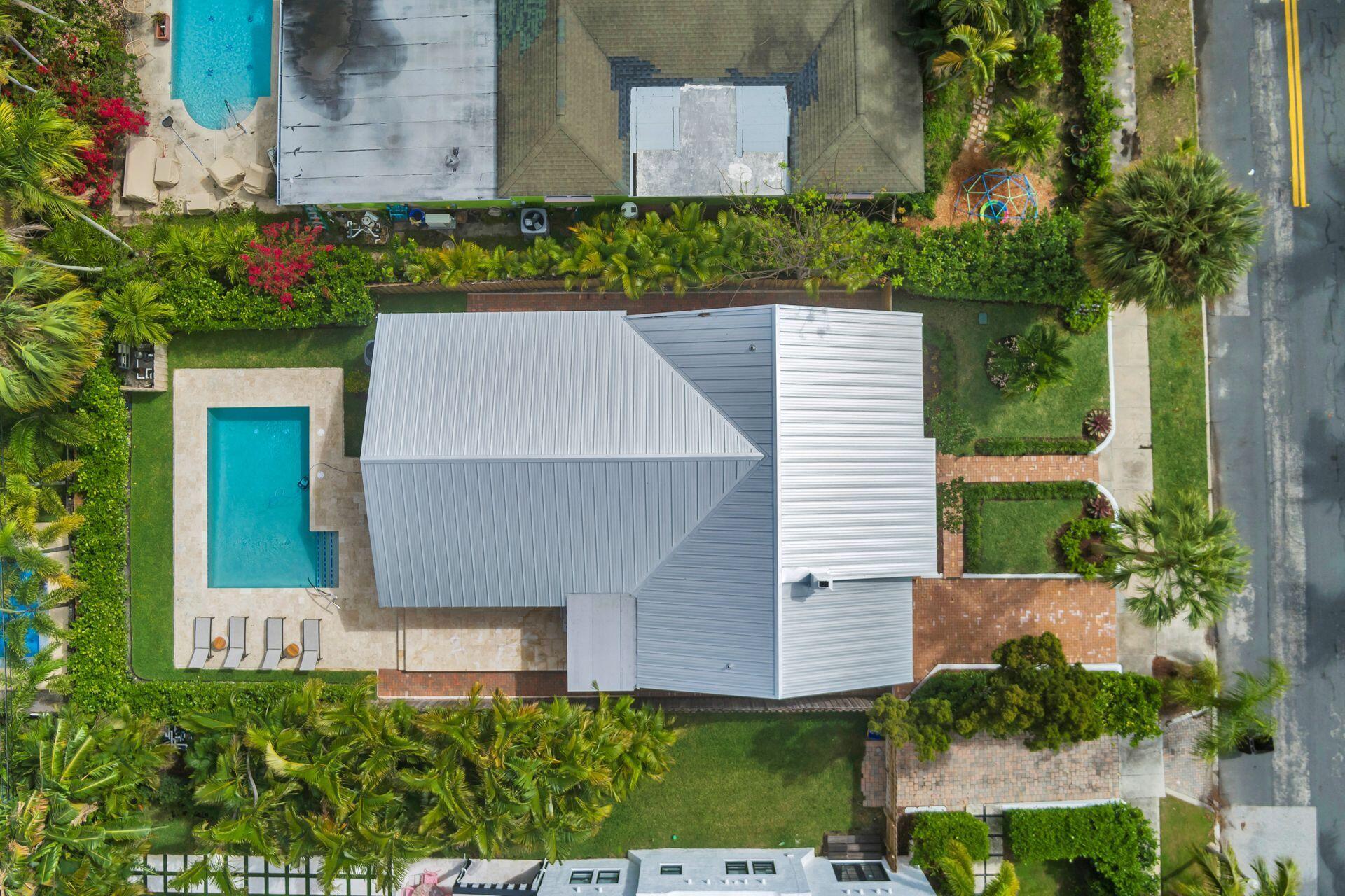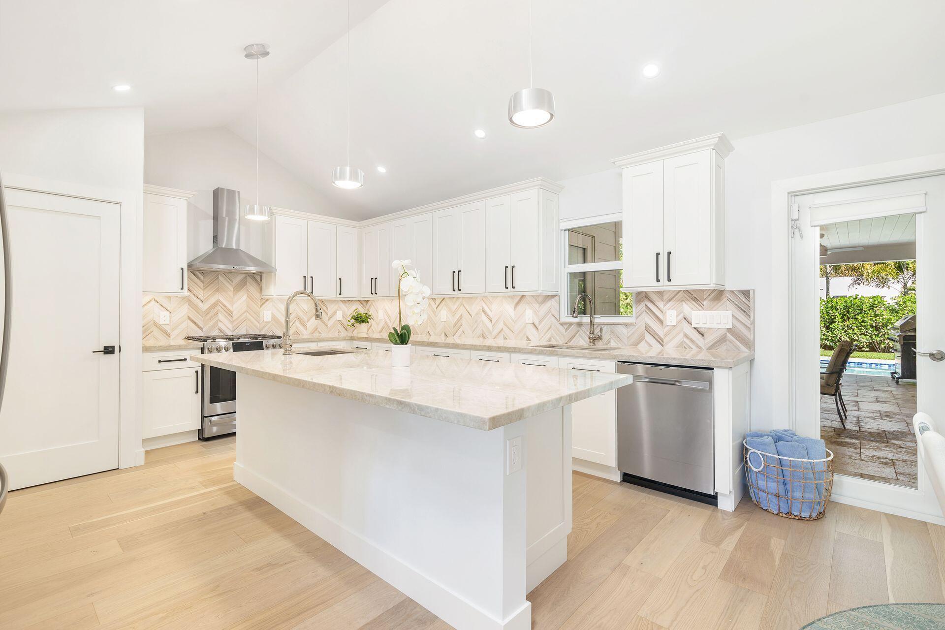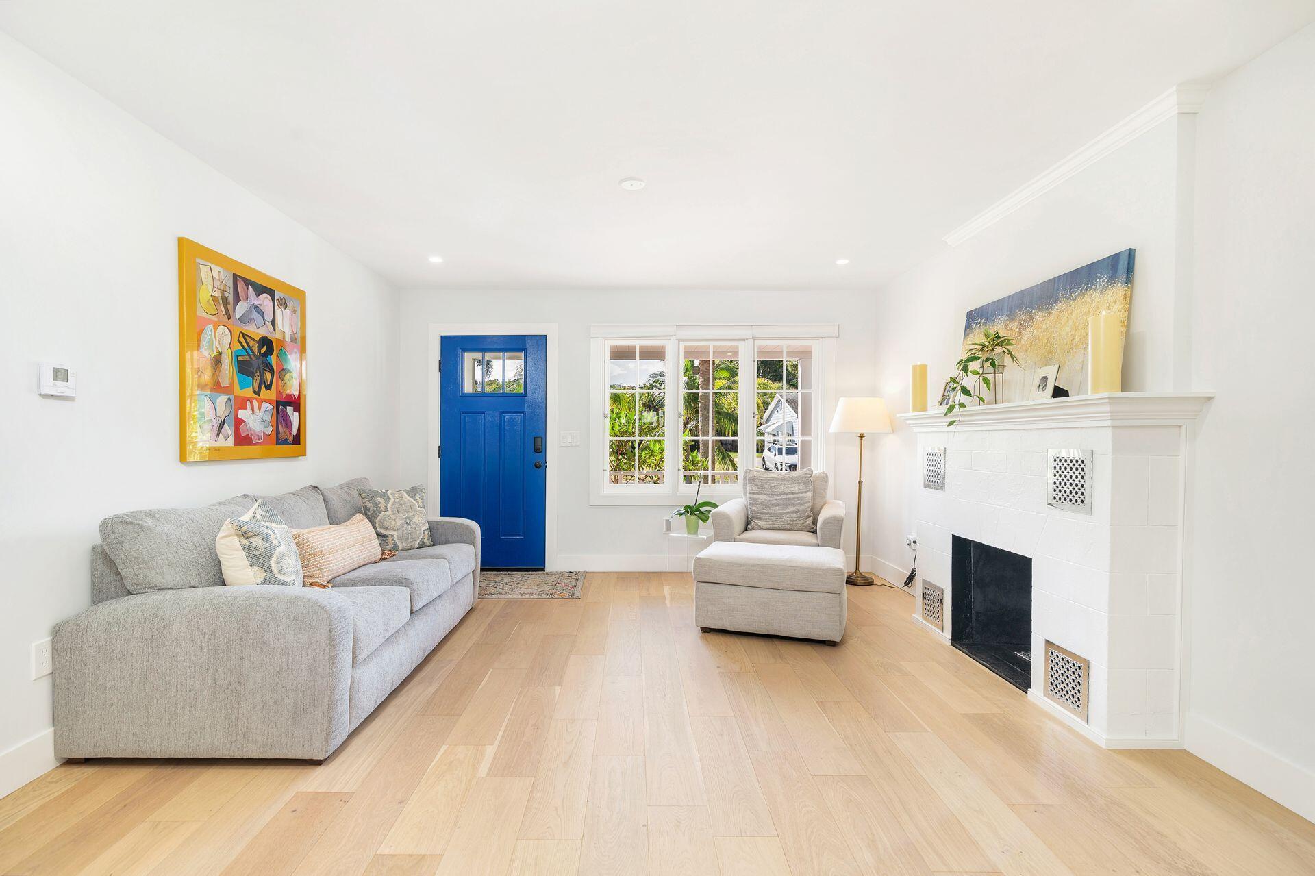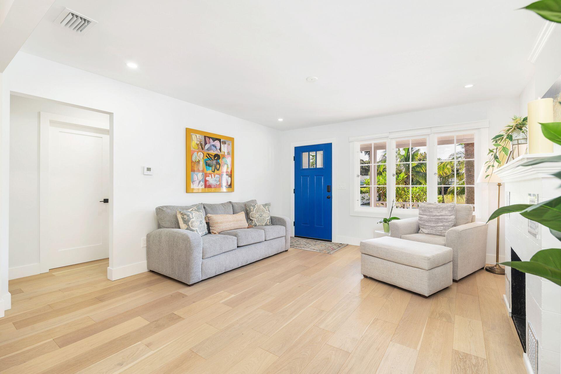 True Florida Bungalow in the Heart of Historic Flamingo Park! Spectacularly renovated to combine modern amenities with 'Old Florida' charm. Situated on an elevated lot, a welcoming front porch opens to a light filled living room with original fireplace. Wide-plank floors throughout, impact windows and doors! Gorgeous kitchen with quartz counters, prep island with sink, abundant cabinetry, gas range & high vaulted ceilings extending over dining area. Large primary bedroom opens to porch. Bright bath, dual vanities & oversized shower. 2 guest bedrooms with en suite baths. Large covered porch with cabana bath, New pool surrounded by greenery for the utmost private outdoor experience. 1 car garage with pull down stairs to attic. Brick paver drive and walkways. Close to everything downtown WPB