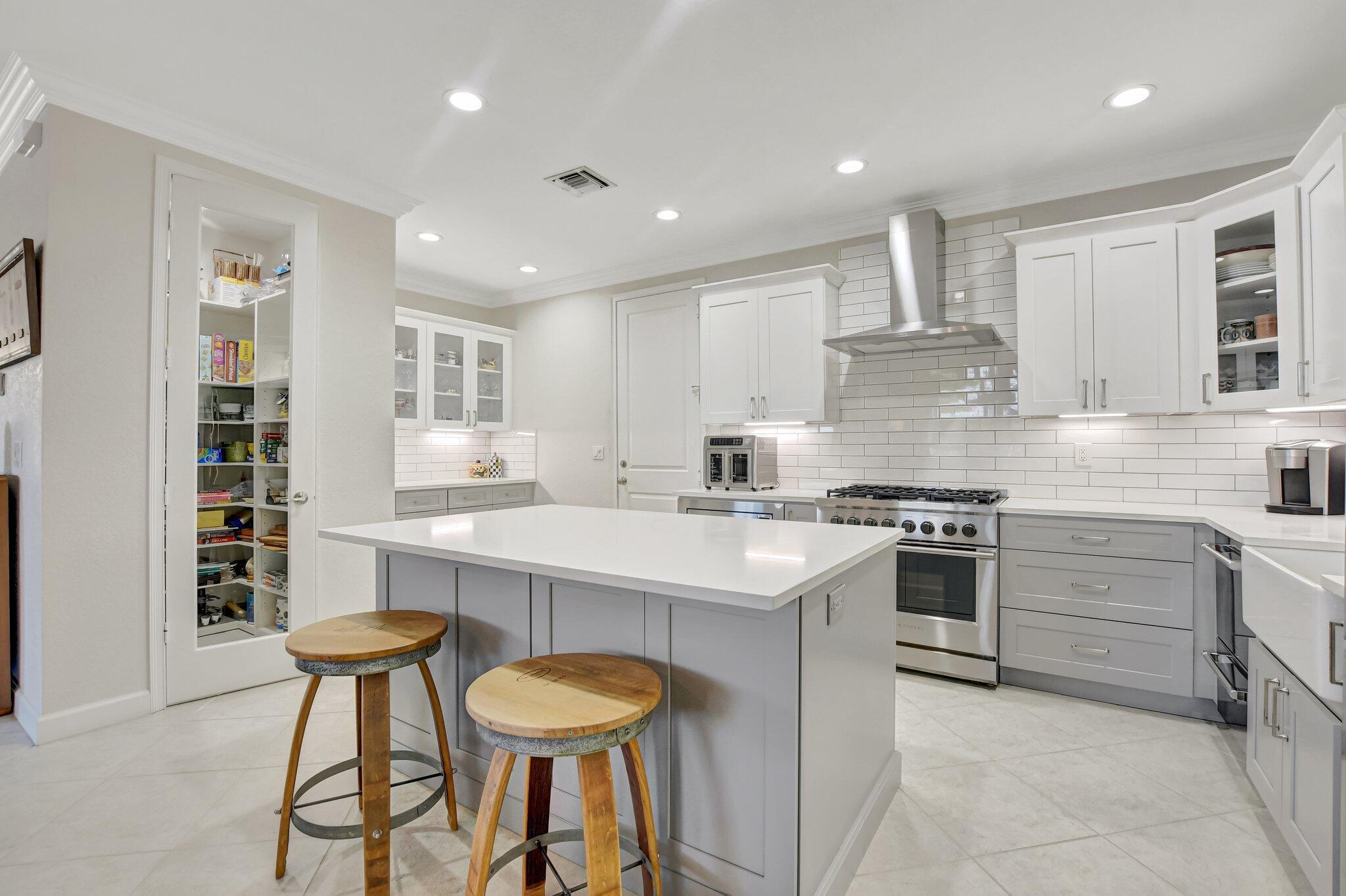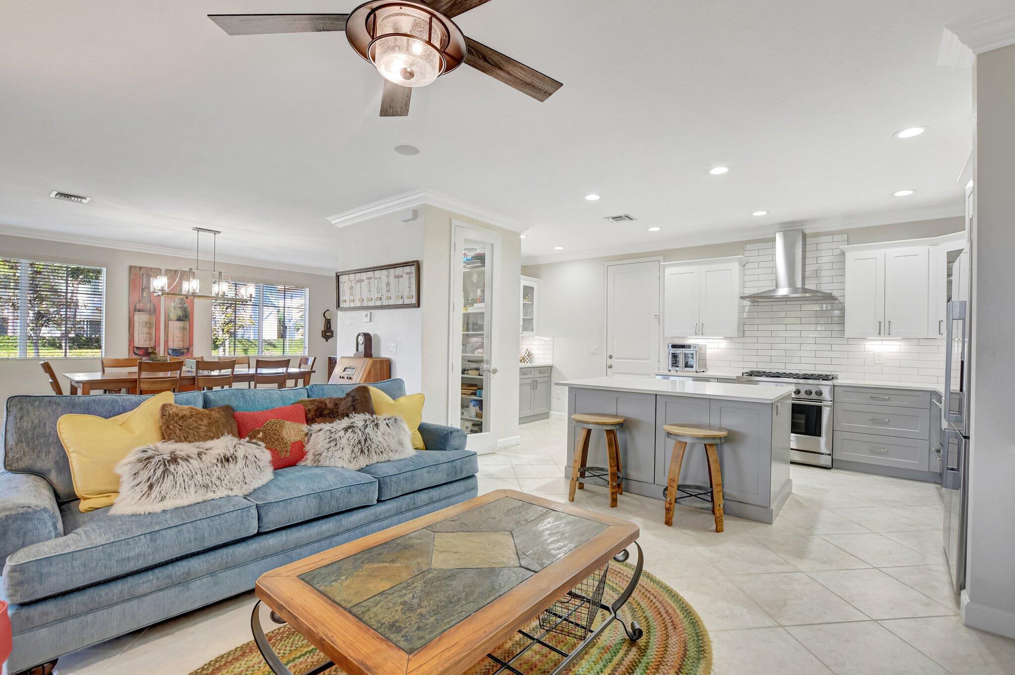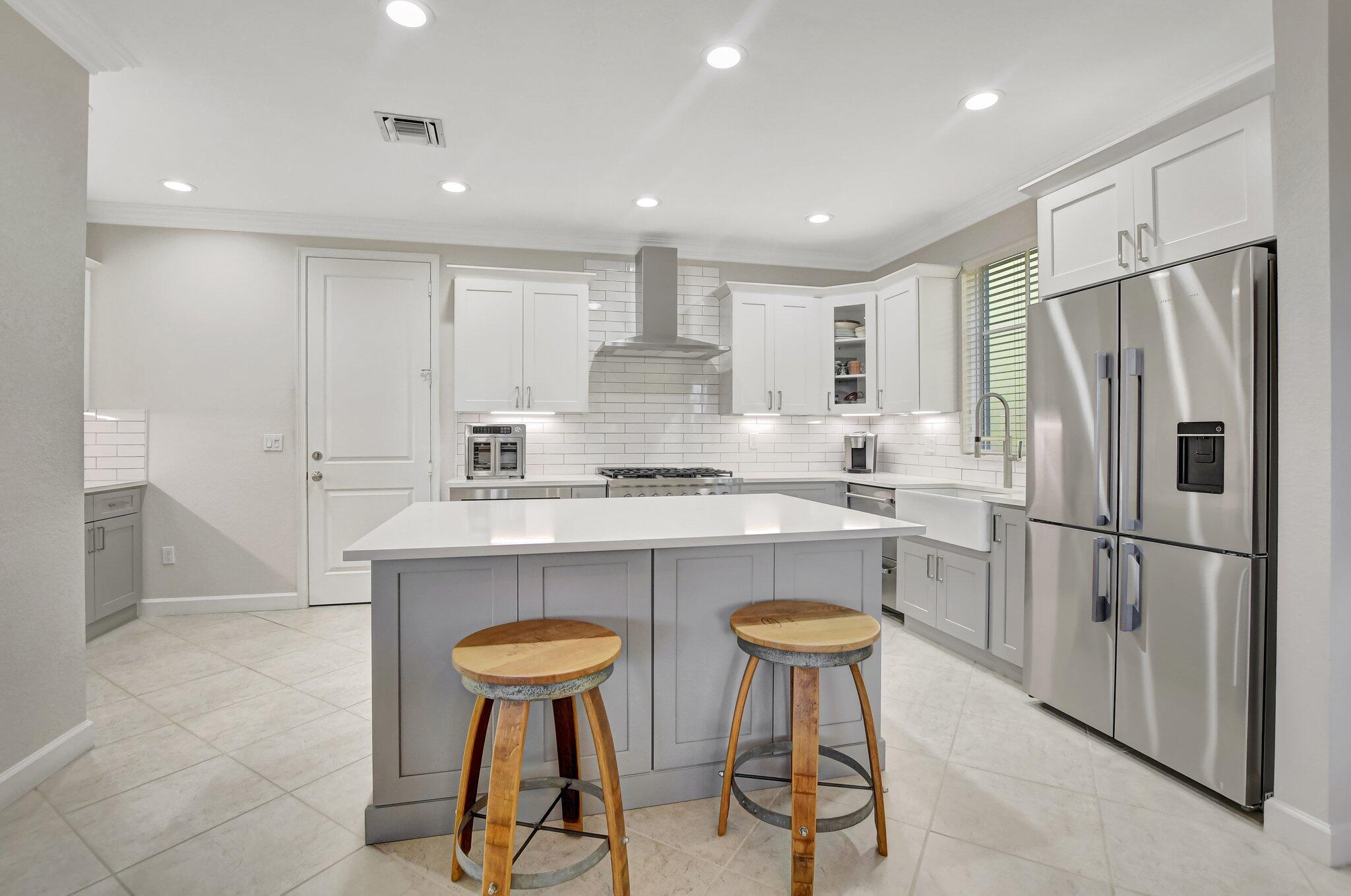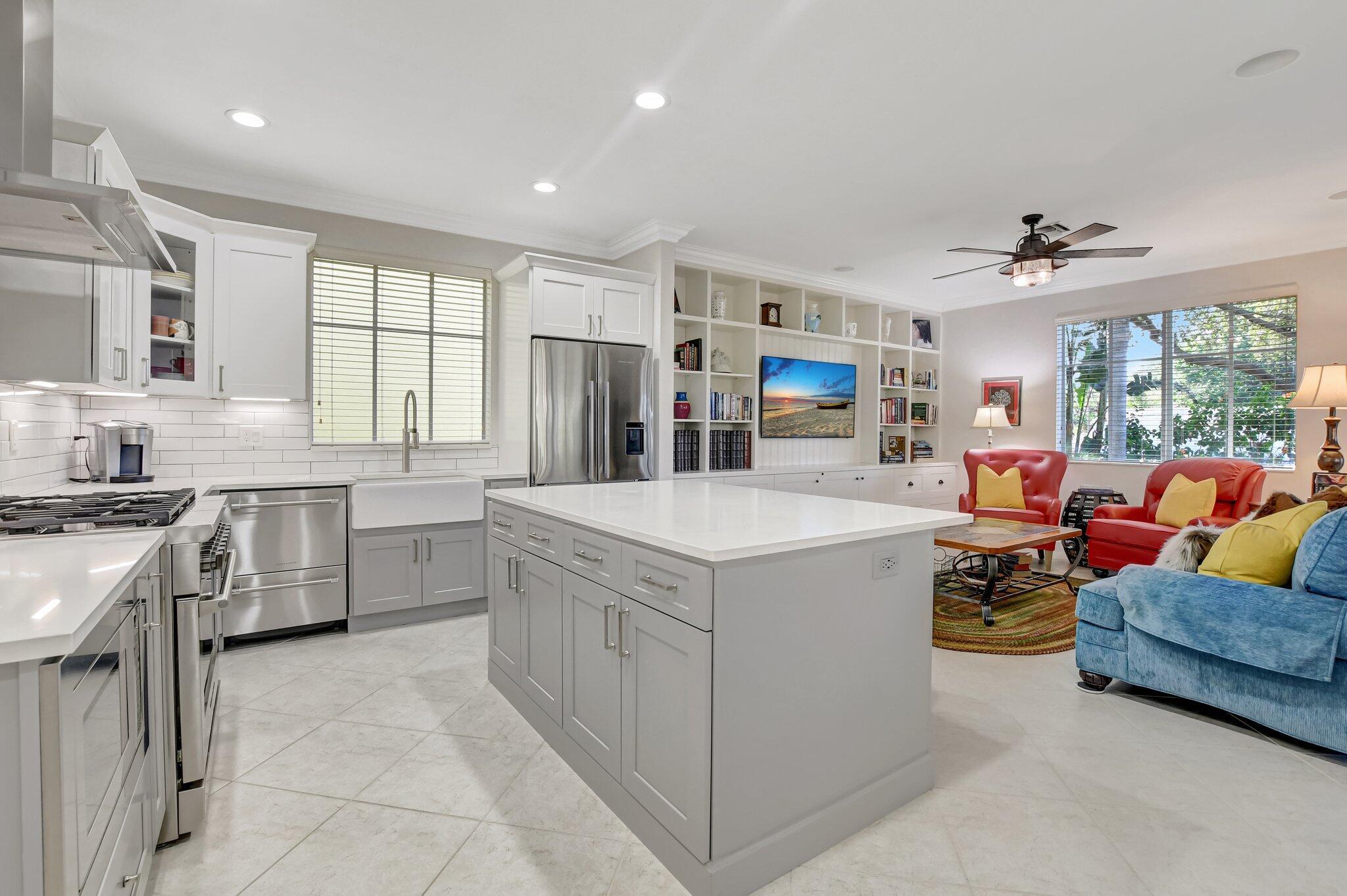 In the heart of East Boca, beautifully renovated single-family home in the picturesque community of Library Commons. The charming open concept with an abundance of light is perfect for entertaining. This stunning 4 bedroom, 2.5 bath residence, complete with office, has it all and embodies the essence of South Florida living and charm. The high-end kitchen features quartz countertops, an abundance of soft close cabinetry, Fisher & Paykel stainless steel appliances including a six-burner gas stove, a double drawer dishwasher, and built-in microwave, farmhouse sink, large kitchen island with storage, and a walk-in pantry are just a few things that make this kitchen so wonderful and functional.The kitchen seamlessly flows into a large family room, perfect for casual living which features