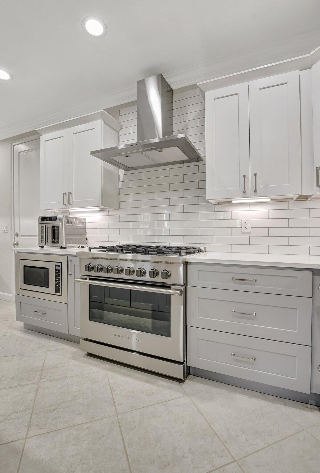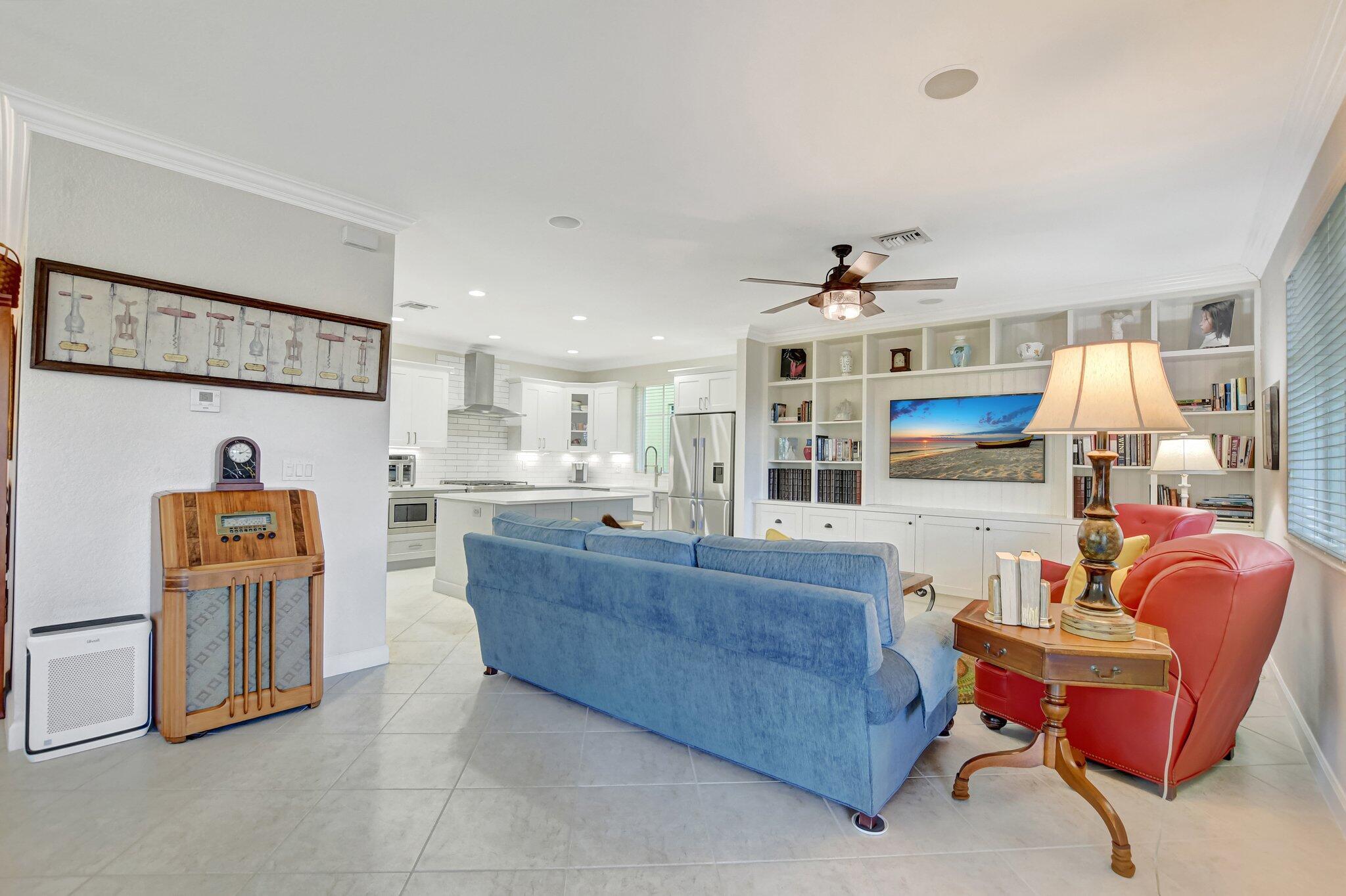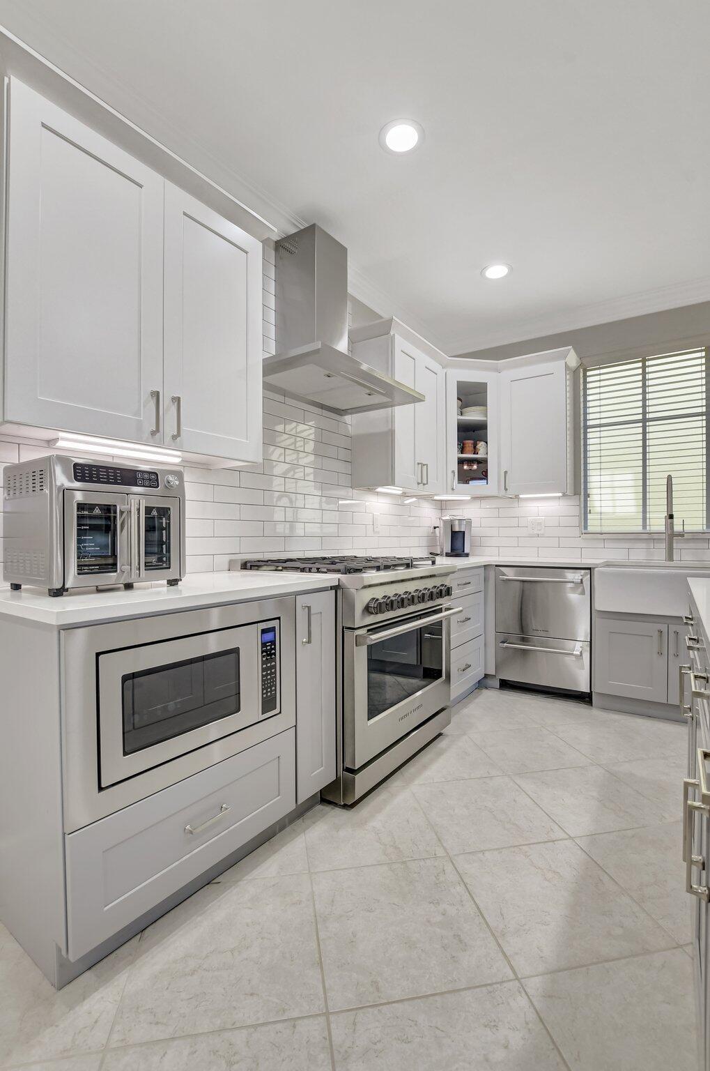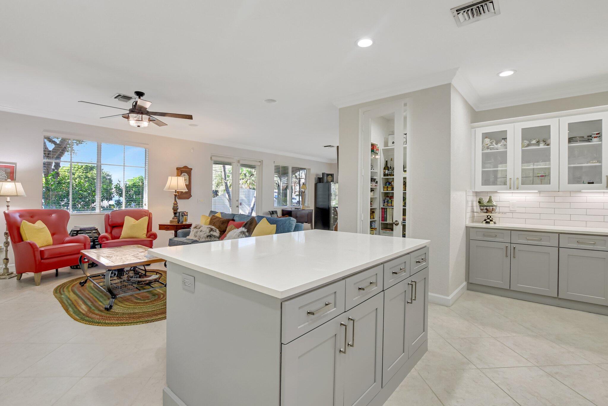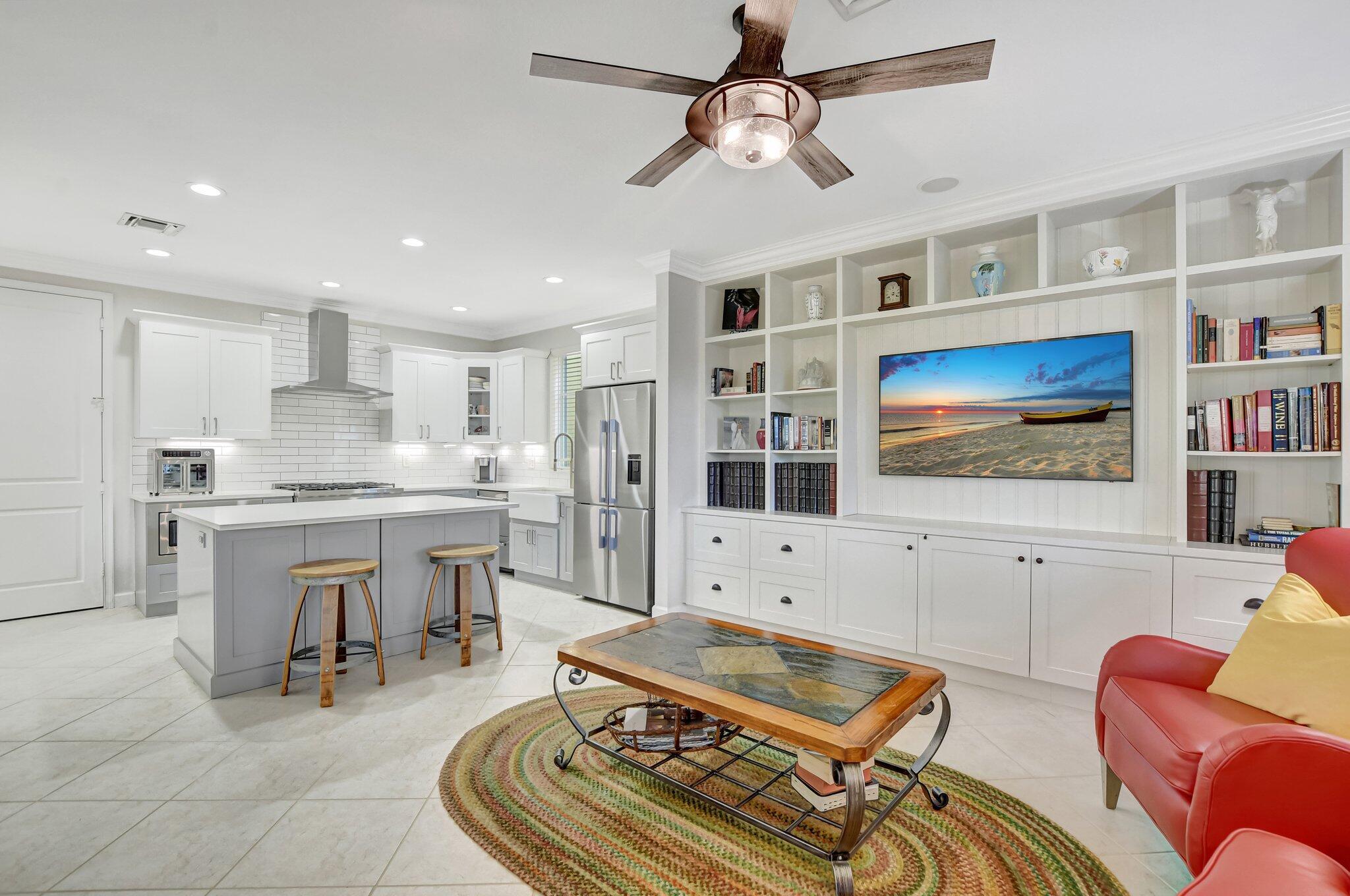 In the heart of East Boca, beautifully renovated single-family home in the picturesque community of Library Commons. The charming open concept with an abundance of light is perfect for entertaining. This stunning 4 bedroom, 2.5 bath residence, complete with office, has it all and embodies the essence of South Florida living and charm. The high-end kitchen features quartz countertops, an abundance of soft close cabinetry, Fisher & Paykel stainless steel appliances including a six-burner gas stove, a double drawer dishwasher, and built-in microwave, farmhouse sink, large kitchen island with storage, and a walk-in pantry are just a few things that make this kitchen so wonderful and functional.The kitchen seamlessly flows into a large family room, perfect for casual living which features