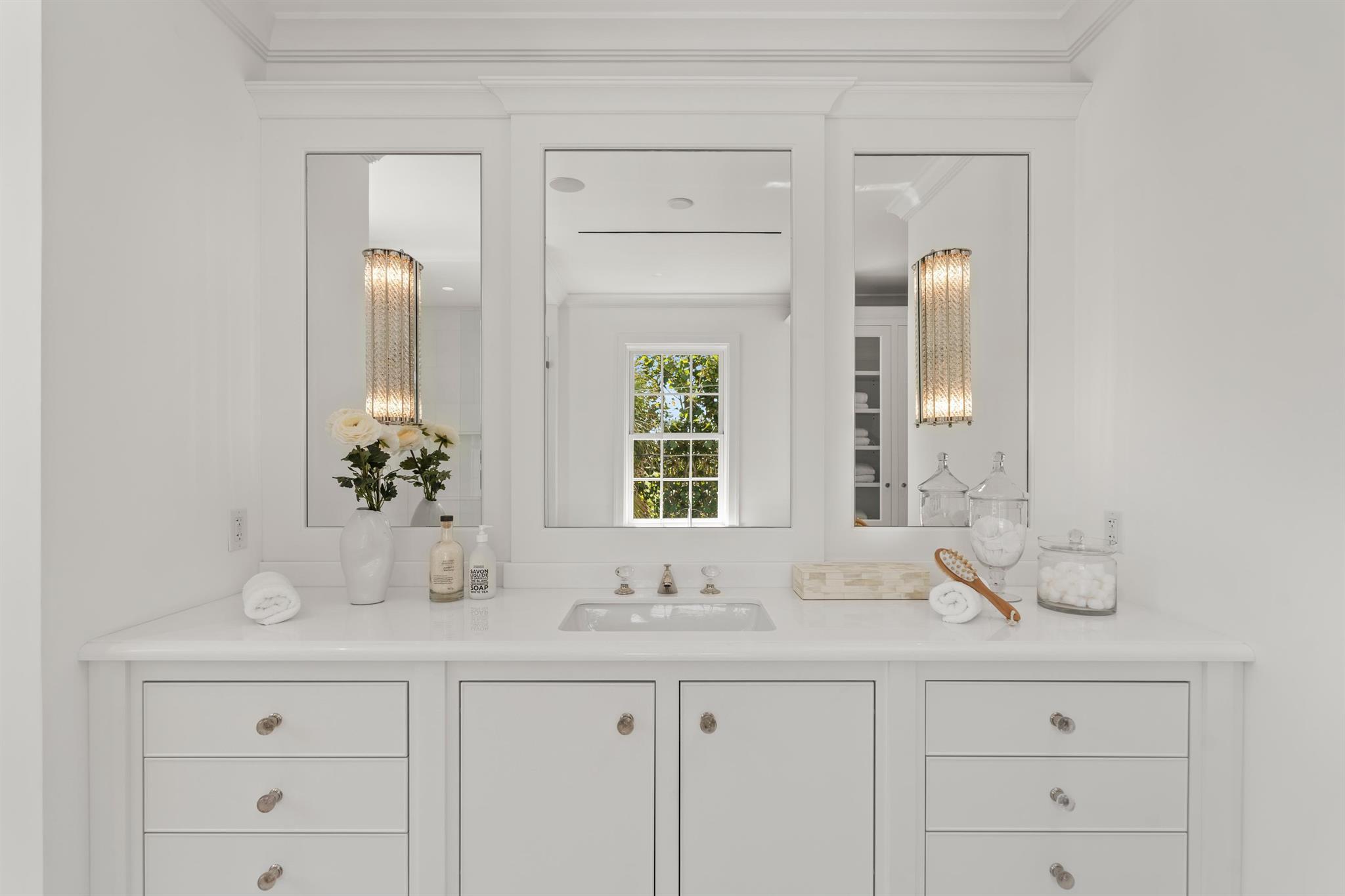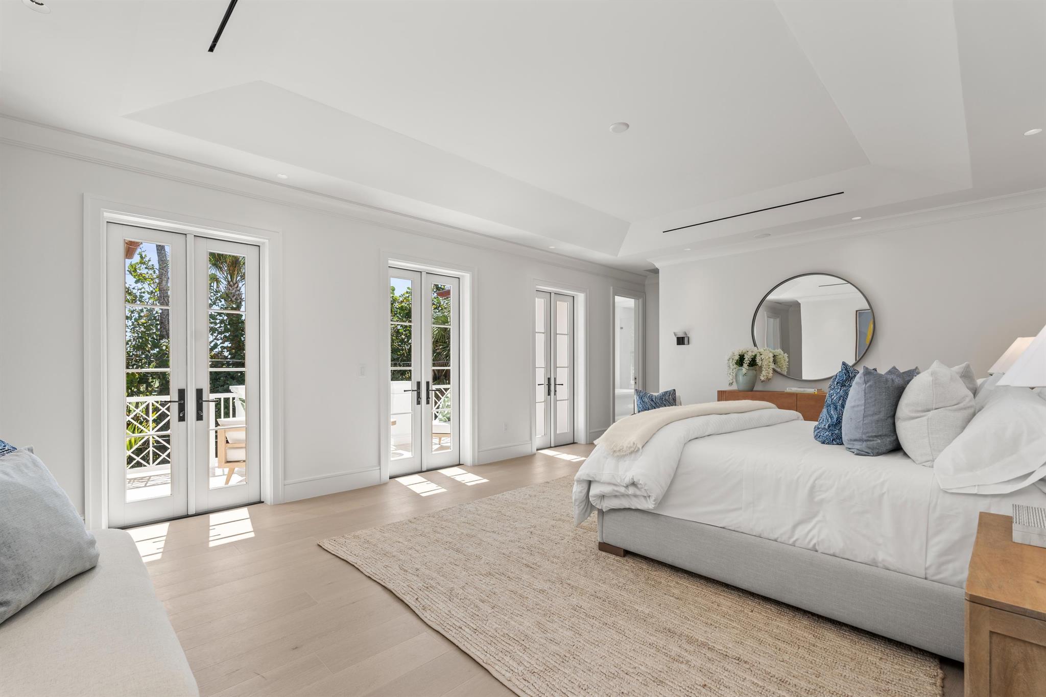 A ''PALM BEACH'' architectural gem has just been completed and is move-in ready. This exquisite home is south facing and includes a wonderful separate guest house overlooking the swimming pool. With over 5,700 sq. ft., there's a total of 4 bedrooms and 6 and 1/2 baths, all with WaterWorks fixtures. Stunning details include vaulted and trayed ceilings, white oak floors and beautiful millwork creating a luxury experience. This light filled home includes a separate library, dining room, eat in kitchen and outdoor covered loggia all of which are ideal for entertaining. The master bedroom has separate his/her closets and bathrooms with an oversized private terrace. Additional features include an elevator, an oversized 2 car garage and a full house generator. Landscape was designed SEE MORE: