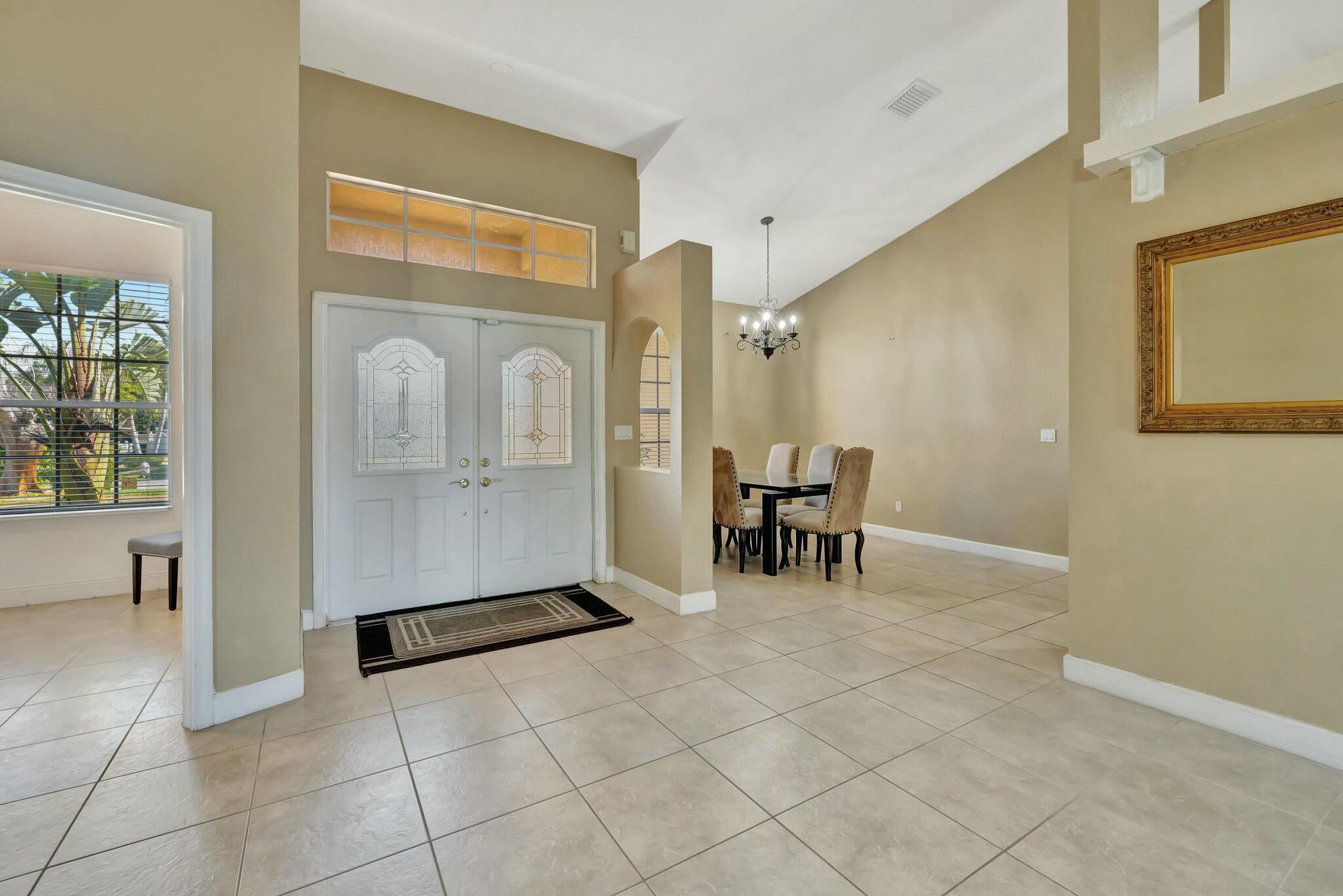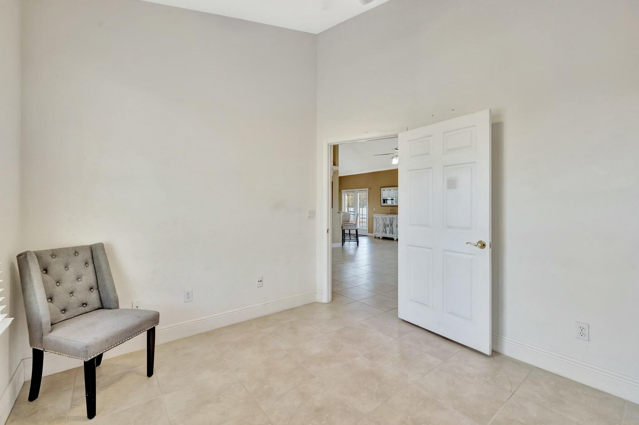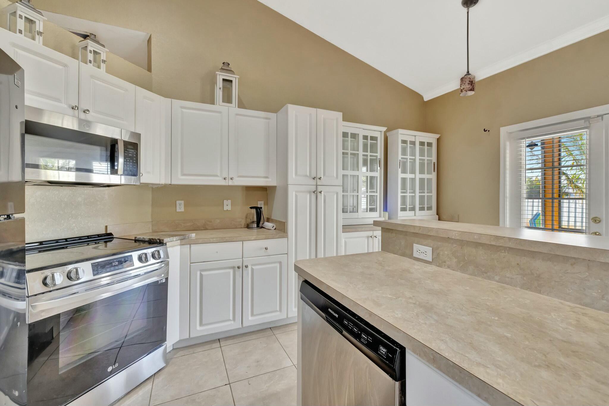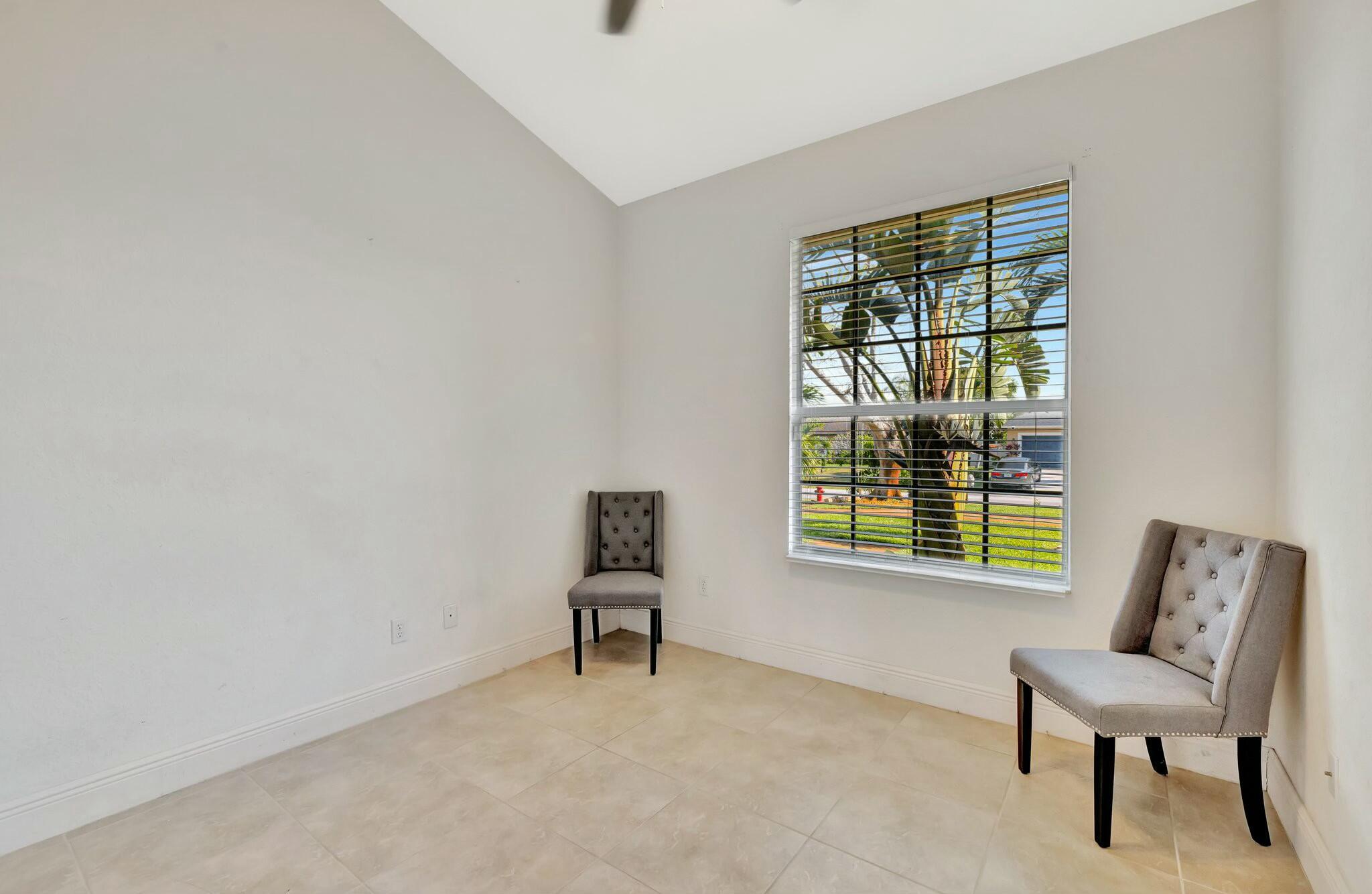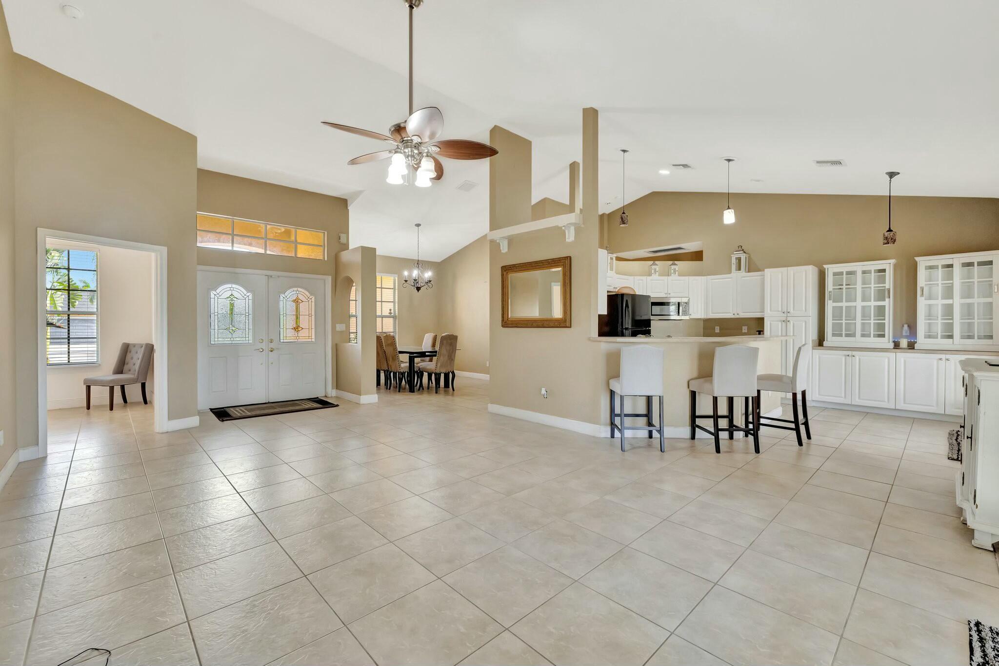 This beautiful 3BR, 2BTH CBS home with den/office in Port Saint Lucie near Becker awaits you. There is tile throughout main areas with wood laminate in secondary bedrooms and bamboo in Master. Black and stainless appliances in kitchen and a beautiful pantry. Once you enter the home you will see the open living room with formal dining area and breakfast/bar area off the kitchen. This home has vaulted ceiling with fans and HUGE Master B/R with his/her walk-in closet. Master bath has Roman tub, glass walk-in shower and dual sinks. Large screened tiled open patio, privacy fence. Quiet street and great location with easy access to I-95 & Turnpike. Great area with everything close by. Come see for yourself. make an appointment. Mature fruit trees. Mangoes and coconut