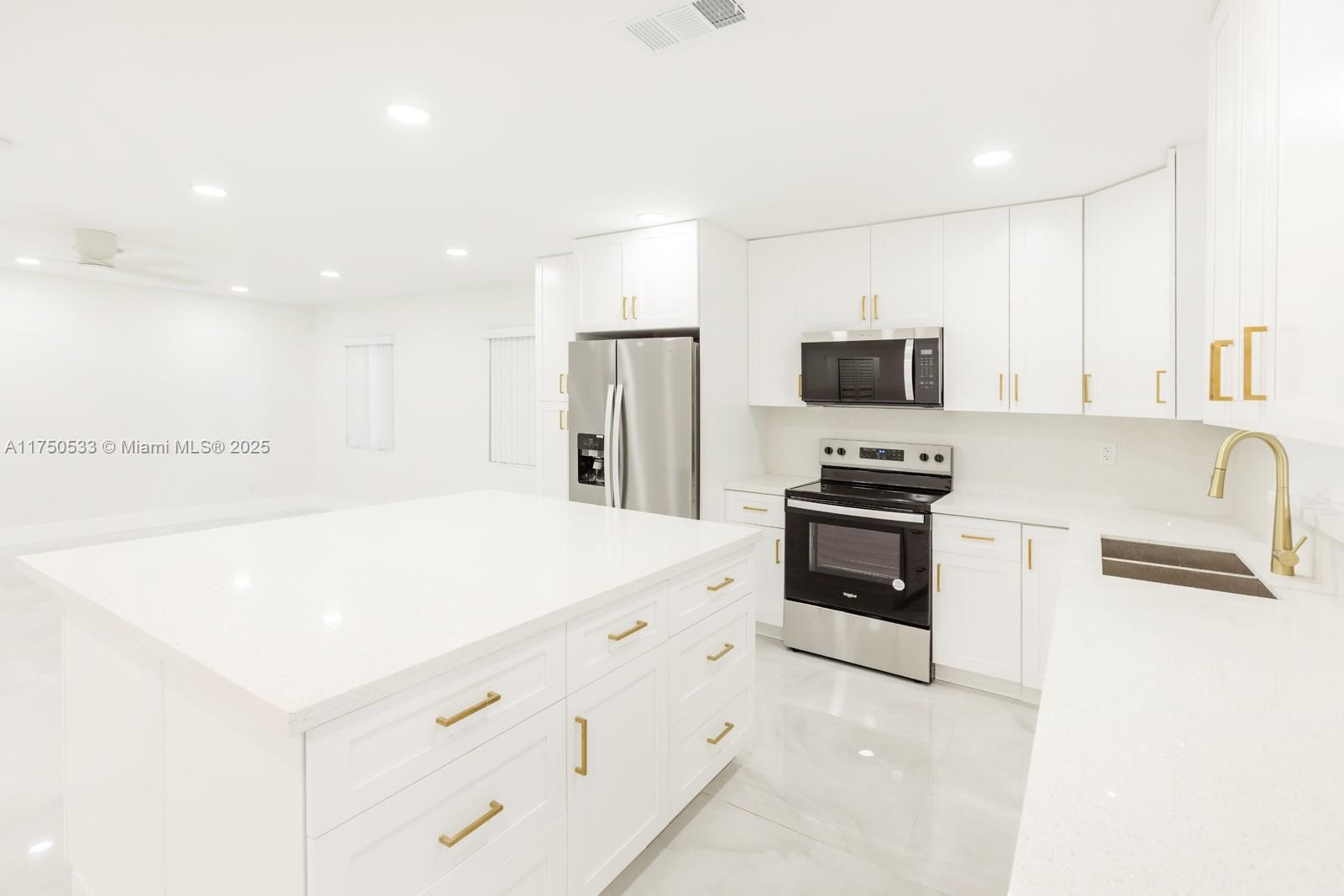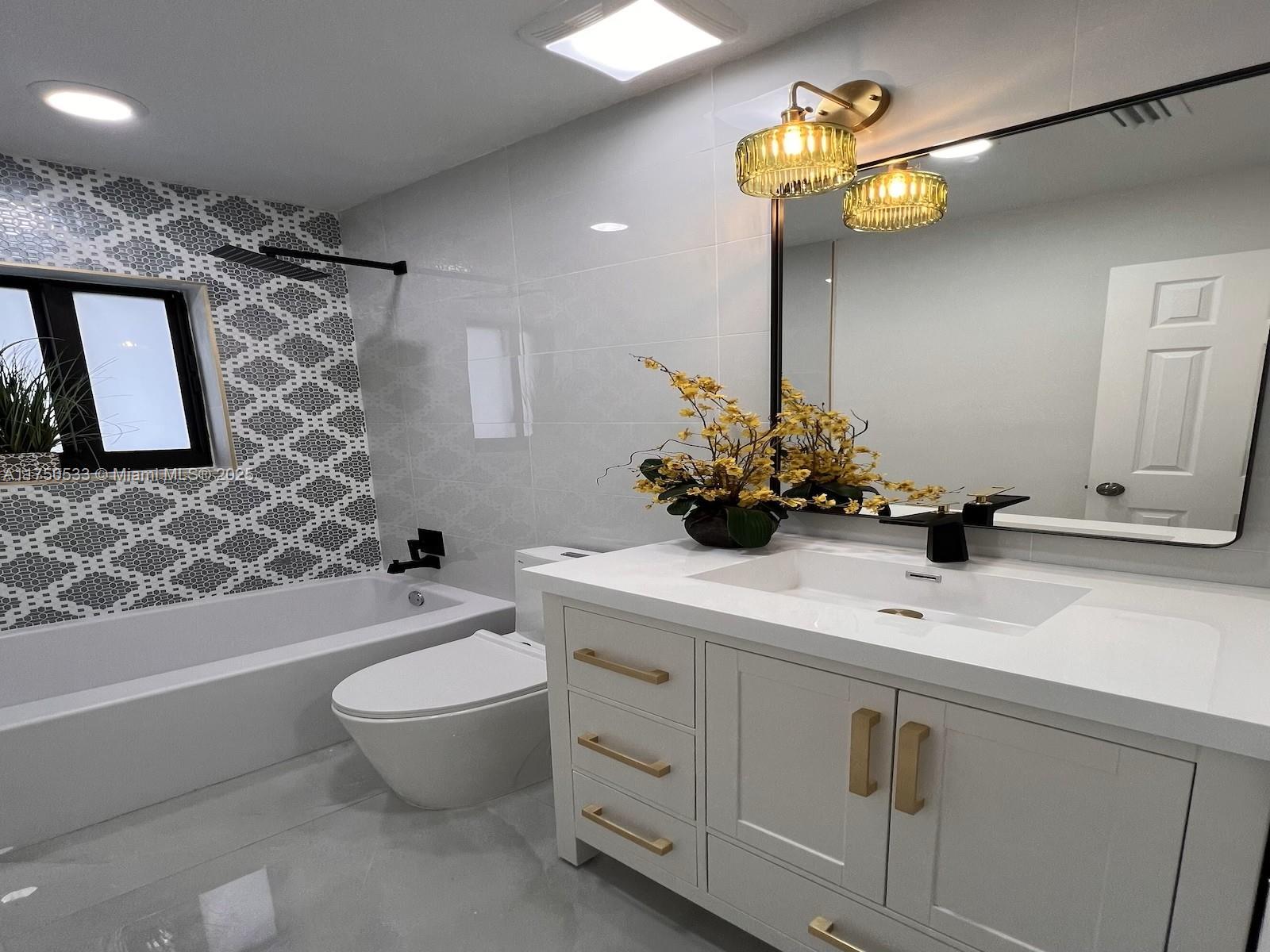 This breathtaking 4-bedroom, 2-bathroom home boasts a 2-car garage and has been meticulously remodeled with high-end finishes throughout. Elegant porcelain tile flooring graces every room, complemented by modern color tones that create a luxurious ambiance. The home features a 2012 roof, inpact windows and doors, New A/C, brand-new appliances, and custom solid wood cabinetry with exquisite gold fixtures, a true retreat, featuring a spacious walk-in shower and his-and-hers sinks. With a thoughtfully designed split floor plan, this home offers both privacy and convenience. Ideally located with easy access to major highways, the beach, and the airport, this home is the perfect blend of style and function.
