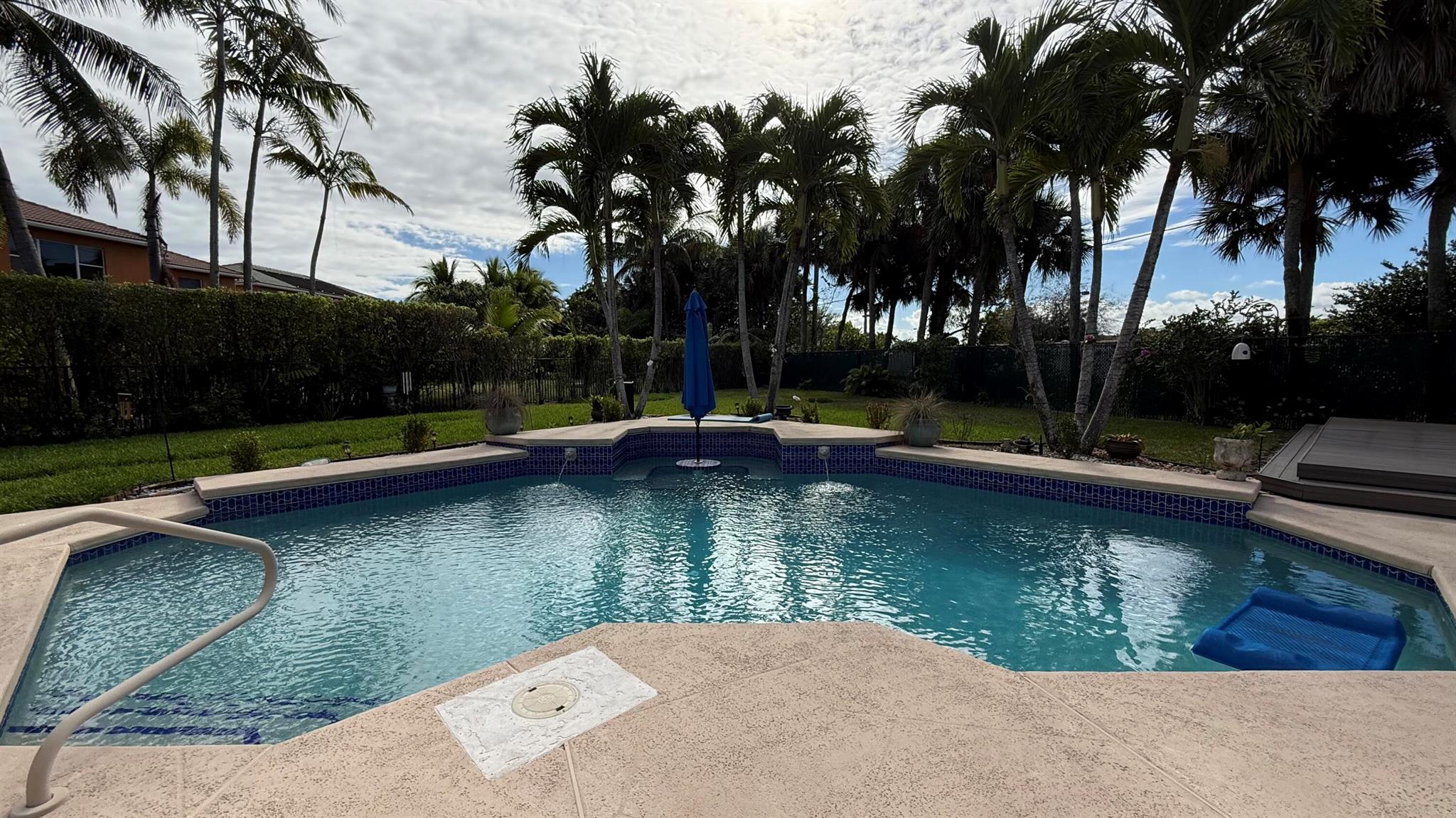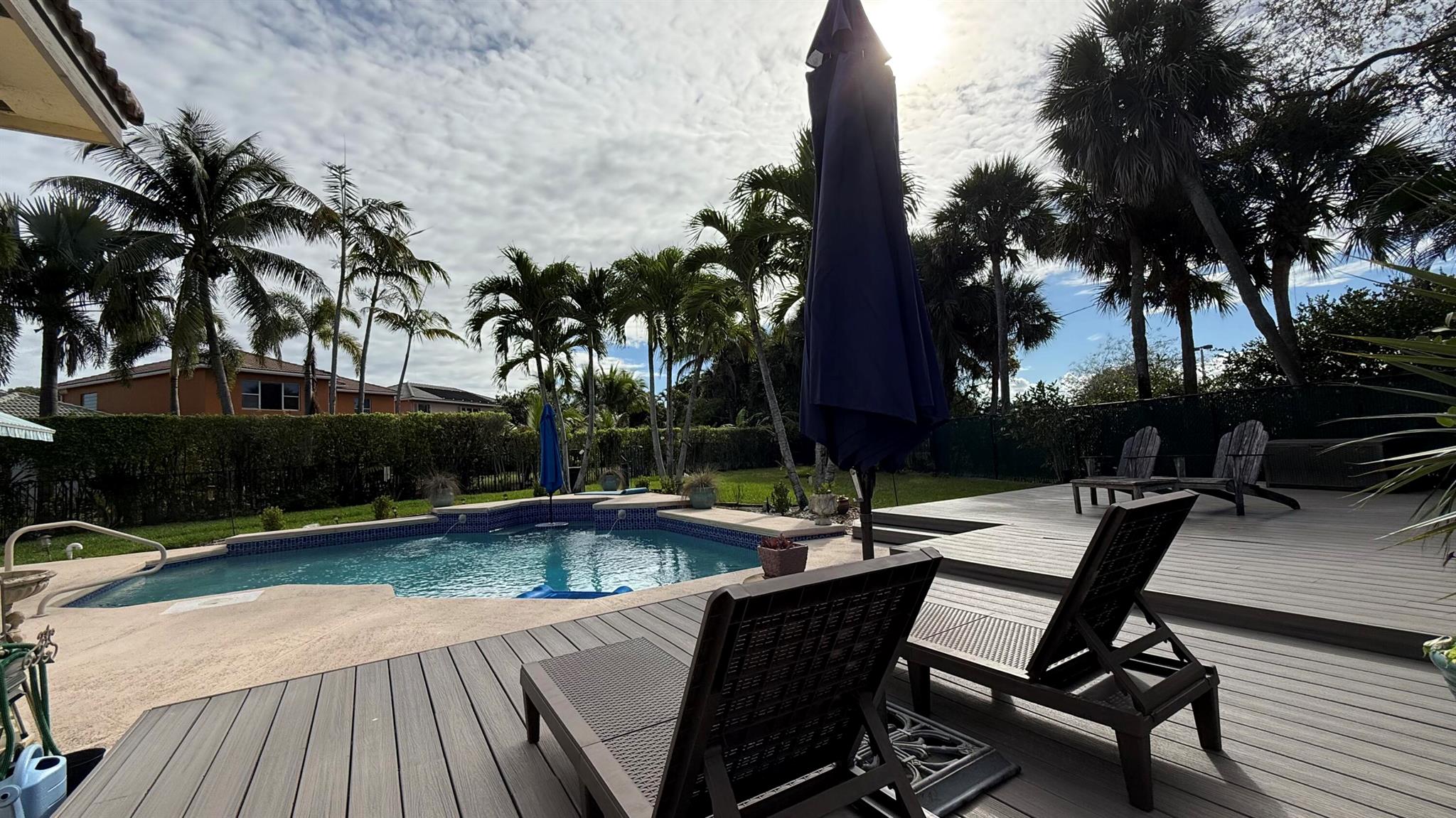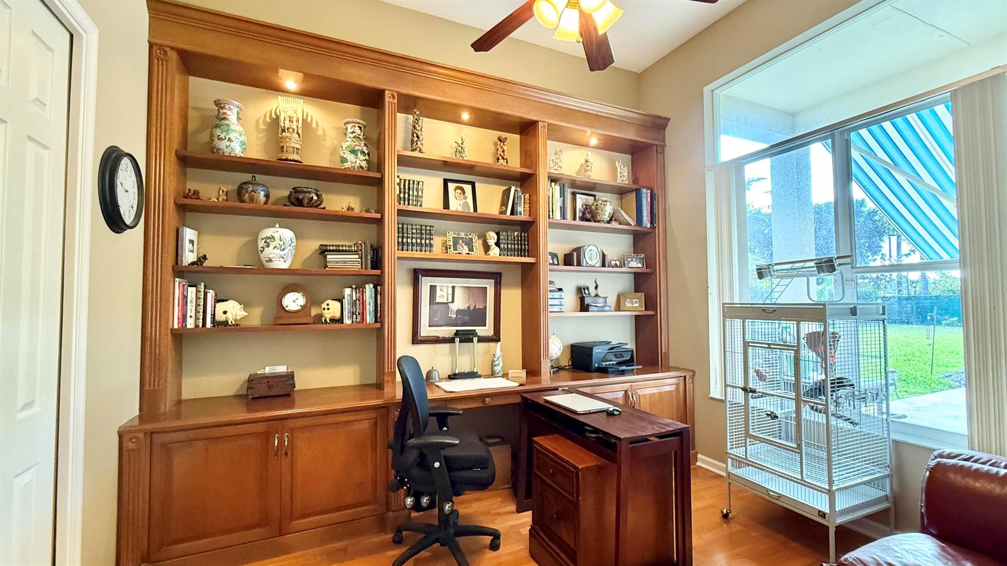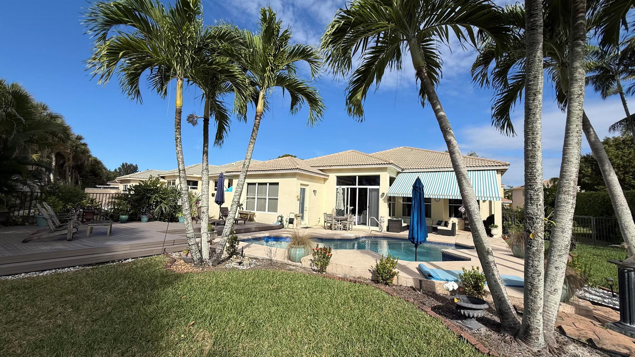 Wow!!! What a magnificent property! This spacious home boasts an amazing backyard retreat that looks like a high end resort pool area! The Freeform heated pool has a ''seating'' area, perfect for pool parties and fun games! There is an area of ''all weather'' decking surrounding the pool for lounging and sunning, plus a covered space with a retractable awning. Inside is just as appealing... as you enter the large foyer you will immediately be impressed by the 12 ft ceilings and how the floor plan flows from living, dining and on to the large open kitchen and family area. The 4th bedroom has been converted to an elegant office/den with custom built ins. The two guest bedrooms share a bathroom and the principal bedroom is a generous size with tray ceilings, an enormous closet and