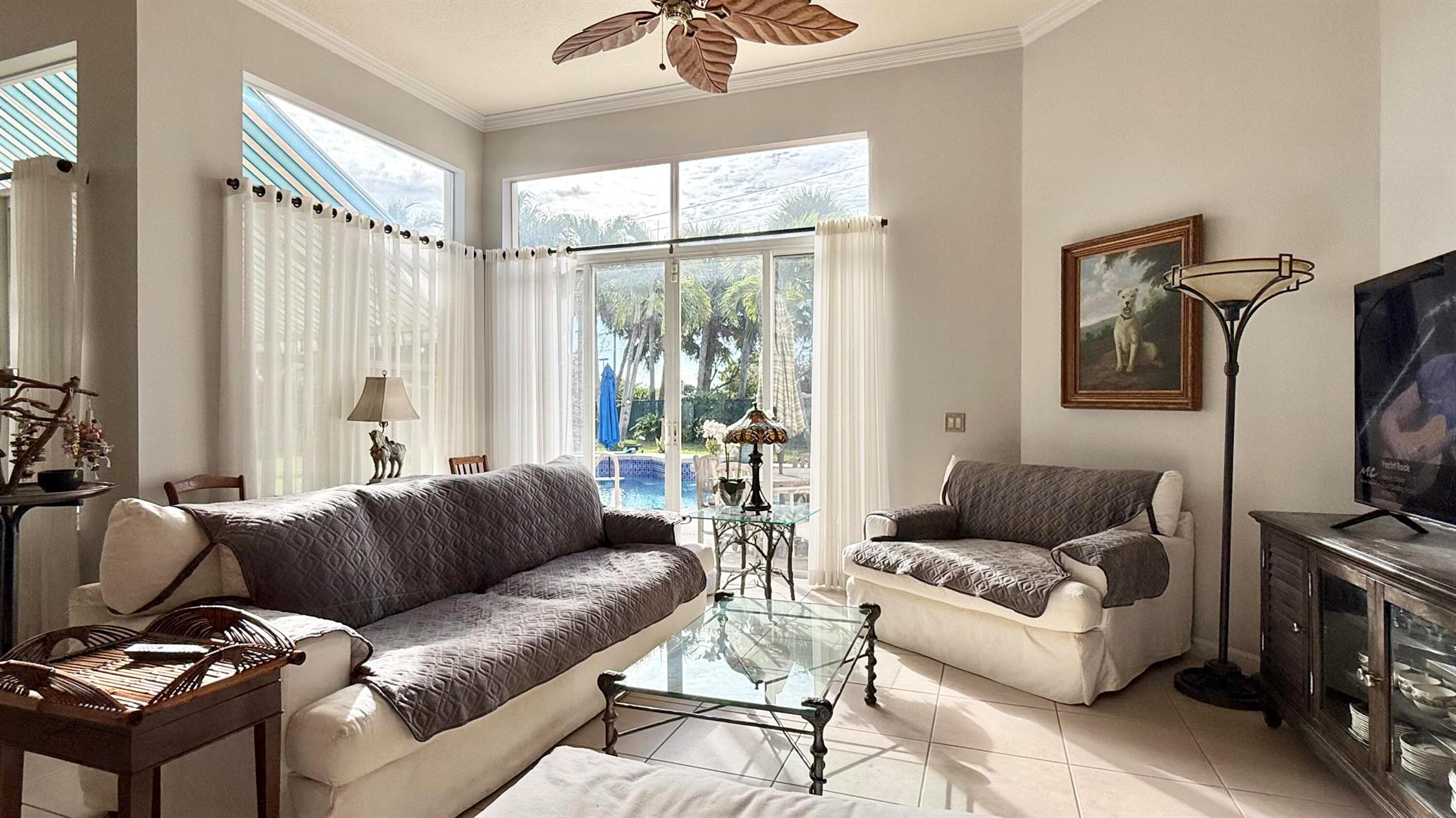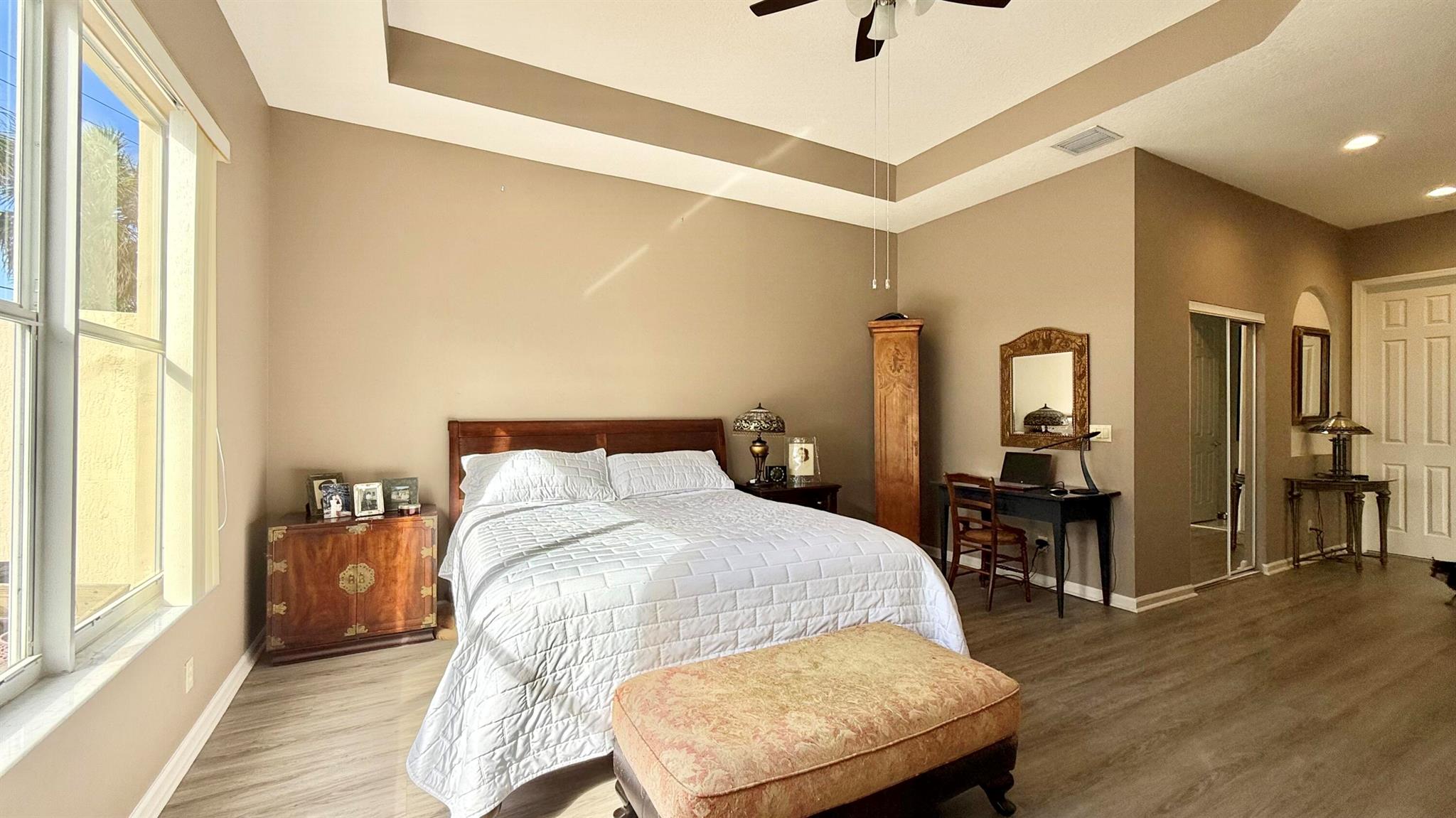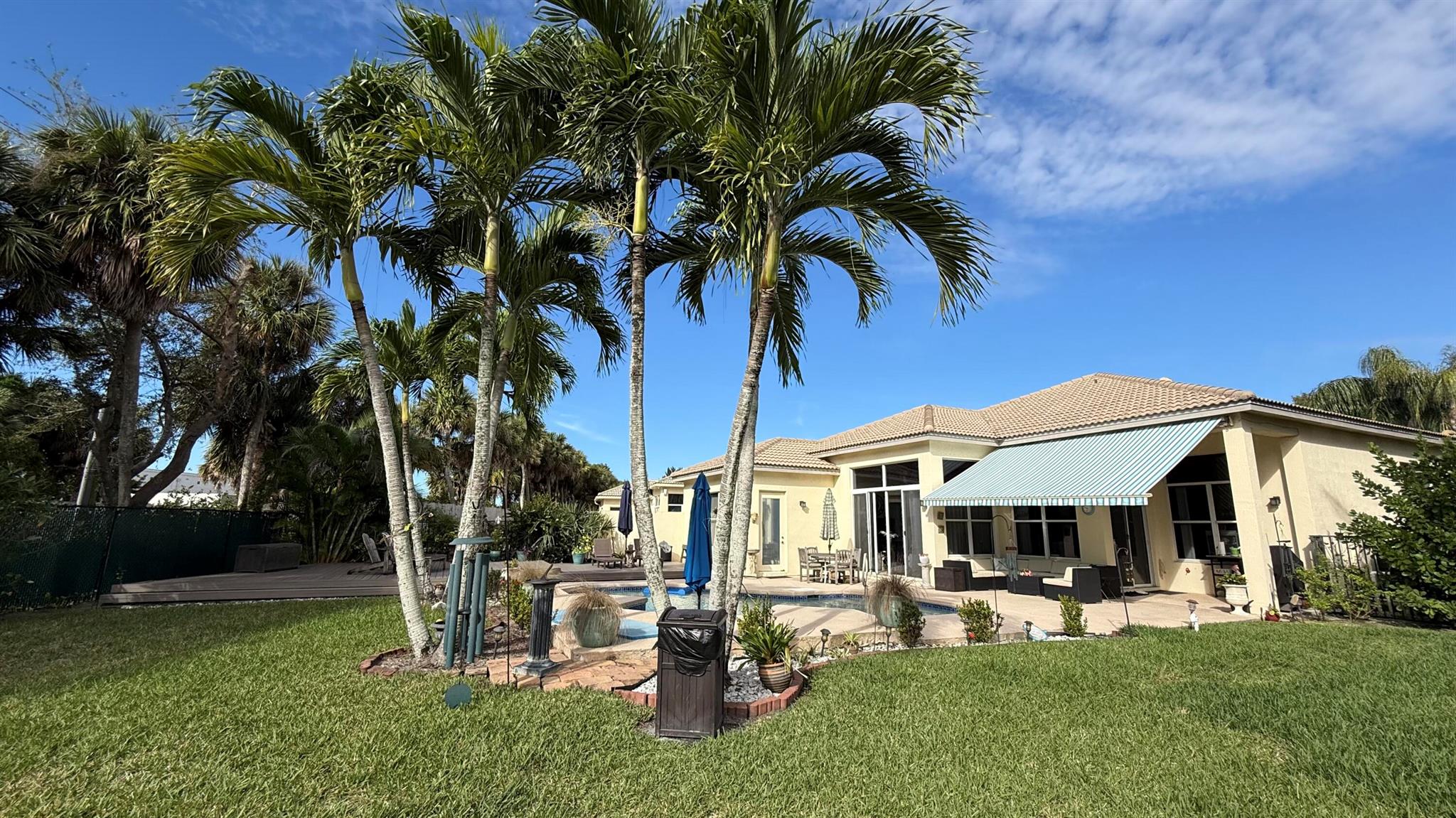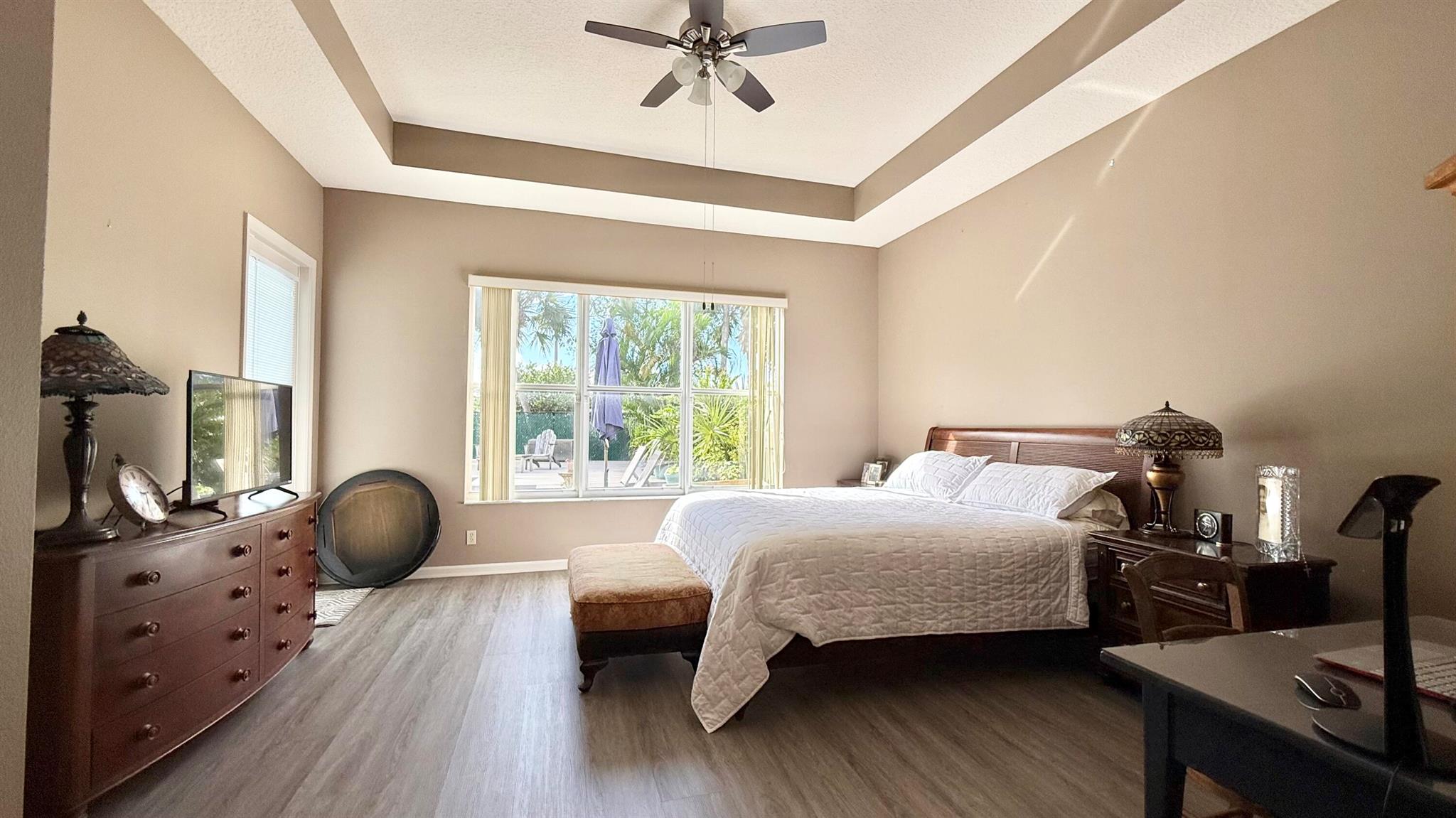Wow!!! What a magnificent property! This spacious home boasts an amazing backyard retreat that looks like a high end resort pool area! The Freeform heated pool has a ''seating'' area, perfect for pool parties and fun games! There is an area of ''all weather'' decking surrounding the pool for lounging and sunning, plus a covered space with a retractable awning. Inside is just as appealing... as you enter the large foyer you will immediately be impressed by the 12 ft ceilings and how the floor plan flows from living, dining and on to the large open kitchen and family area. The 4th bedroom has been converted to an elegant office/den with custom built ins. The two guest bedrooms share a bathroom and the principal bedroom is a generous size with tray ceilings, an enormous closet and