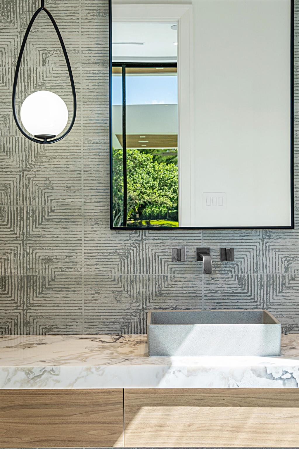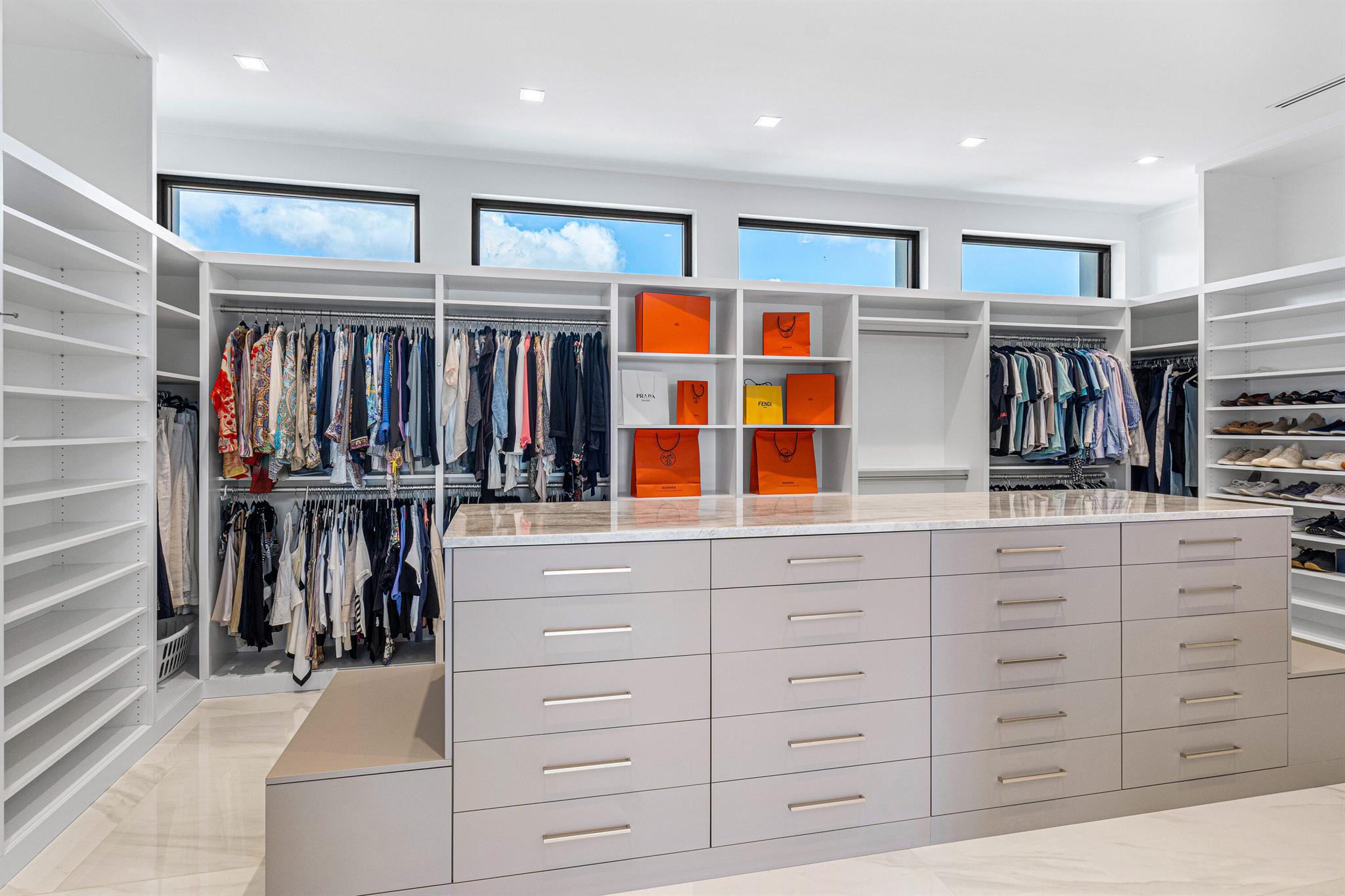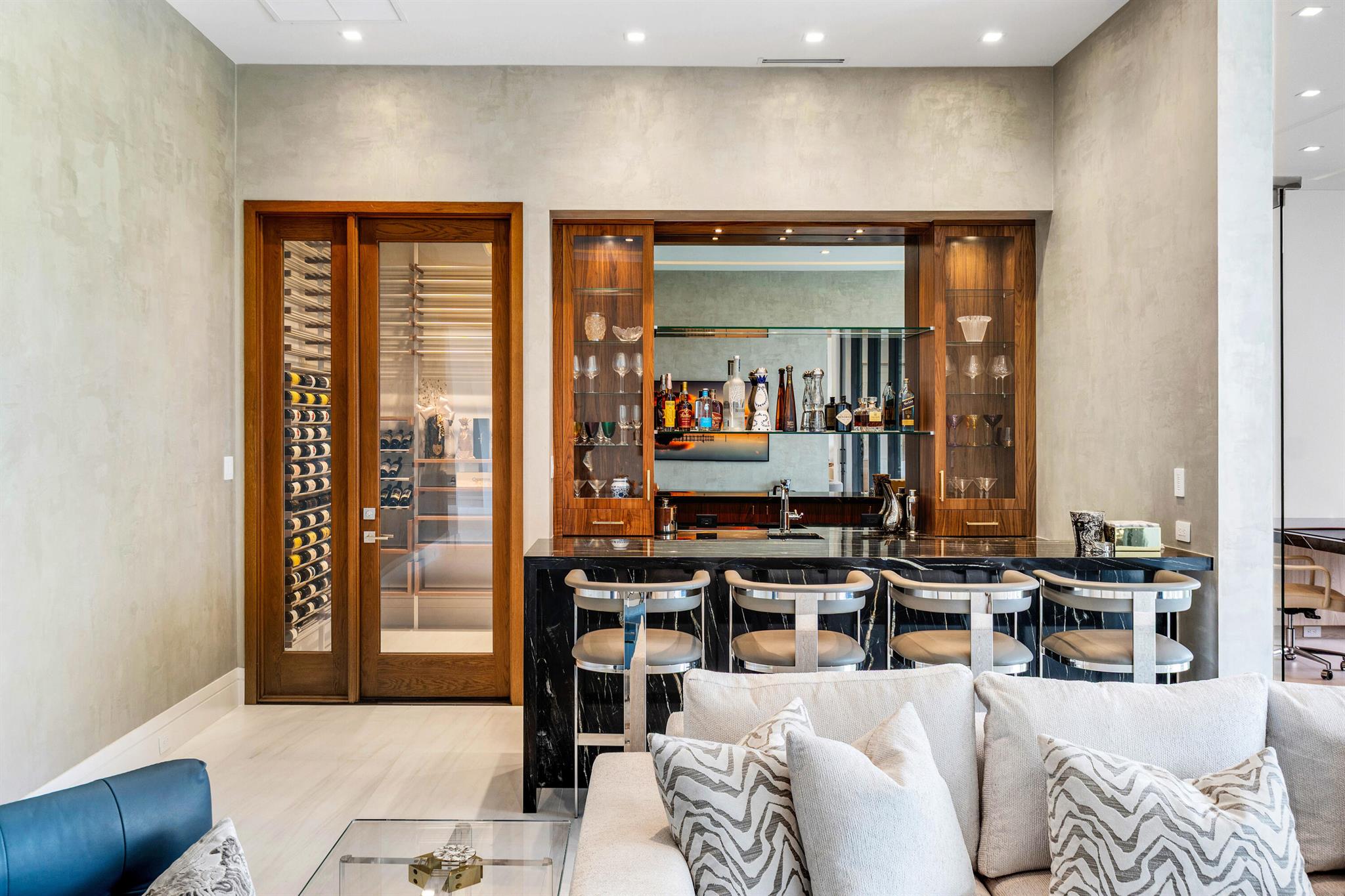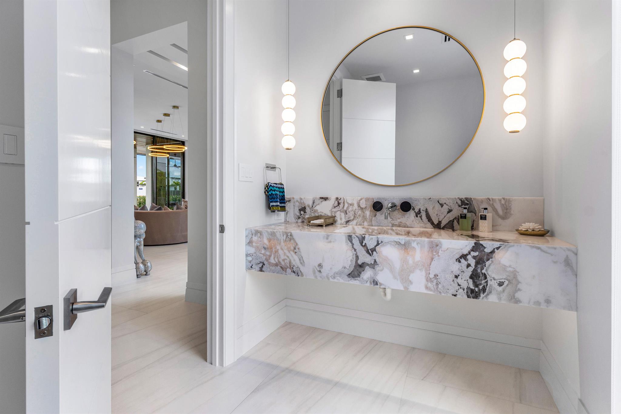 Welcome to The Marble Palm Estate, a British West Indies-inspired masterpiece, just steps from the beach. Nestled on 119 feet of deep-water frontage, this newly constructed estate offers 5 bedrooms, 5.2 baths, and an exquisite blend of sophisticated design and cutting-edge technology.Upon entry, you are greeted by a lovely living room featuring stunning Azure Blue Quartzite slabs around the gas fireplace and TV, adding a touch of natural beauty and elegance to the space. The open concept seamlessly flows into the gourmet chef's kitchen, which is framed by a beautiful Cypress wood ceiling, creating a warm and inviting atmosphere. The kitchen features bar seating for 5/6, offering an ideal spot for casual dining or entertaining. Outfitted with top-tier Wolf & Sub-Zero appliances, it is