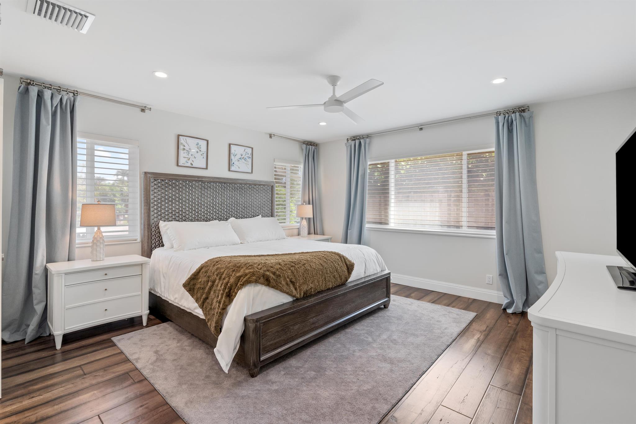 Welcome to this exquisite 4 bedroom, 4 1/2 bathroom single-family home, where each of the bedrooms is complemented by its own private ensuite. The heart of the home is the chef's kitchen, featuring a large island, built-in refrigerator, induction cooktop and a unique filtered, chilled water system right at the sink. The primary suite features a spa-like ensuite that includes a generous walk-in shower, separate soaking tub, and a walk-in closet with custom built-ins for maximum organization. A separate media room with sliders to the patio and additional storage completes this home, offering even more space to entertain or unwind. The expansive yard offers a sparkling pool, covered patio, and plenty of space for play. Have peace of mind with the energy efficient impact windows. Roof 2017