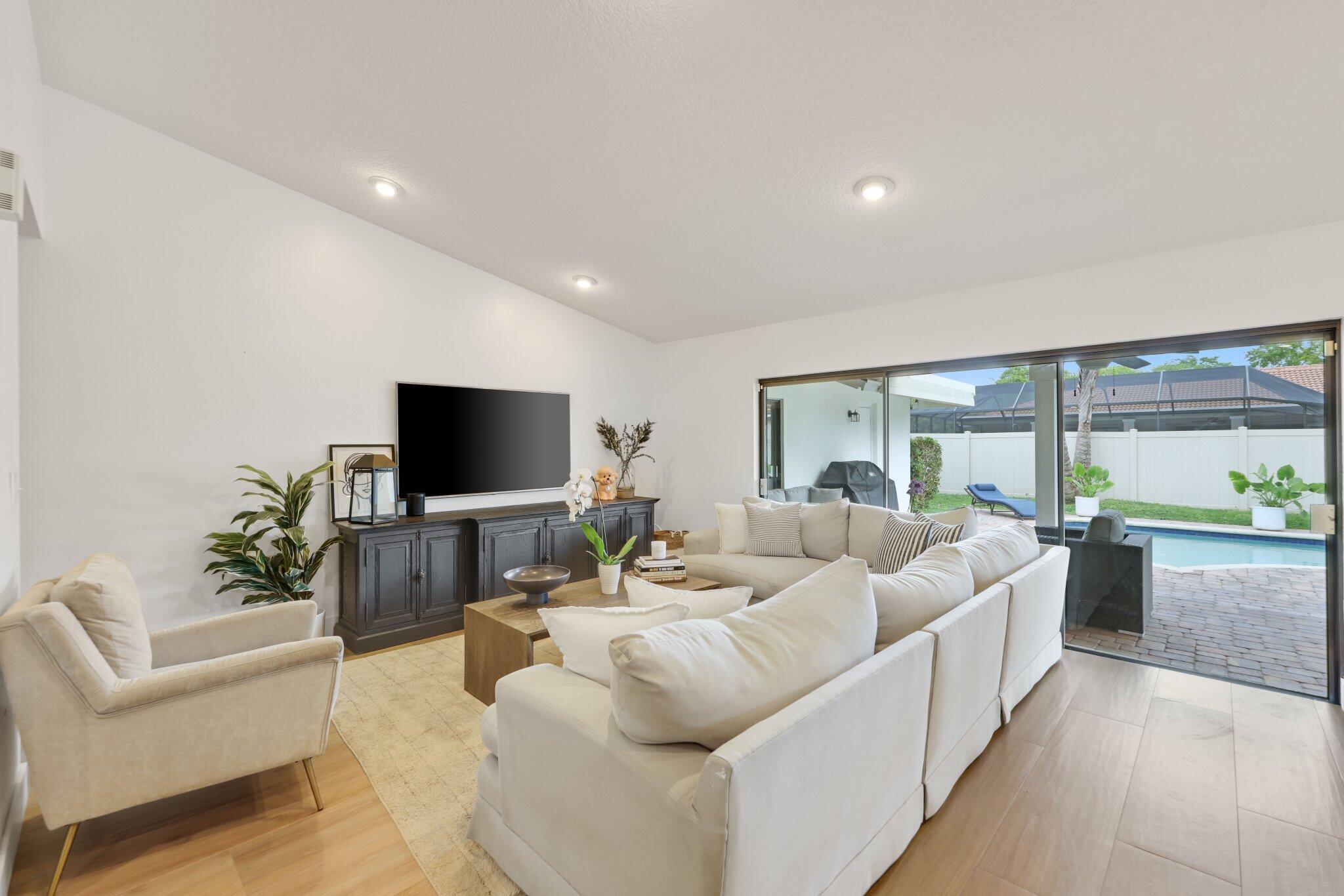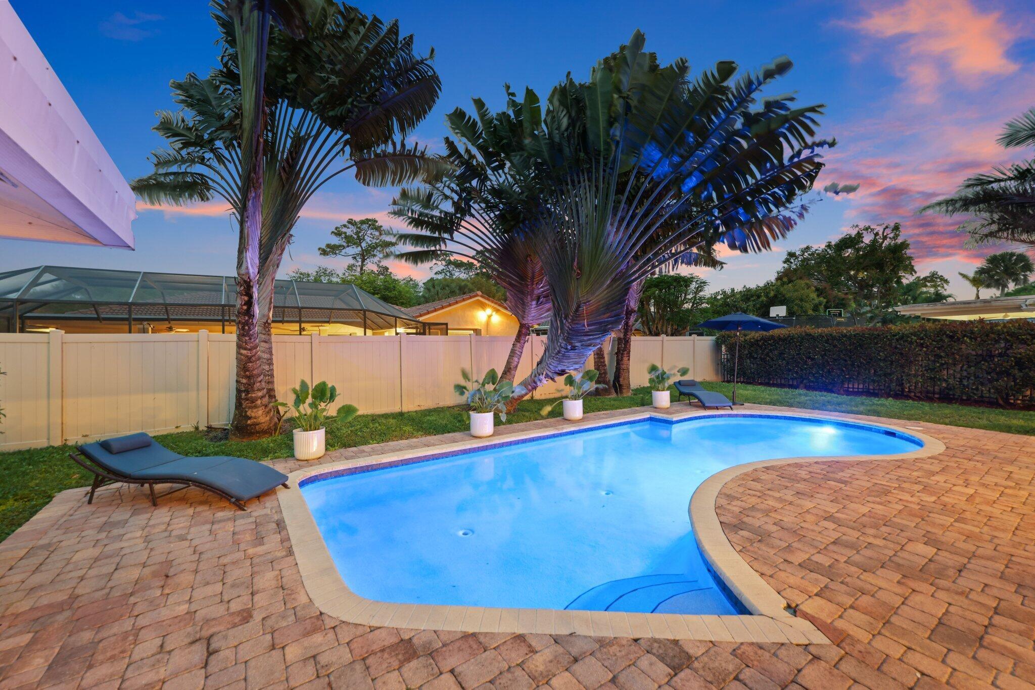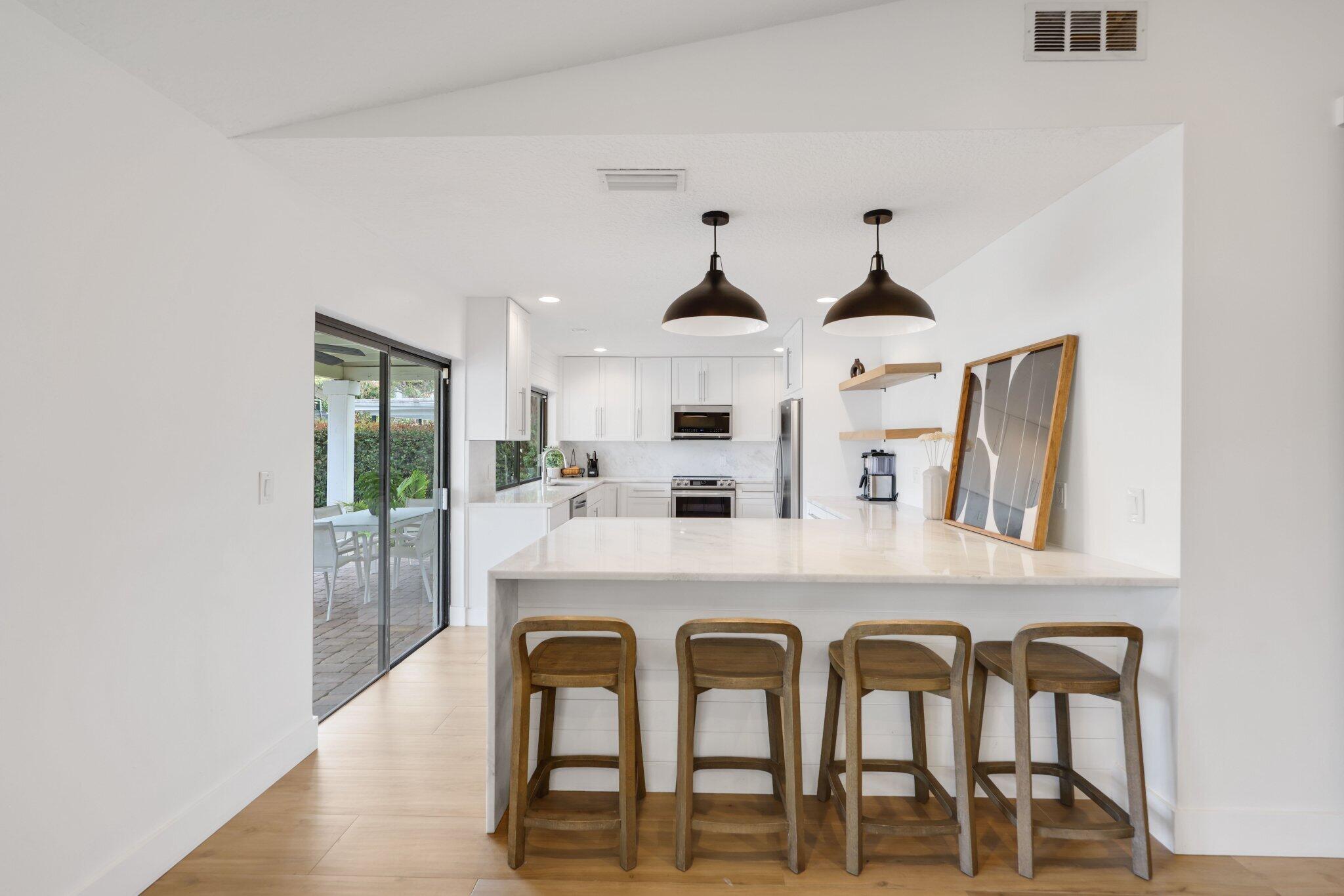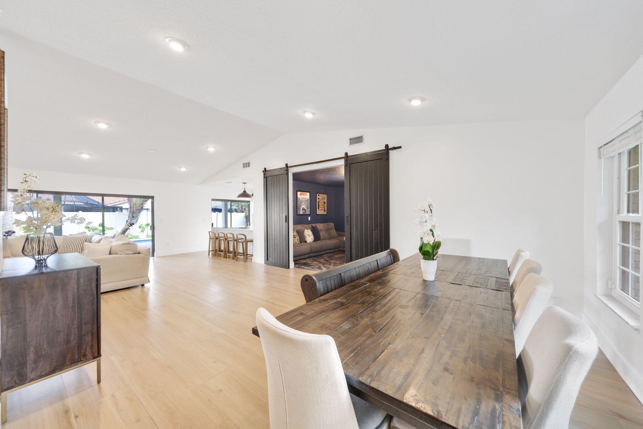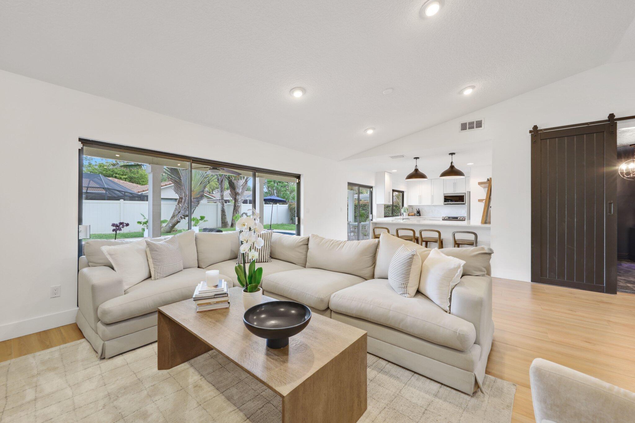 Welcome to this stunning, fully renovated home in Paseos, one of Boca Raton's most sought-after communities--where homes rarely become available. As you step inside, you'll immediately notice the open-concept design, enhanced by beautiful oversized white oak plank tile throughout. The kitchen is a true centerpiece, featuring a stunning translucent quartzite oversized peninsula with seating for 6-8. White oak floating shelves, custom soft-close pull-out drawers, and ample cabinetry. A dedicated movie room offers the perfect space to unwind for a cozy night in or entertain guests. This versatile room can also be converted into a bedroom, office, or playroom to fit your needs and lifestyle. Additional features include a brand-new washer and dryer, some impact windows, shutters throughout, a
