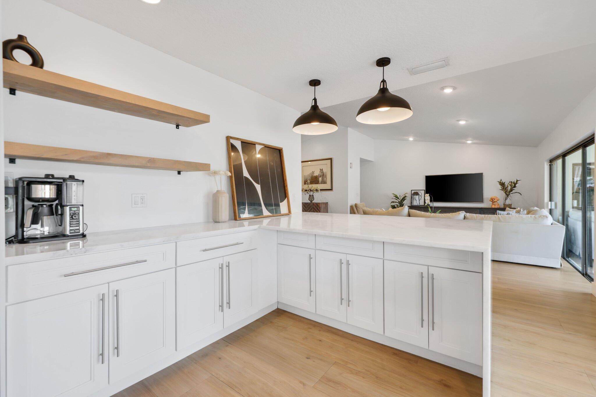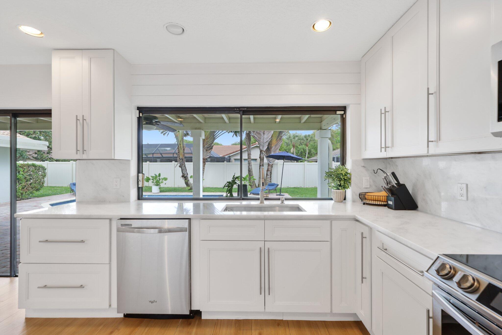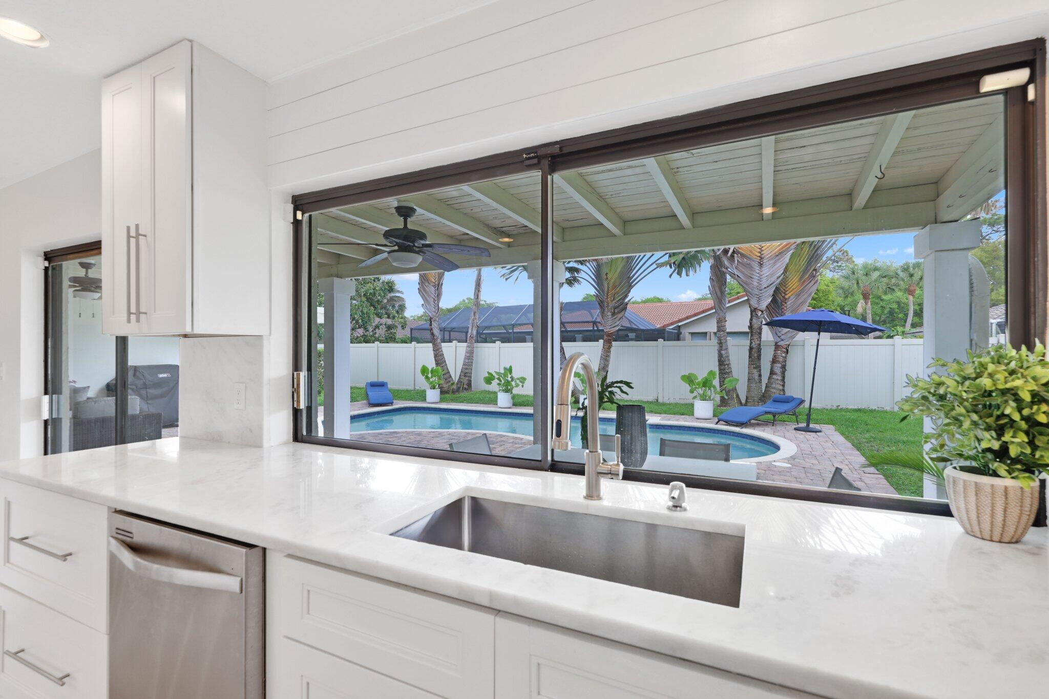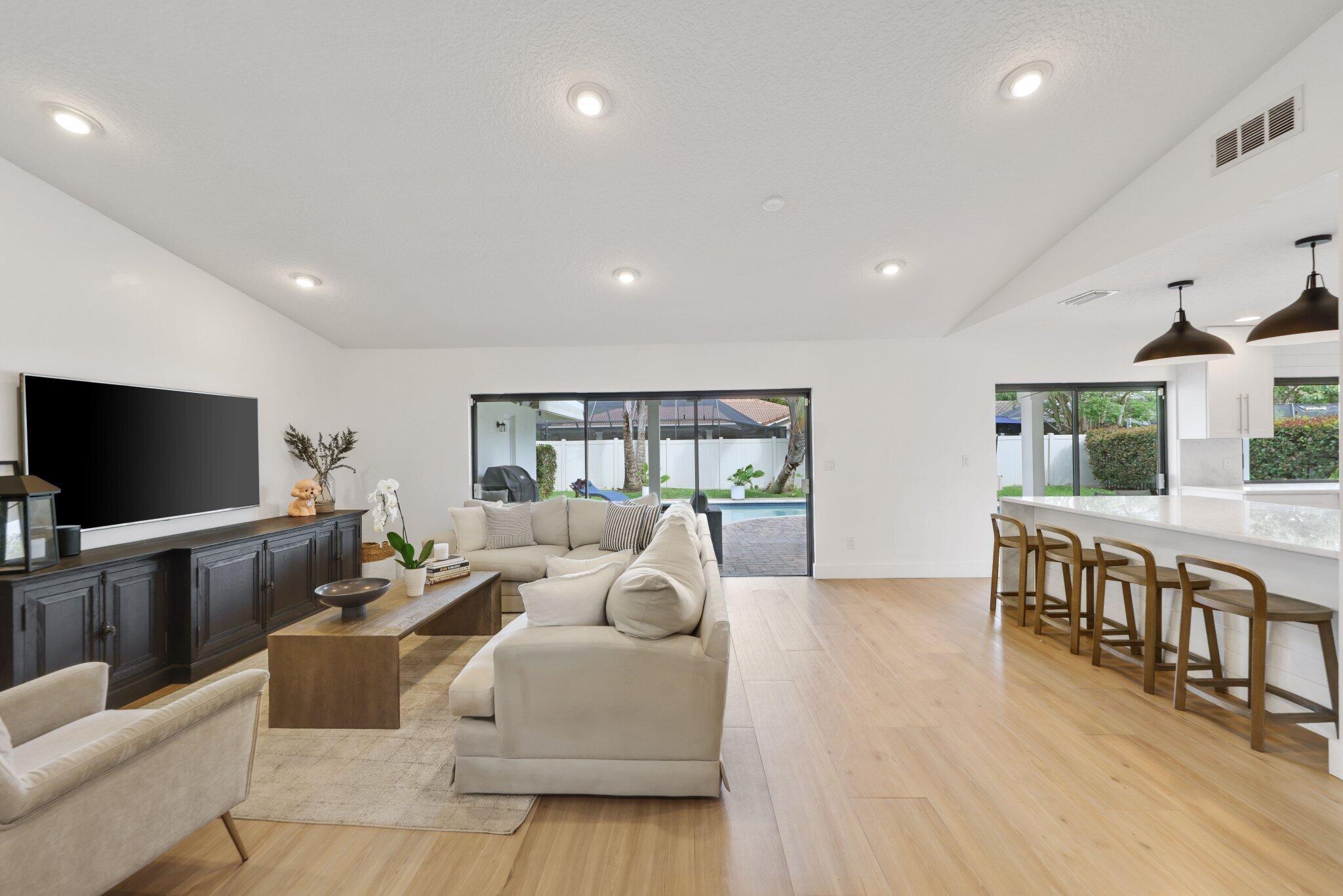 Welcome to this stunning, fully renovated home in Paseos, one of Boca Raton's most sought-after communities--where homes rarely become available. As you step inside, you'll immediately notice the open-concept design, enhanced by beautiful oversized white oak plank tile throughout. The kitchen is a true centerpiece, featuring a stunning translucent quartzite oversized peninsula with seating for 6-8. White oak floating shelves, custom soft-close pull-out drawers, and ample cabinetry. A dedicated movie room offers the perfect space to unwind for a cozy night in or entertain guests. This versatile room can also be converted into a bedroom, office, or playroom to fit your needs and lifestyle. Additional features include a brand-new washer and dryer, some impact windows, shutters throughout, a