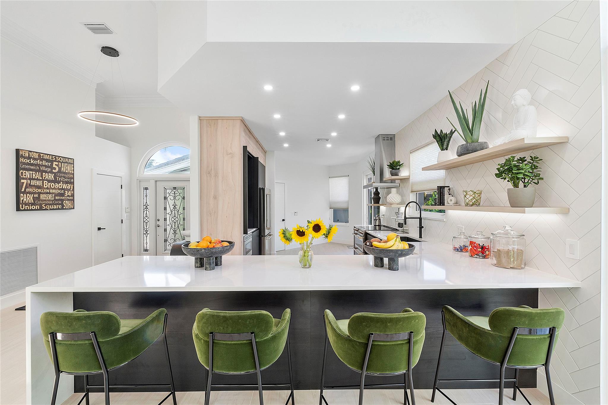 Stunningly updated home in the sought-after, gated community of The Palms at Boca Pointe,offers luxury, comfort, and modern elegance! Step inside to find brand-new wood-toned tile flooring, crown molding in the main living areas and primary suite,completely redesigned kitchen with custom cabinetry, new appliances, gorgeous countertops, and an oversized peninsula with seating for four! The primary suite boasts custom bathroom cabinetry, and oversized shower. New landscaping in the front and backyard,hurricane impact windows and doors throughout plus a brand new flat roof,all-new turf, travertine pavers,a custom putting green with three holes! Located in a low-HOA community with optional country club membership,this home is perfect for those seeking a luxury lifestyle without the commitment.