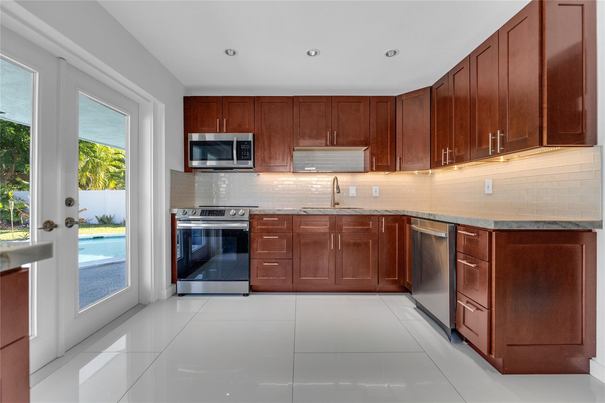 Fall in love with this CHARMING home in Royal Palm Acres; Be impressed by its spectacular kitchen with stainless steel appliances, quartz countertops, plenty of cabinets making it perfect for meals preparation; This house also features a new roof, IMPACT windows, French doors, trendy floors, a refreshing swimming pool/tropical landscape, a perfect ambience for entertaining guests. This home has a split bedroom's layout with a nicely renovated bathroom. The third bedroom is currently used as a day room/laundry room with a full-size washer & dryer. Enjoy plenty of natural light & its openness AND that it's close to shopping & dining, parks, schools, major highways, airport, 15 minutes to the beach & Fort Lauderdale downtown area. See it today, buy soon, & start Loving your Florida Living.